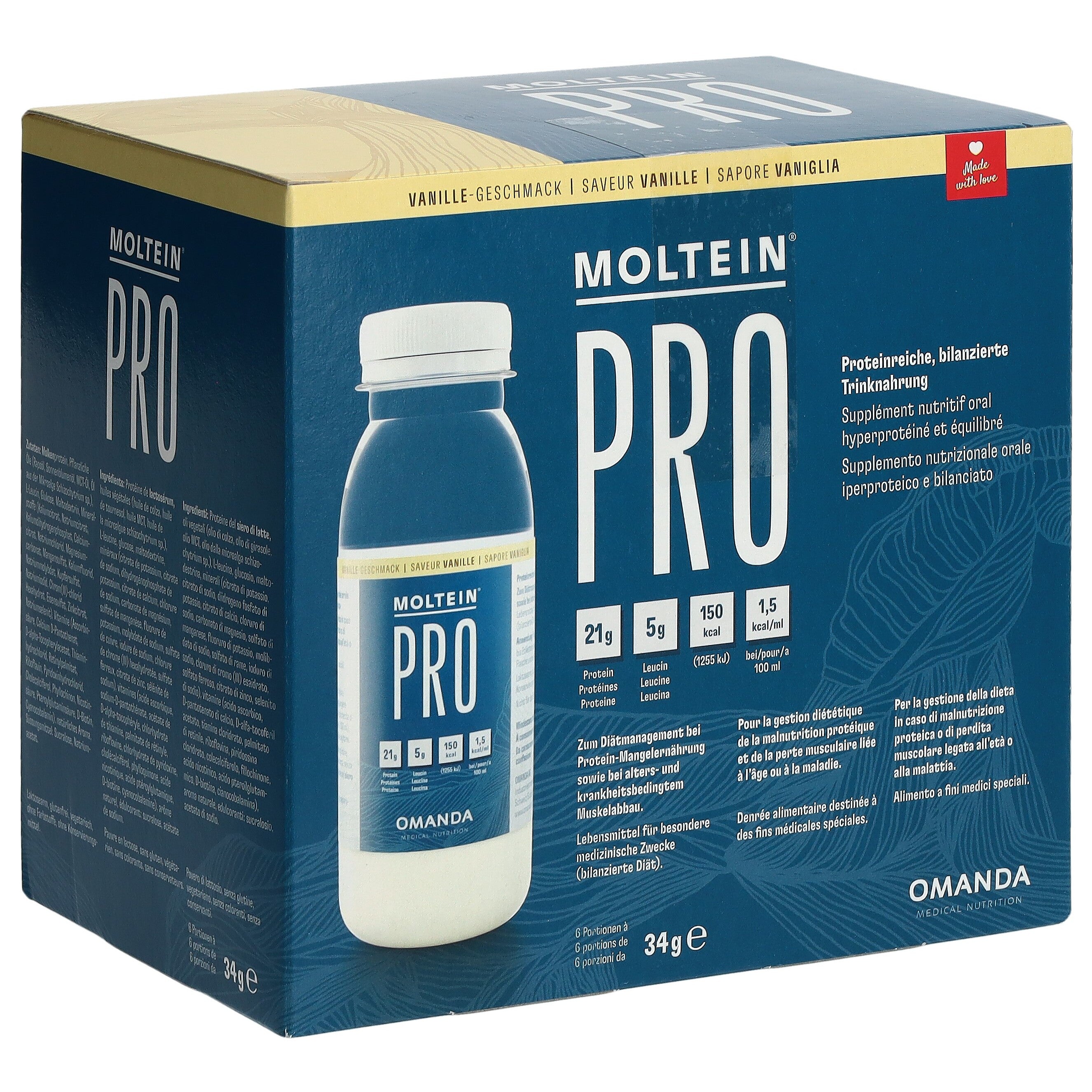 Moltein PRO ist eine proteinreiche, kalorische, bilanzierte Trinknahrung.