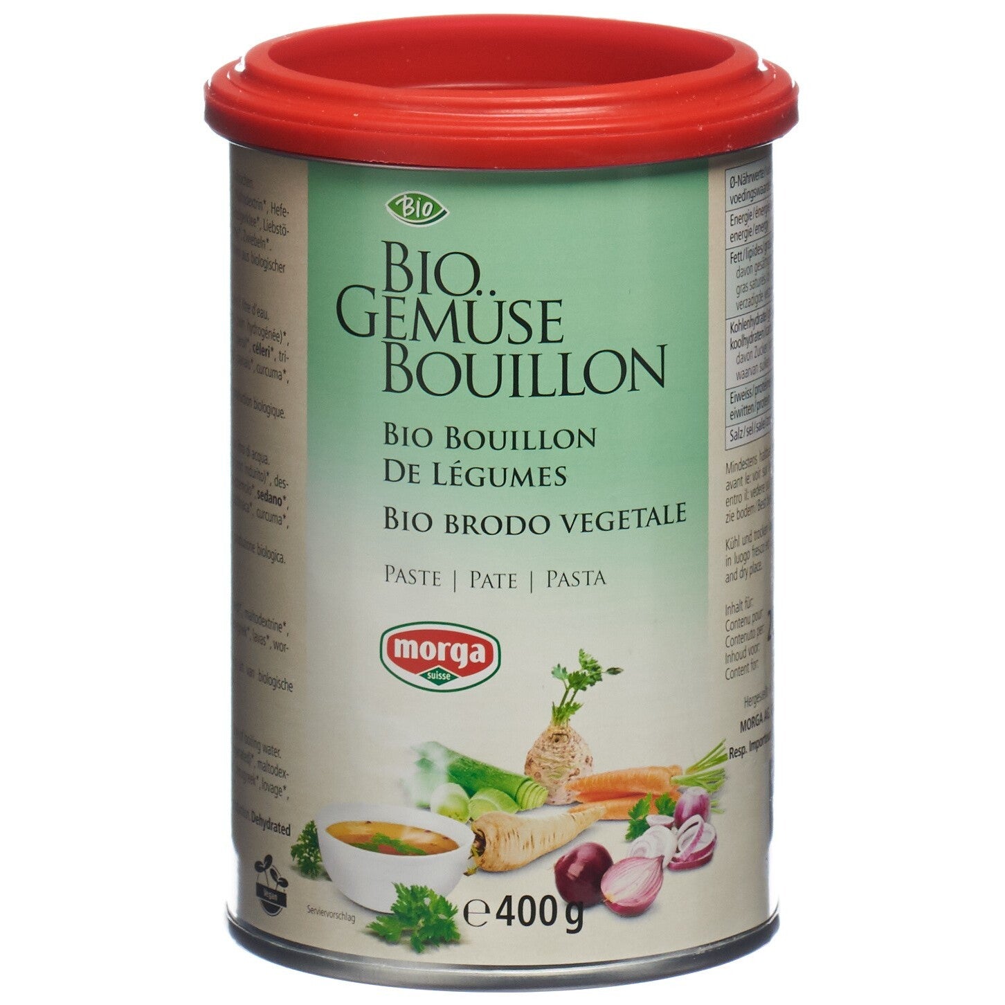 Bio Gemüse Bouillon. Zubereitung: 20 g Paste in 1 Liter Wasser aufkochen. Glutenfrei.