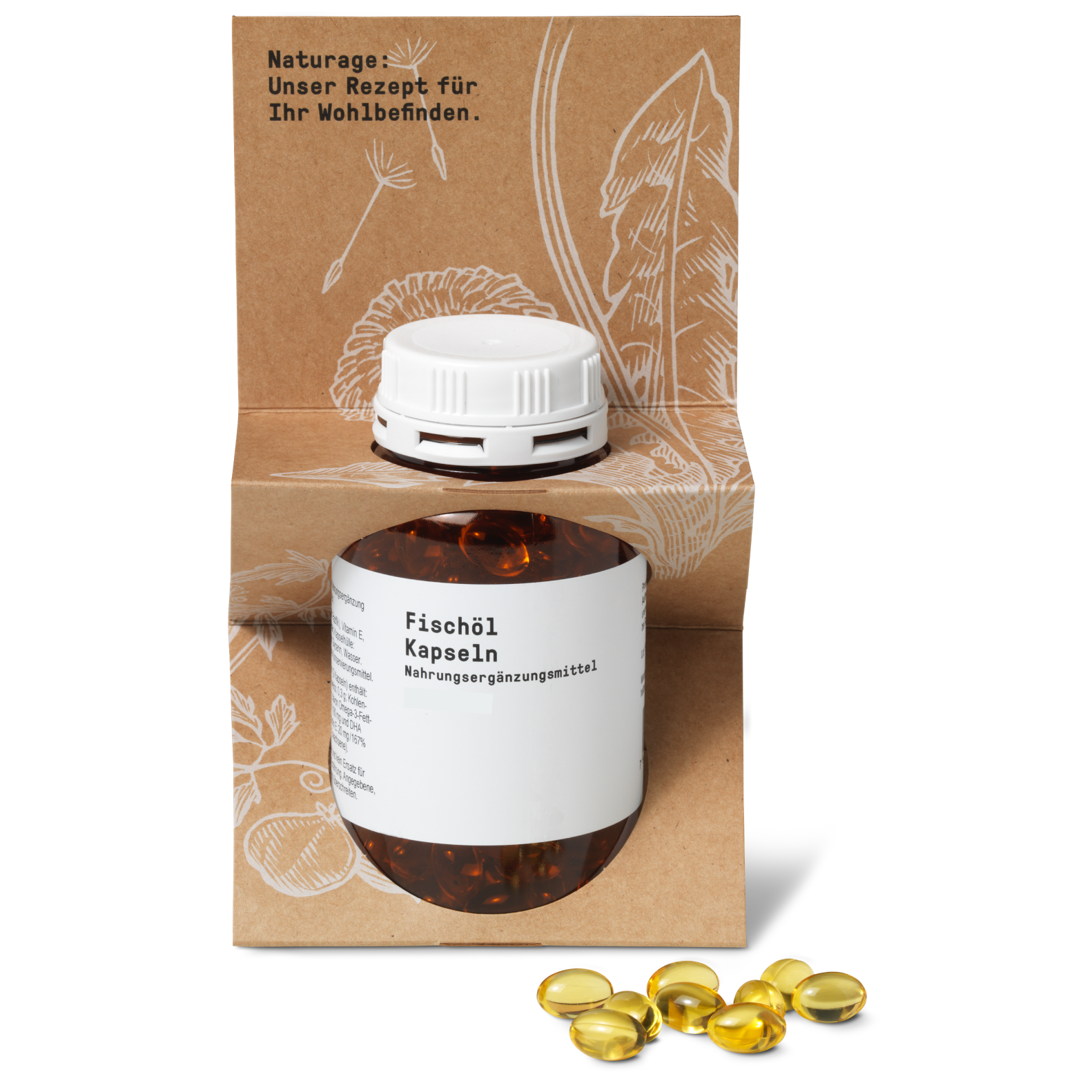 Fischöl Kapseln enthalten durch ein physikalisches Verfahren gewonnenes Öl aus den Fischarten Sardine, Anchovis, Hering und Makrele, in Kombination mit Vitamin E natürlichen Ursprungs. Fischöl ist eine Quelle von ungesättigten Fettsäuren der Omega-3-Gruppe mit deren Vertreter EPA (Eicosapentaensäure) und DHA (Docosahexaensäure).