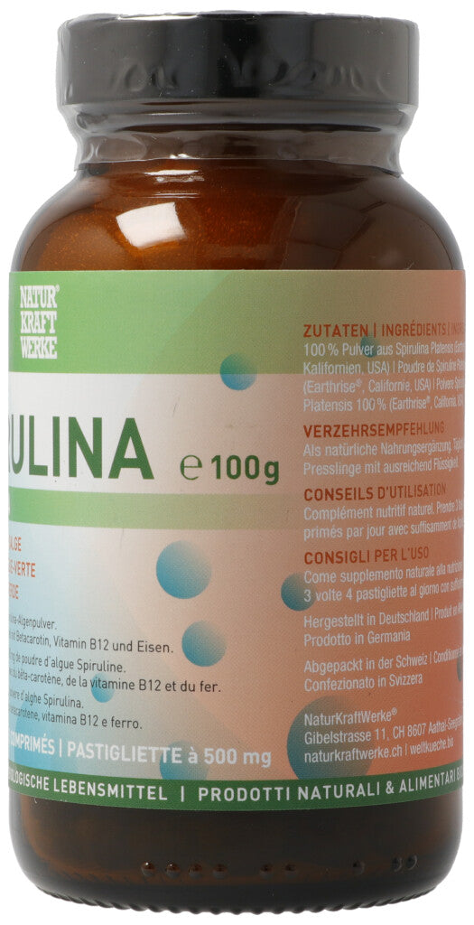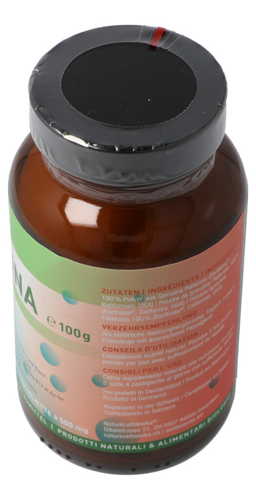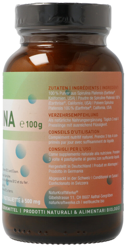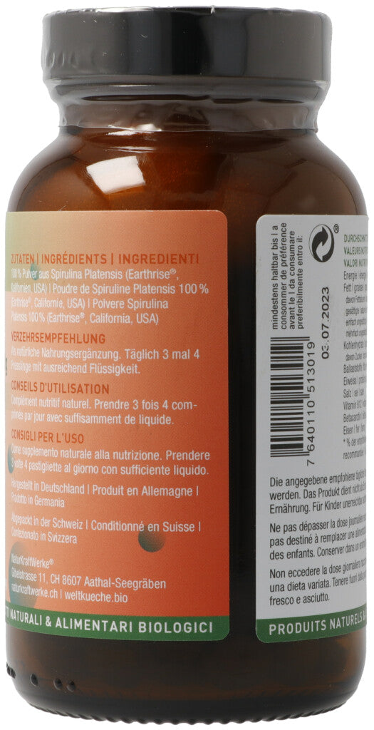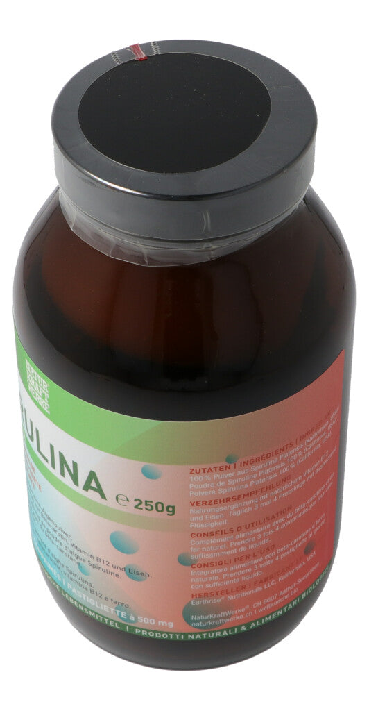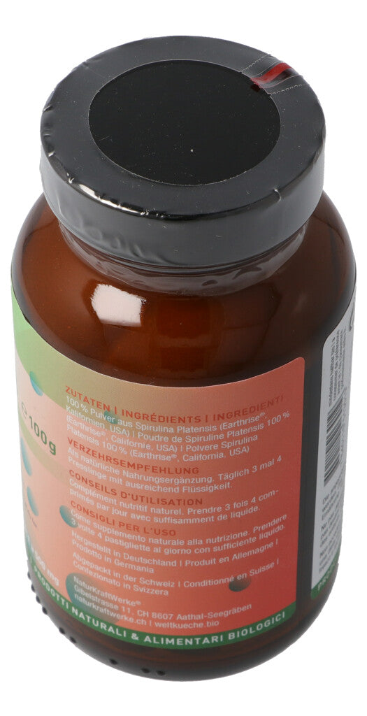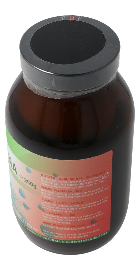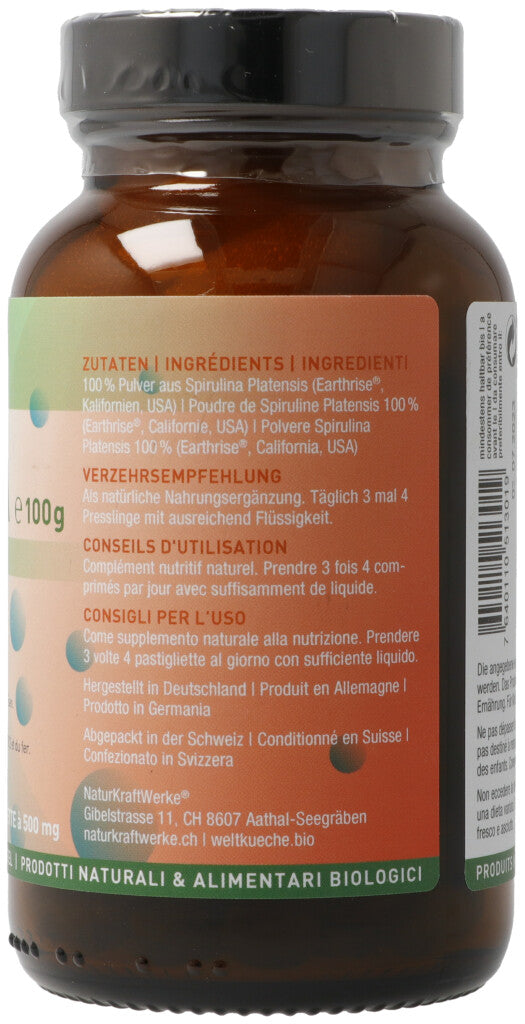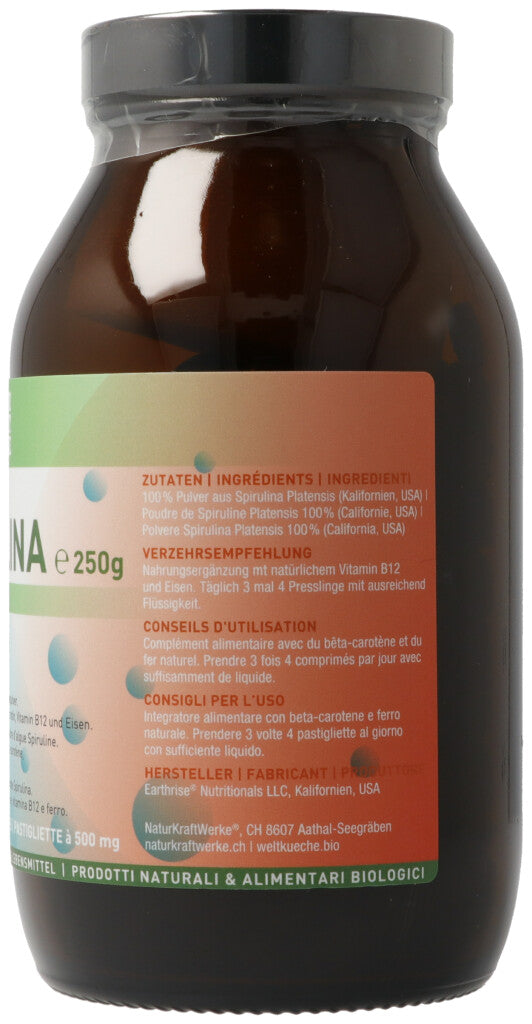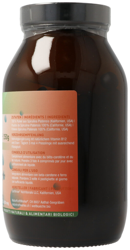 100% Pulver aus Spirulina Platensis (Earthrise, Kalifornien, USA). 1 Pressling enthält 500 mg Spirulina-Algenpulver..