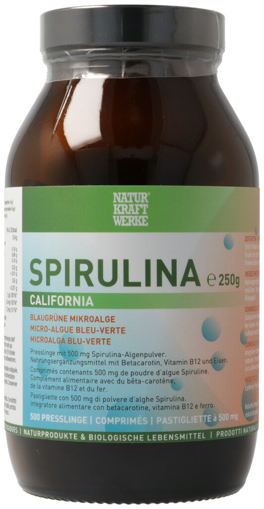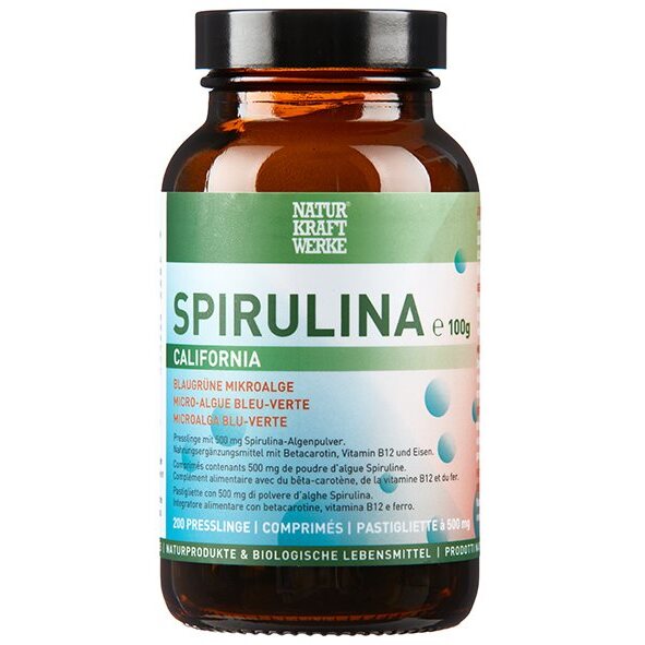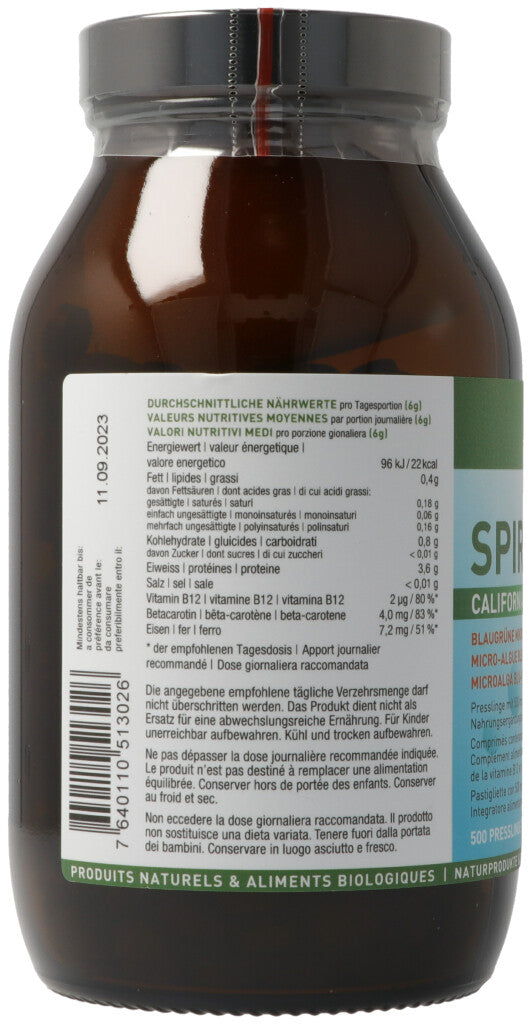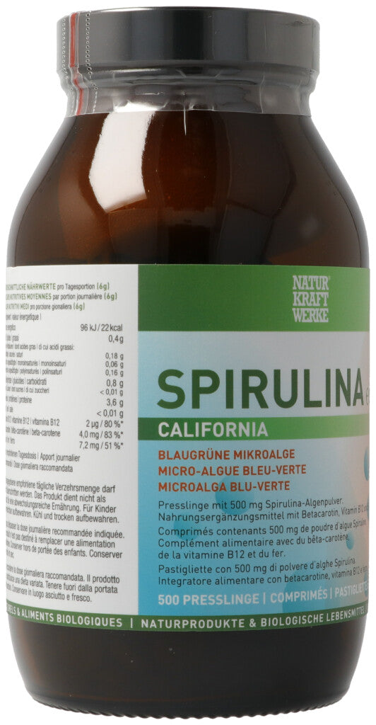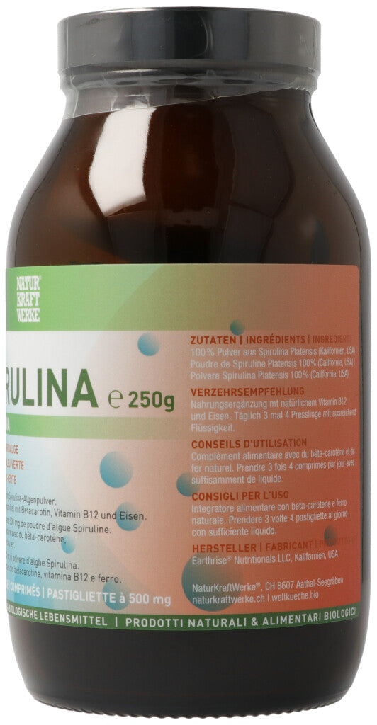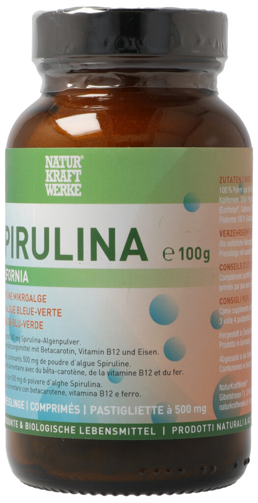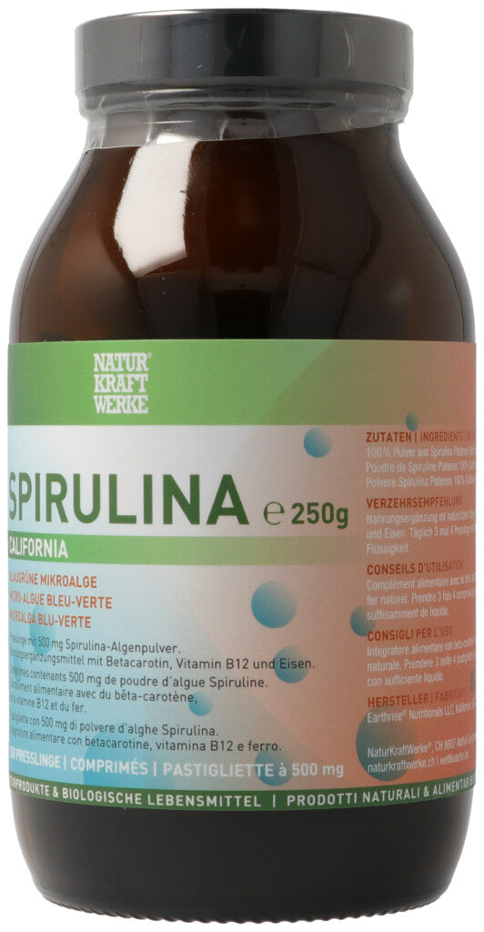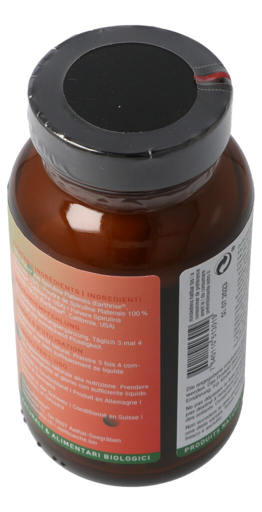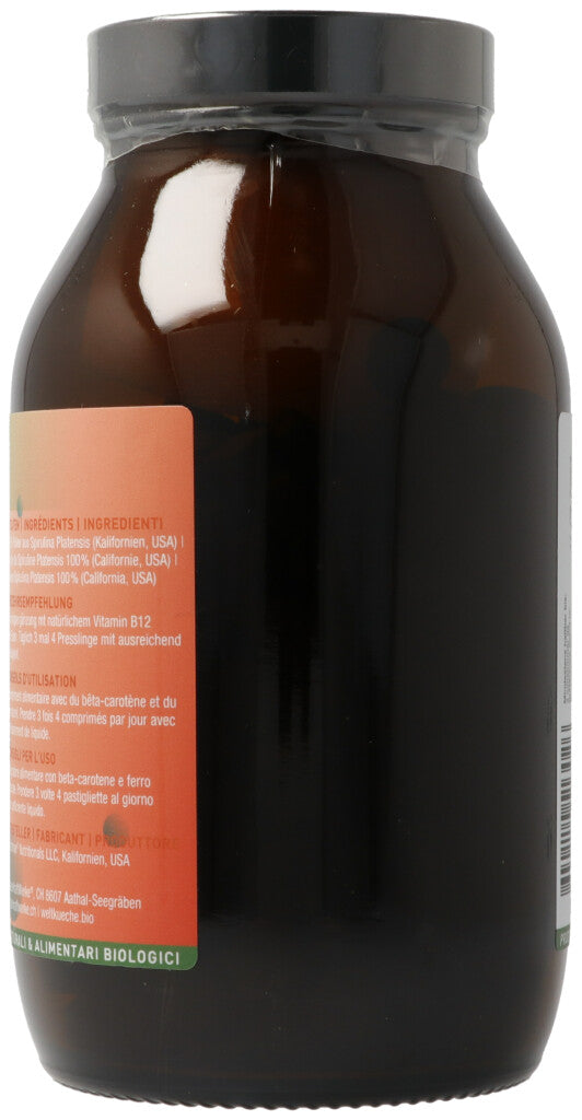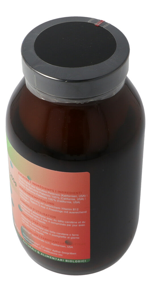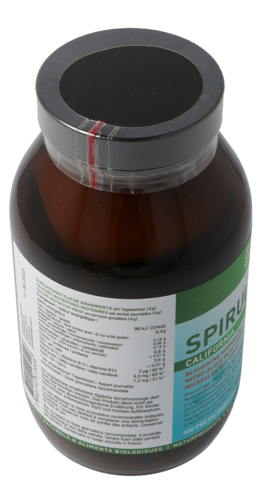 100% Pulver aus Spirulina Platensis (Earthrise, Kalifornien, USA). 1 Pressling enthält 500 mg Spirulina-Algenpulver..