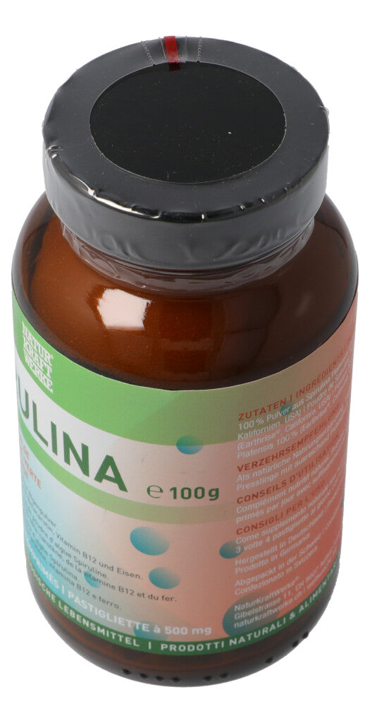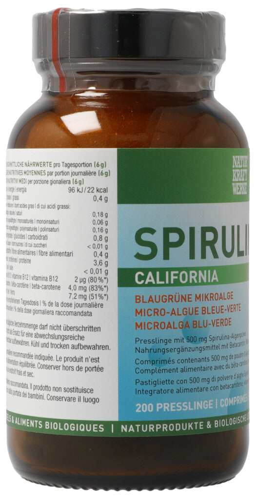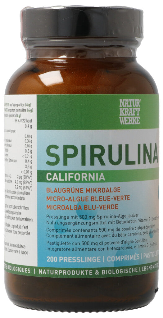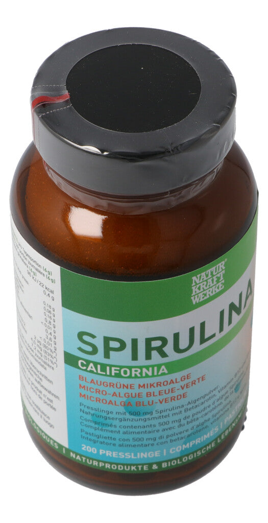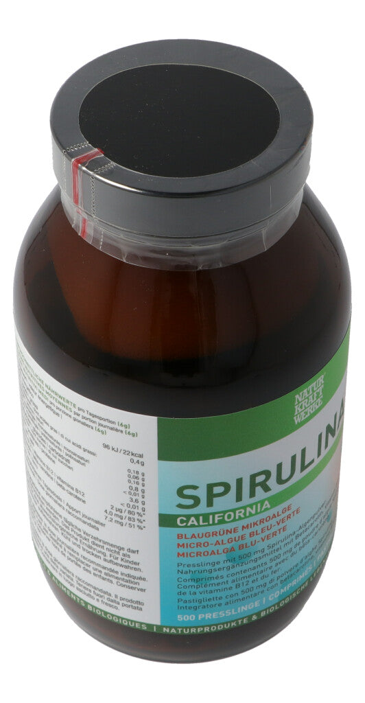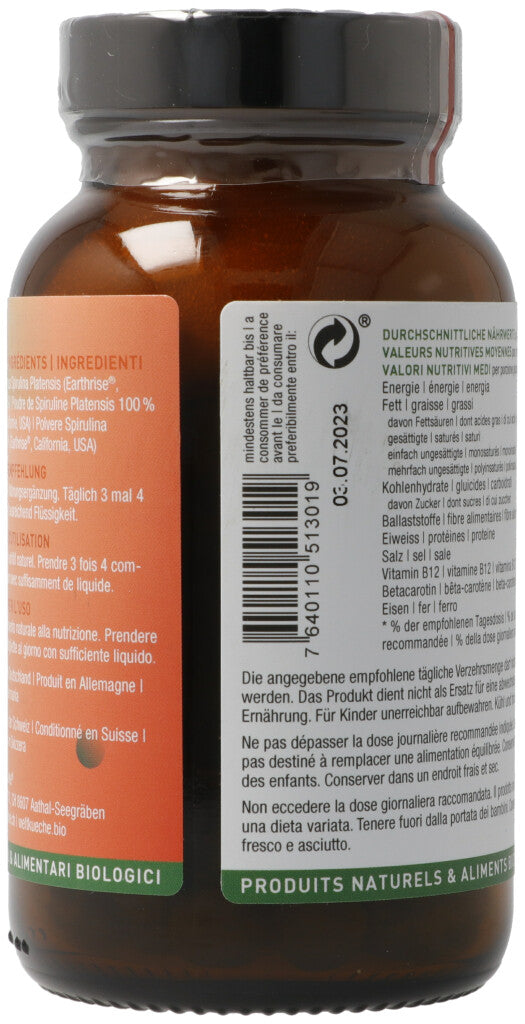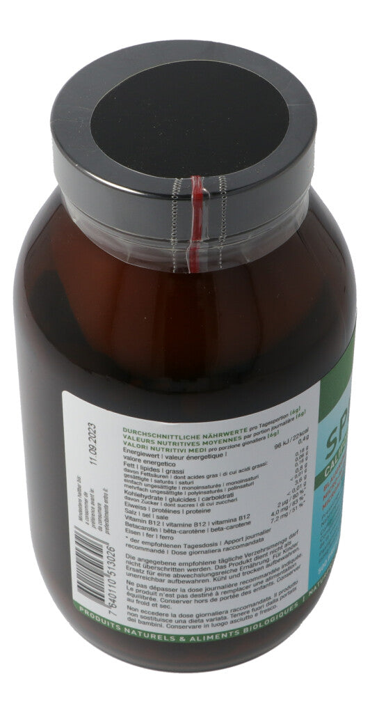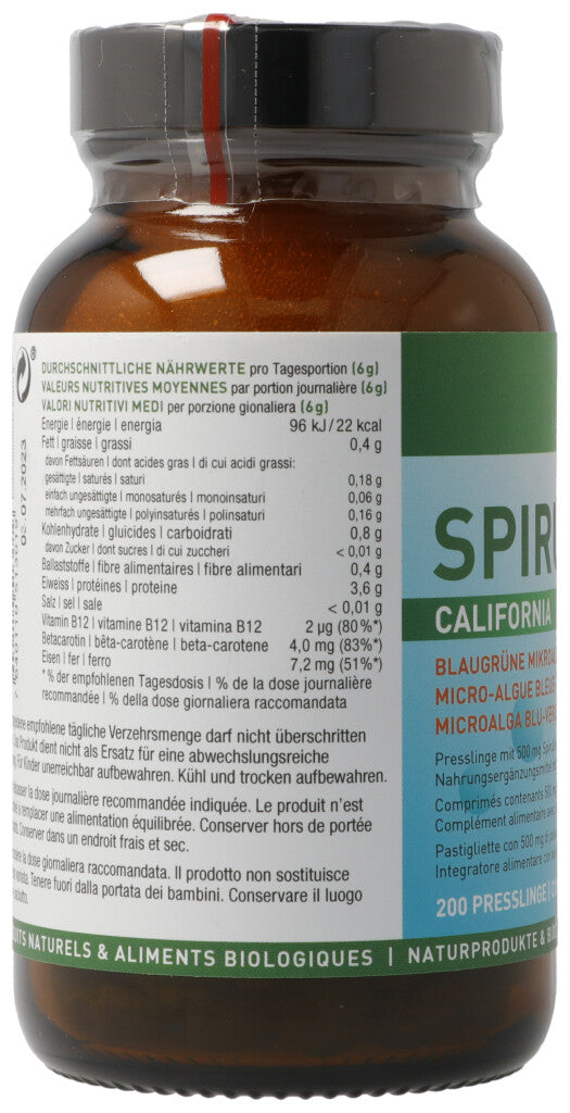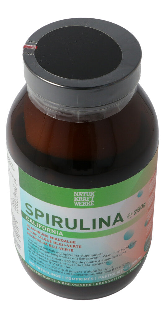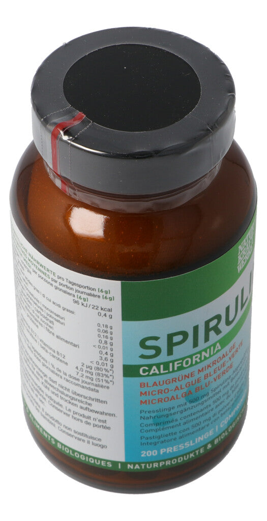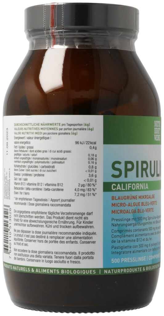 100% Pulver aus Spirulina Platensis (Earthrise, Kalifornien, USA). 1 Pressling enthält 500 mg Spirulina-Algenpulver..