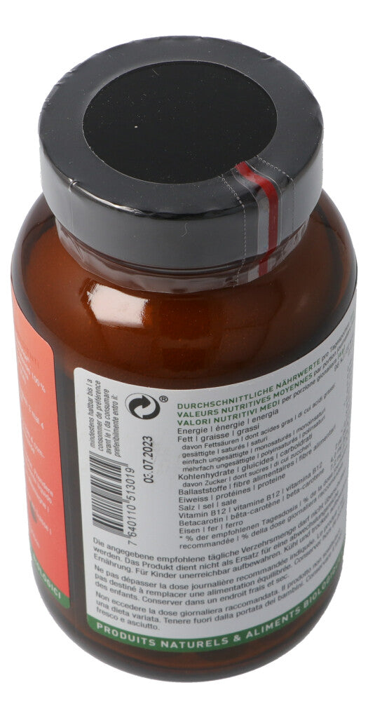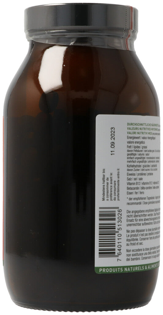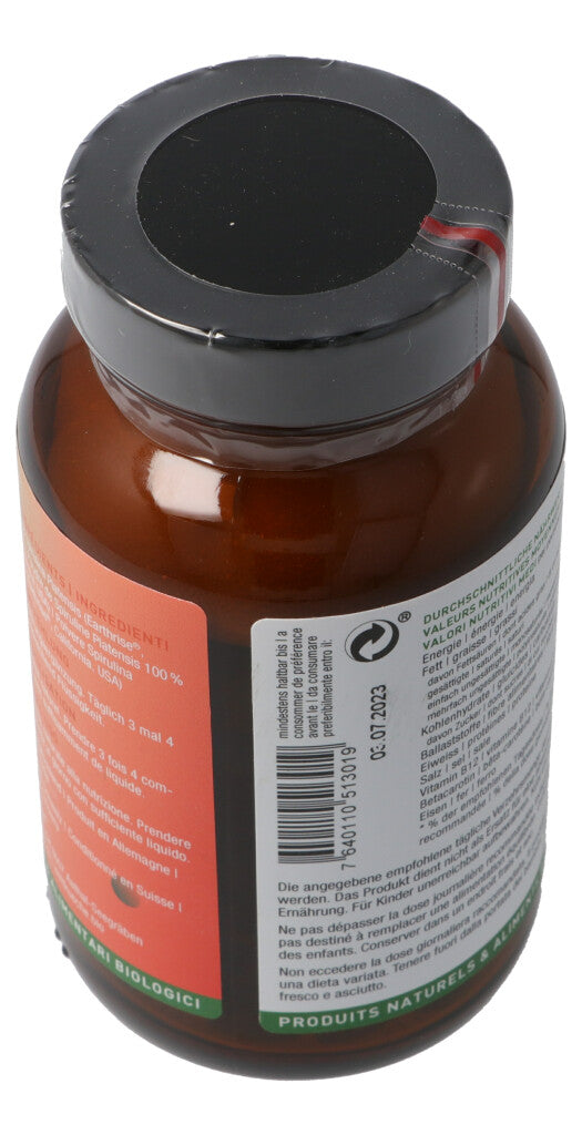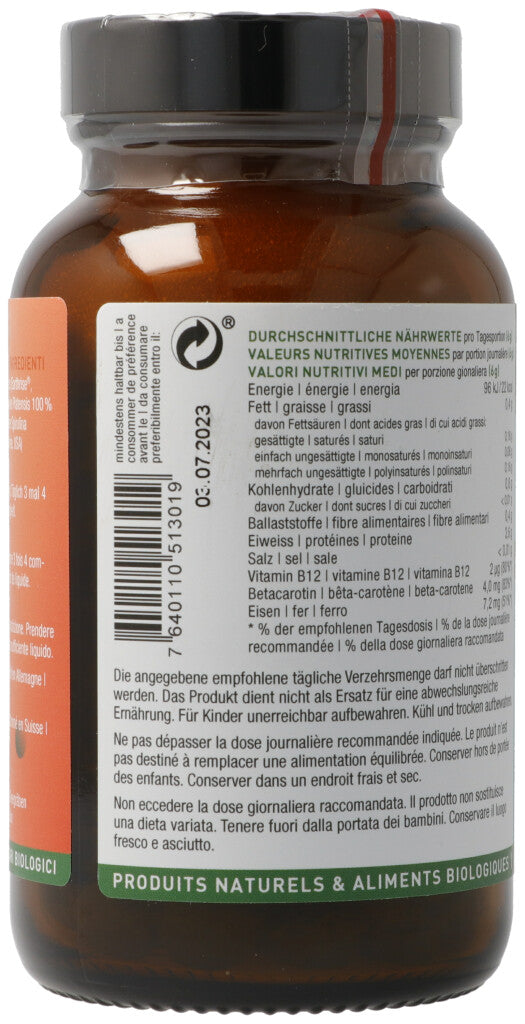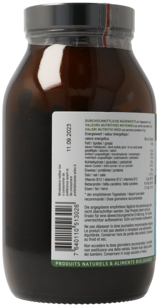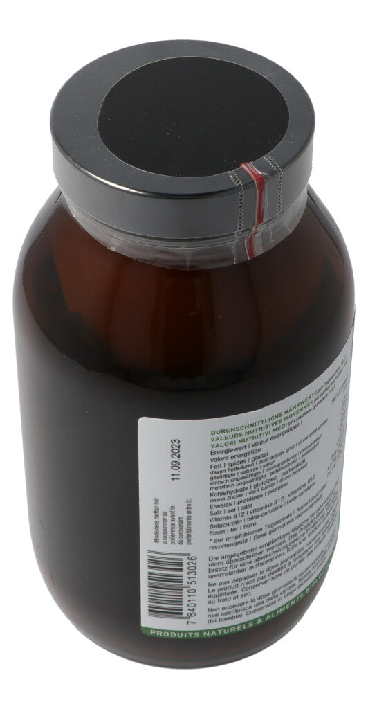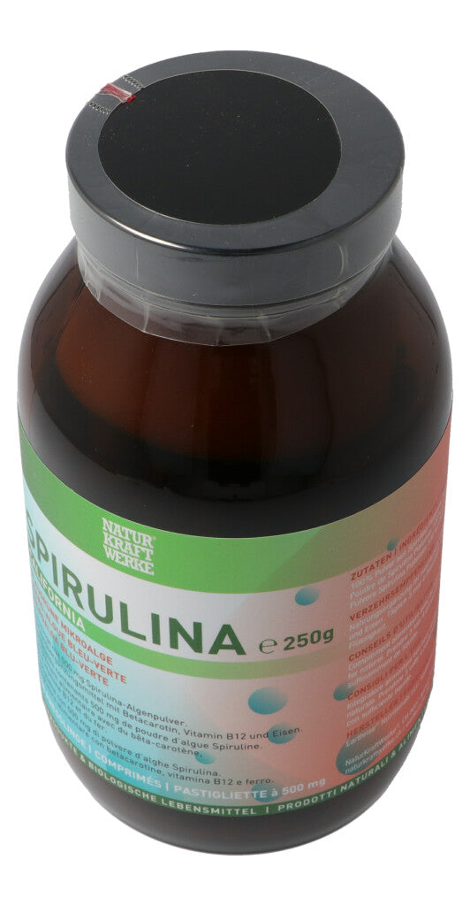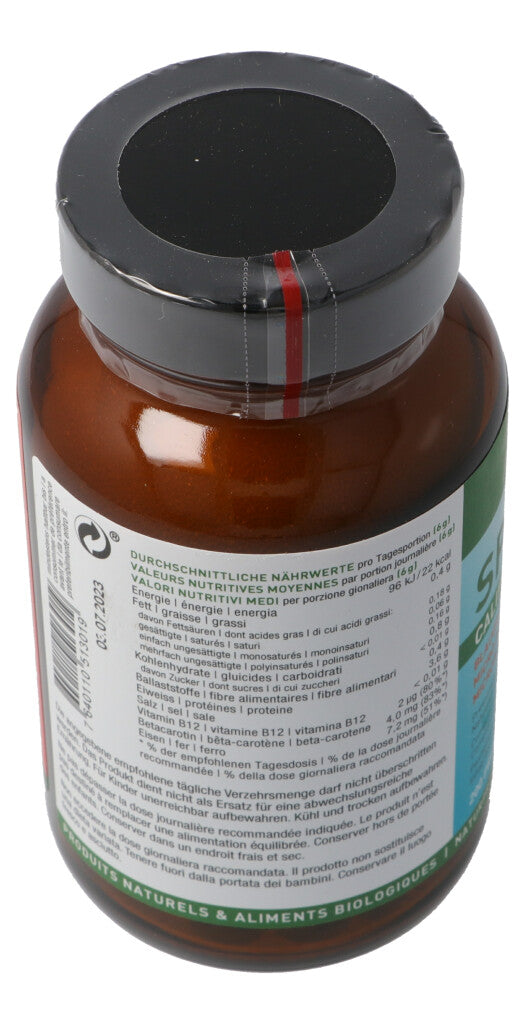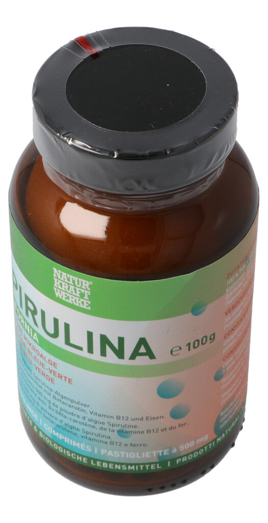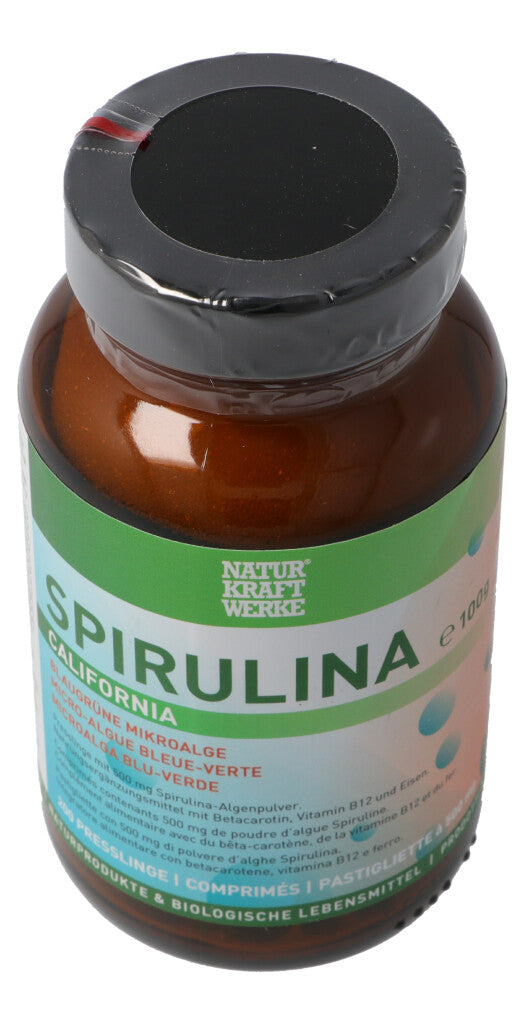 100% Pulver aus Spirulina Platensis (Earthrise, Kalifornien, USA). 1 Pressling enthält 500 mg Spirulina-Algenpulver..