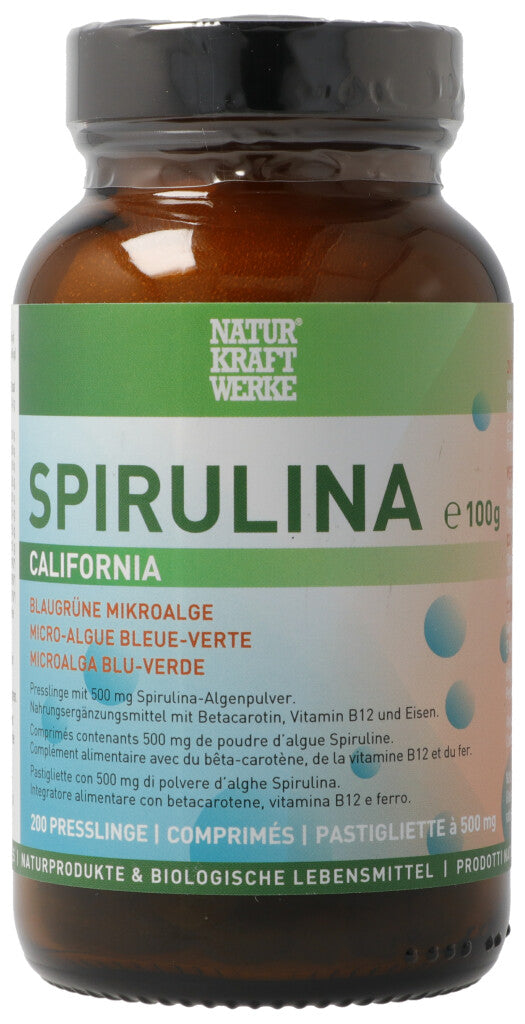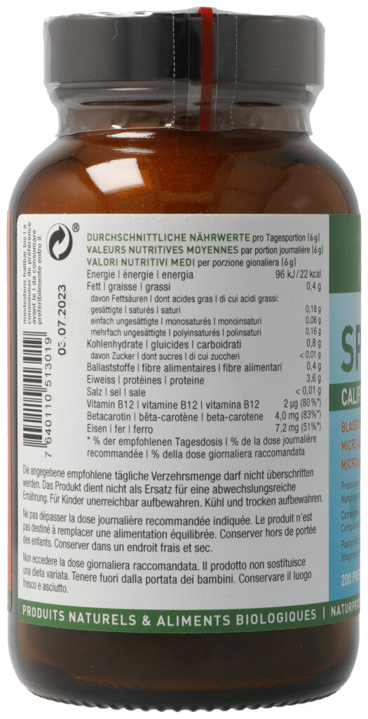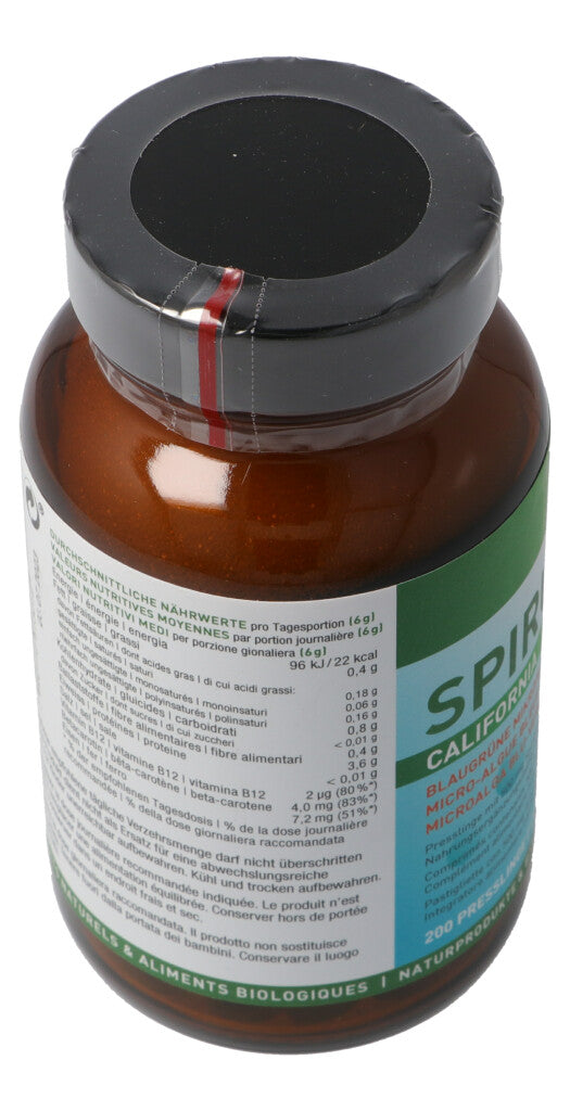 Spirulina California ist eine Blaugrüne Mikroalge, ein natürliches Nahrungsergänzungsmittel und bewährt sich als rein pflanzlicher Spender von: