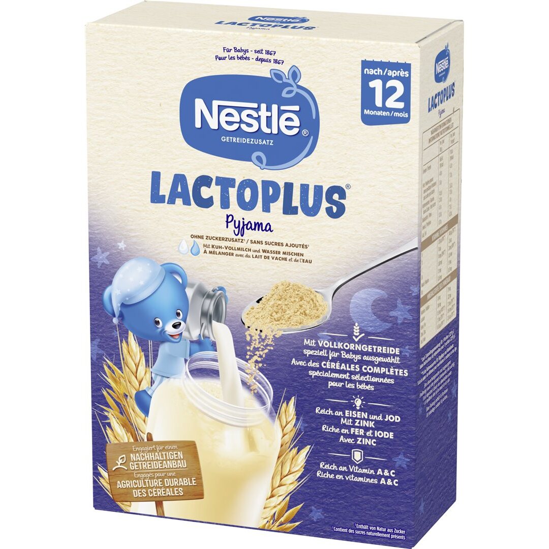Nestlé Lactoplus wurde entwickelt, um den Nährstoffgehalt der Kuhmilch zu ergänzen, sobald diese als Beikost in die Babynahrung eingeführt wird. Die Sorte Pyjama wird aus Vollkorngetreide hergestellt, das speziell für Babys ausgewählt wurde. Eine Portion enthält Zink, ist reich an Eisen, Jod, Vitamin A und C und auch ohne Zuckerzusatz* und ohne Palmöl.