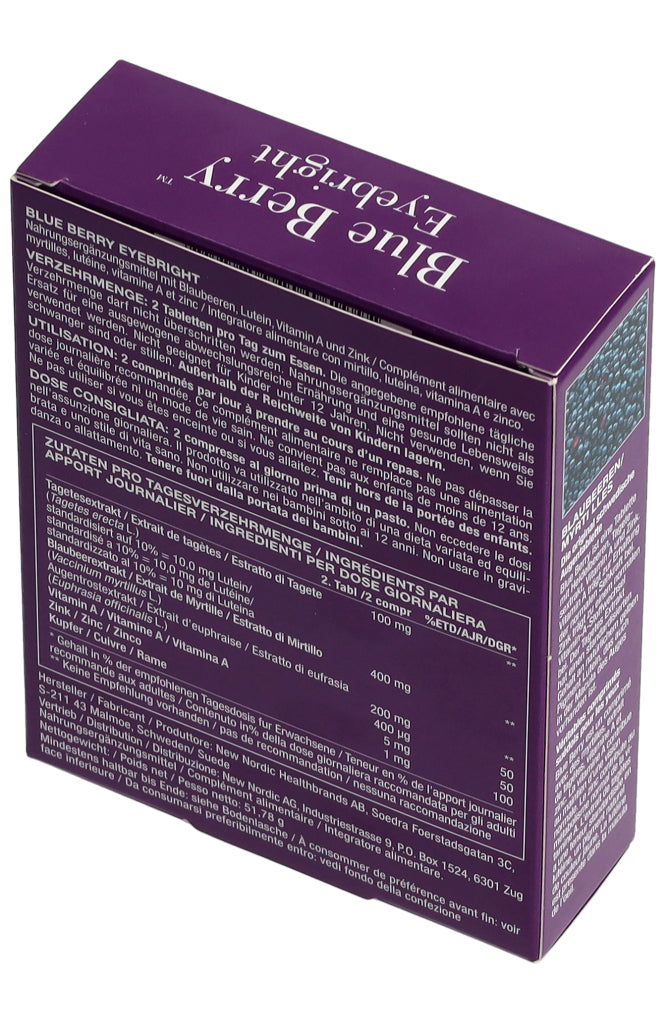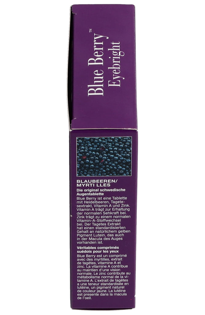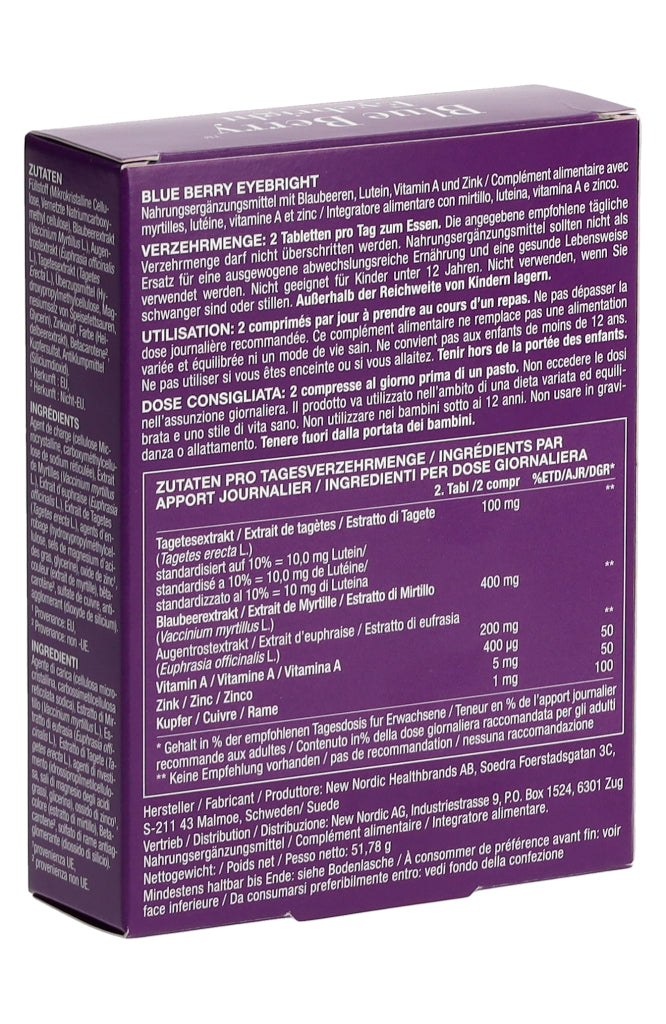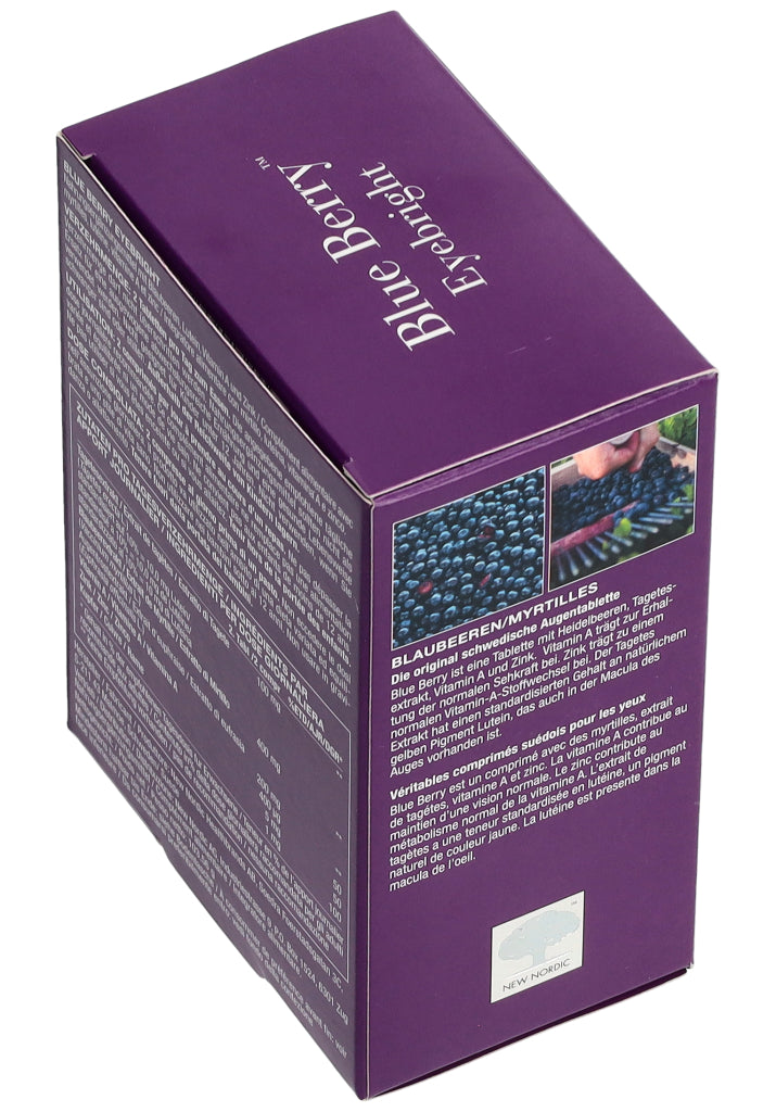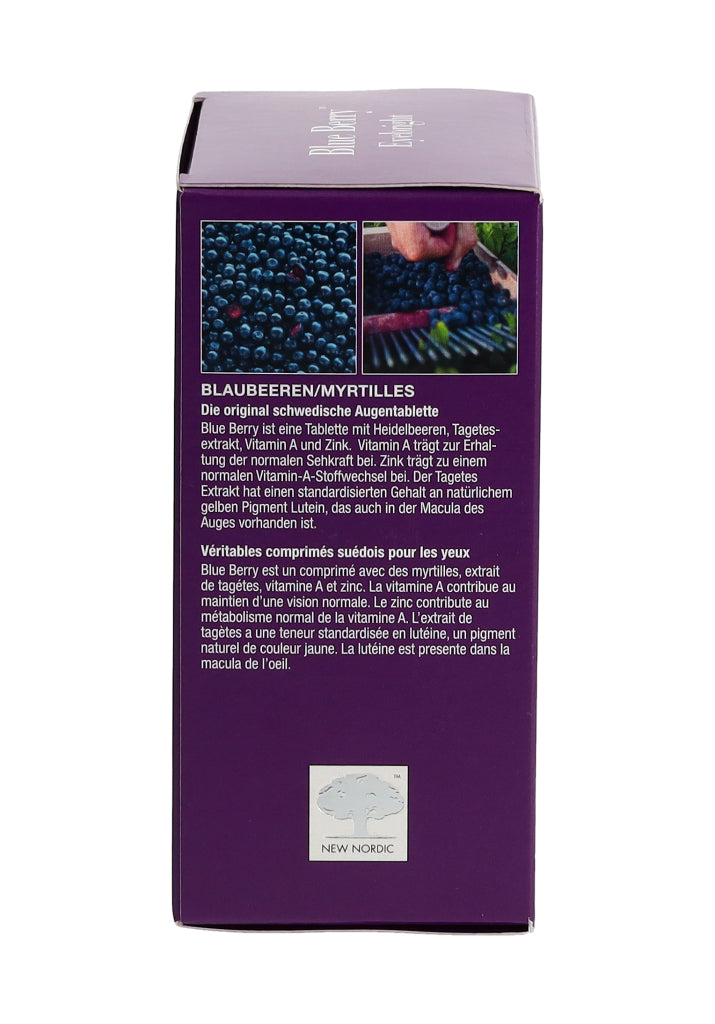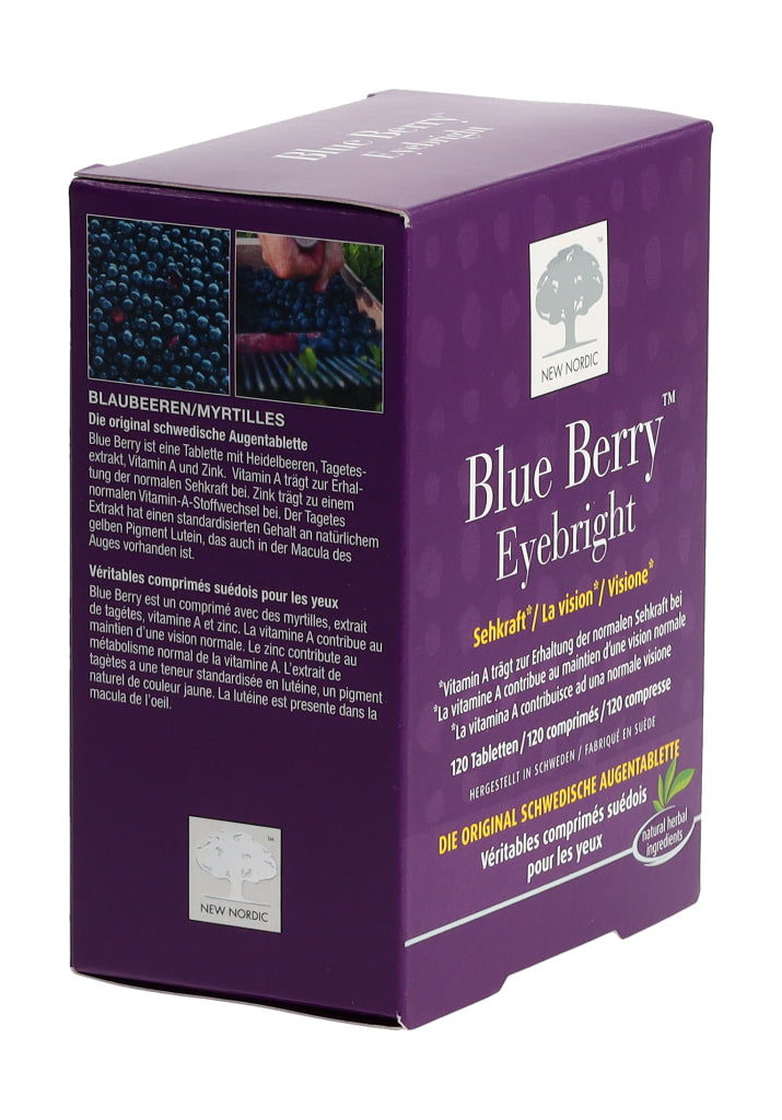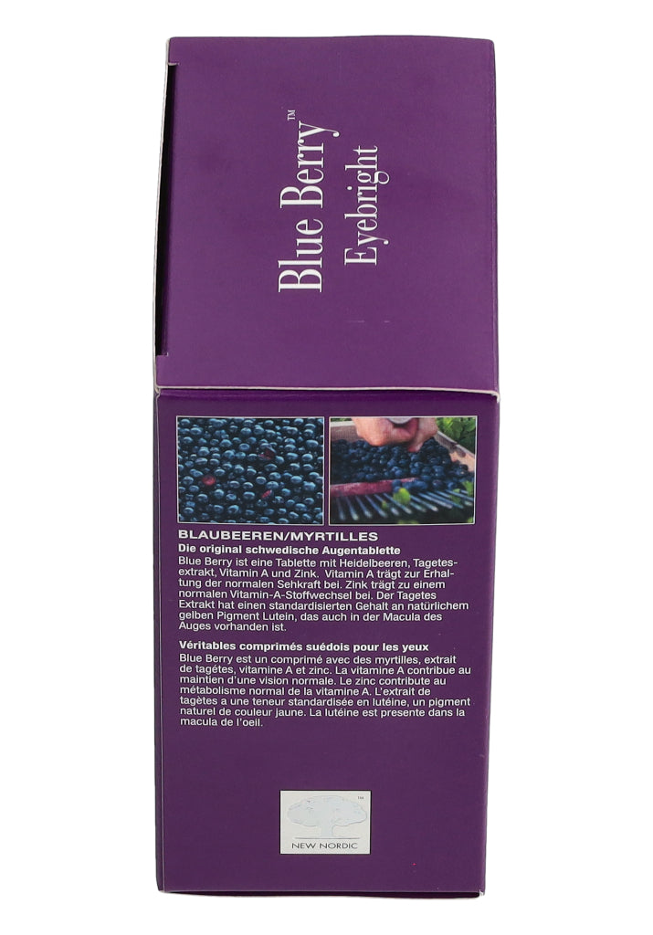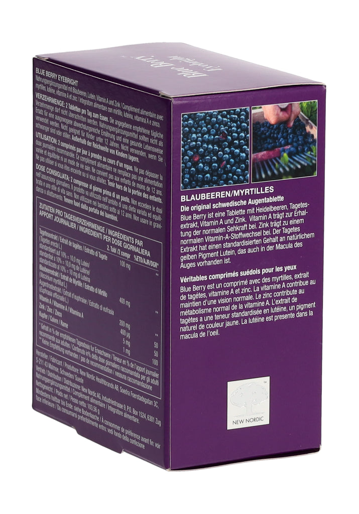 Die originale schwedische Sehkraft Tablette. Blue Berry ist eine Tablette mit Heidelbeeren, Tagetesextrakt, Vitamin A und Zink. Vitamin A trägt zur Erhaltung der normalen Sehkraft bei. Zink trägt zu einem normalen Vitamin-Stoffwechsel bei. Der Tagetes Extrakt hat einen standardisierten Gehalt an natürlichem gelben Pigment Lutein, das auch in der Macula des Auges vorhanden ist.