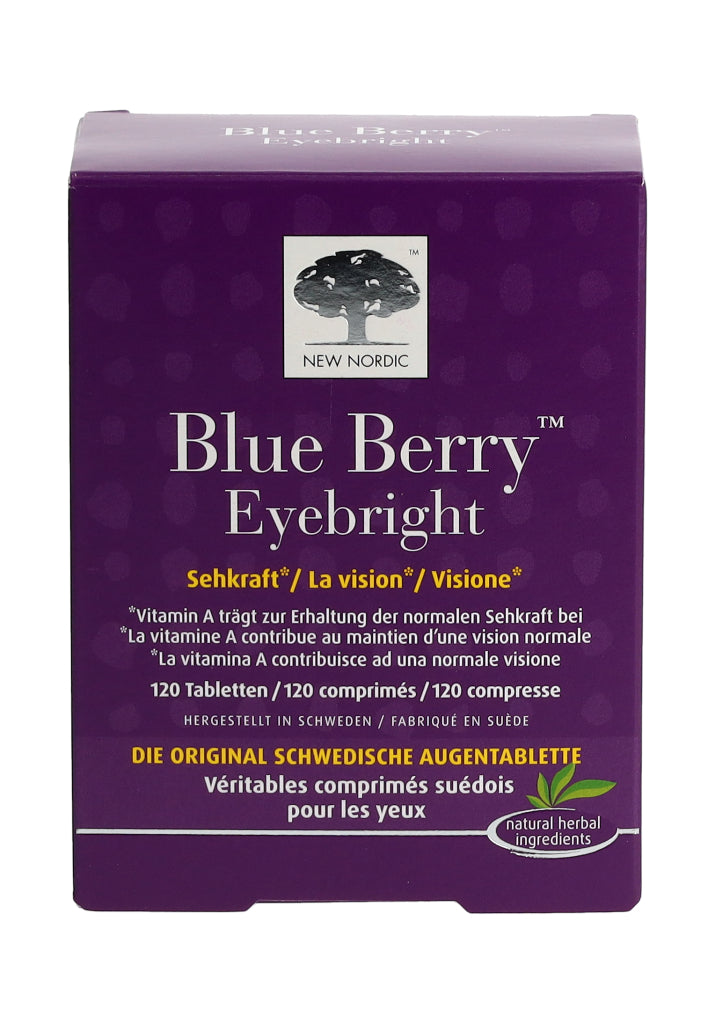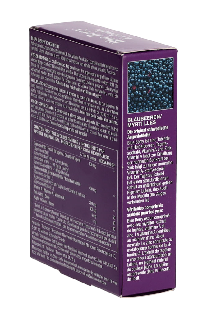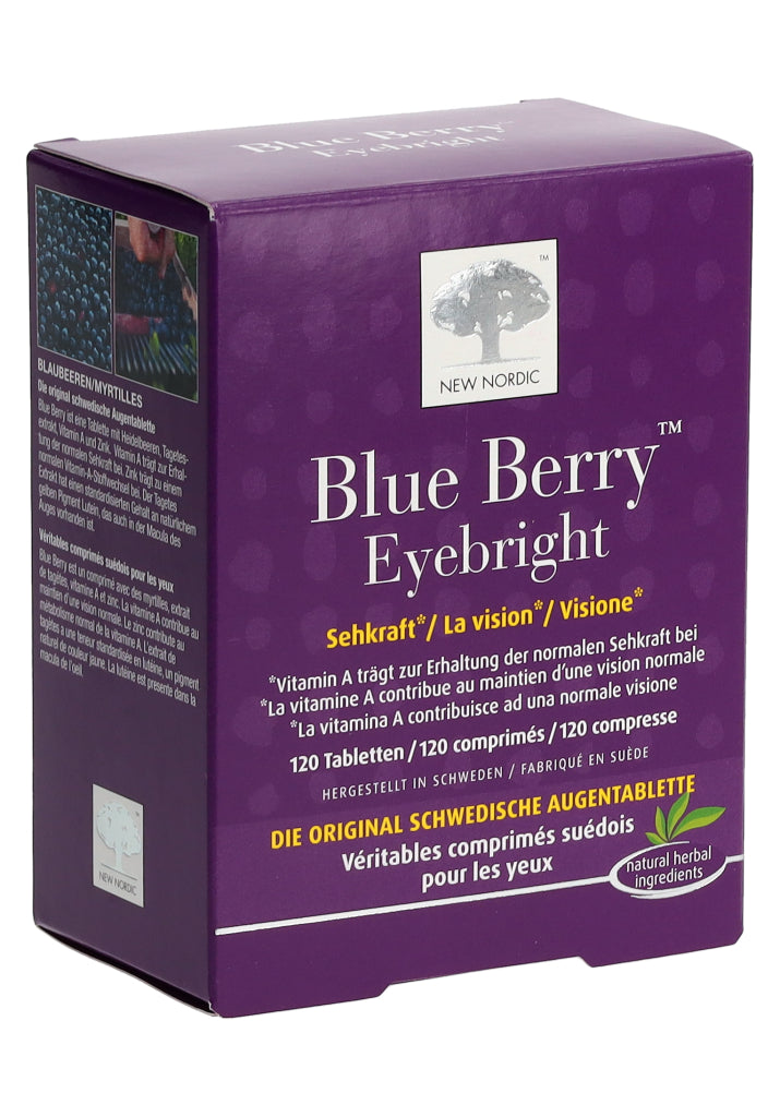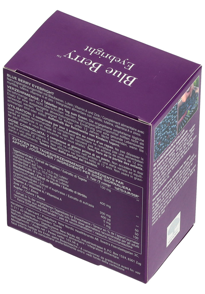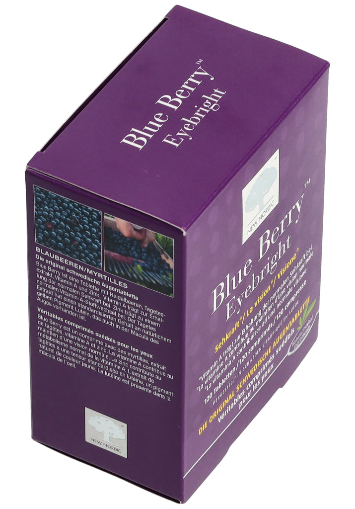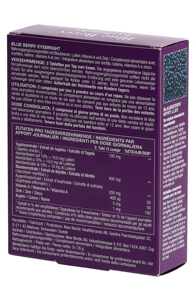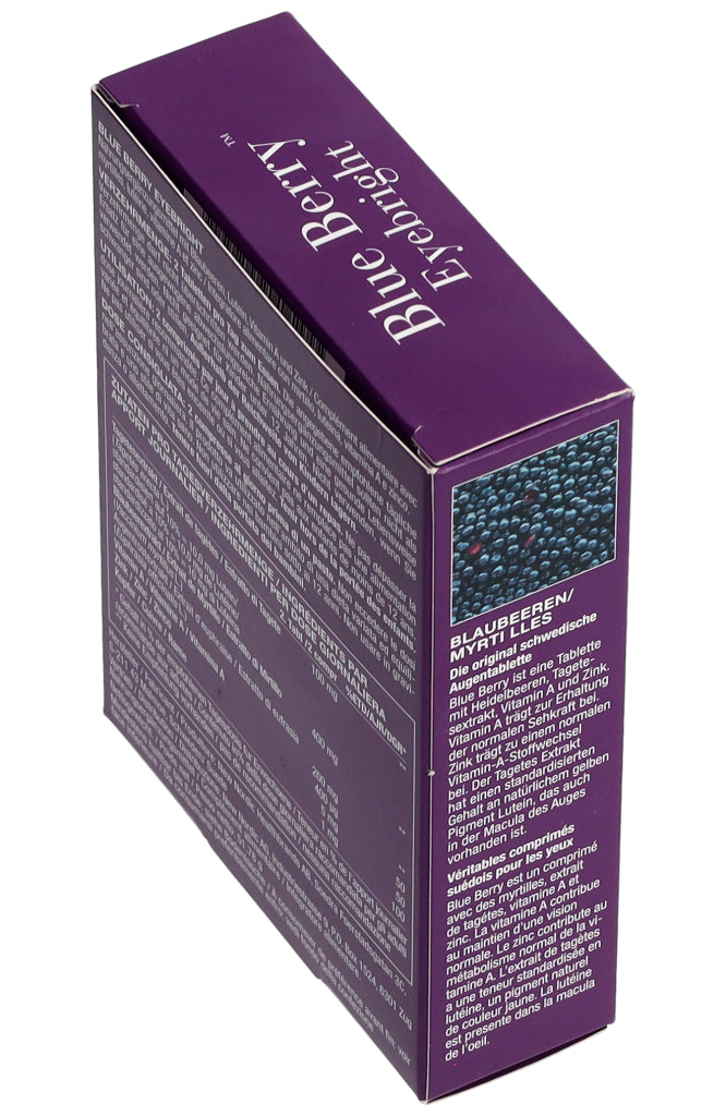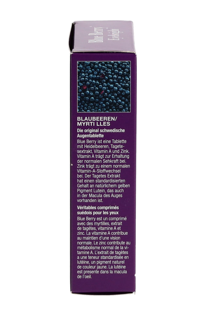 Die originale schwedische Sehkraft Tablette. Blue Berry ist eine Tablette mit Heidelbeeren, Tagetesextrakt, Vitamin A und Zink. Vitamin A trägt zur Erhaltung der normalen Sehkraft bei. Zink trägt zu einem normalen Vitamin-Stoffwechsel bei. Der Tagetes Extrakt hat einen standardisierten Gehalt an natürlichem gelben Pigment Lutein, das auch in der Macula des Auges vorhanden ist.