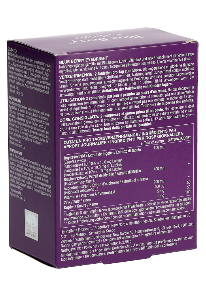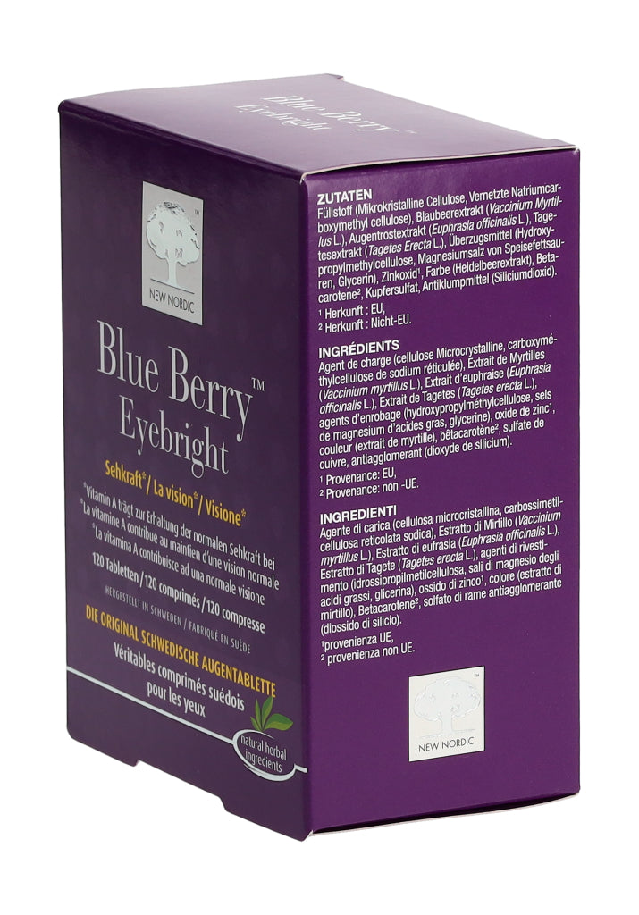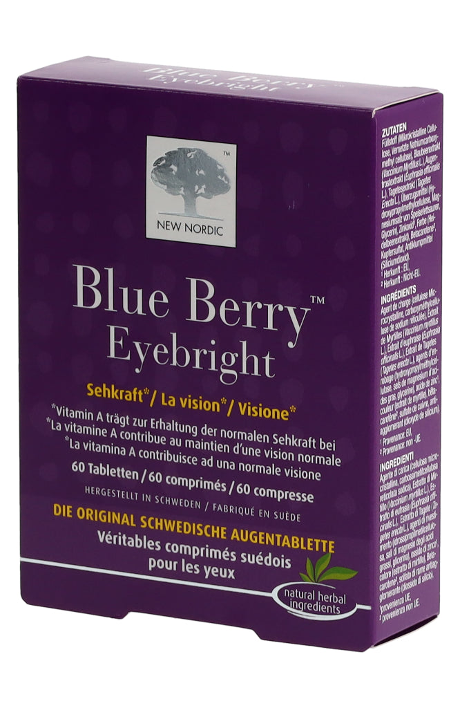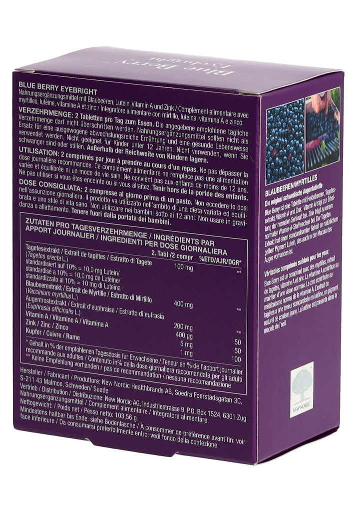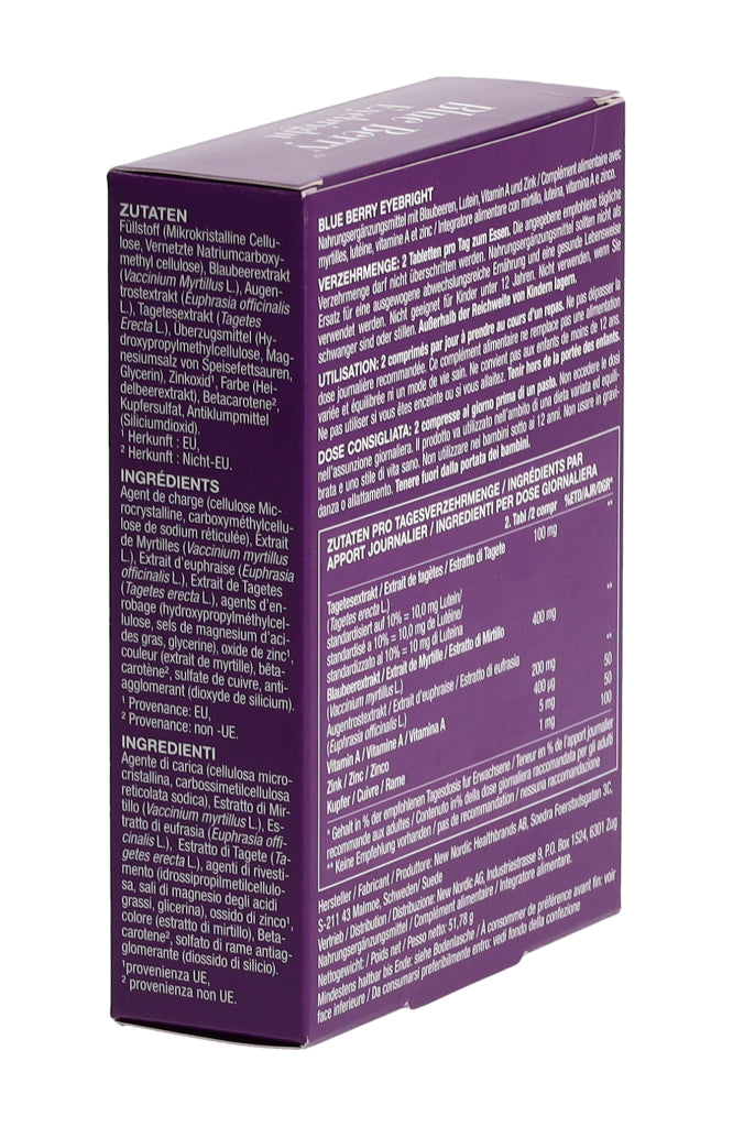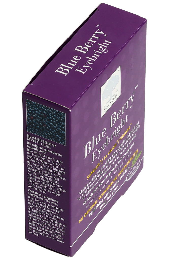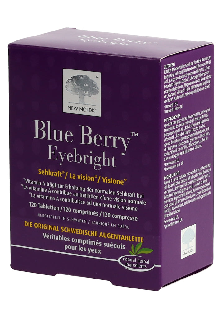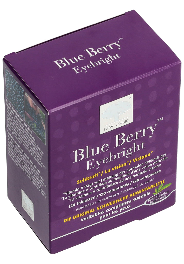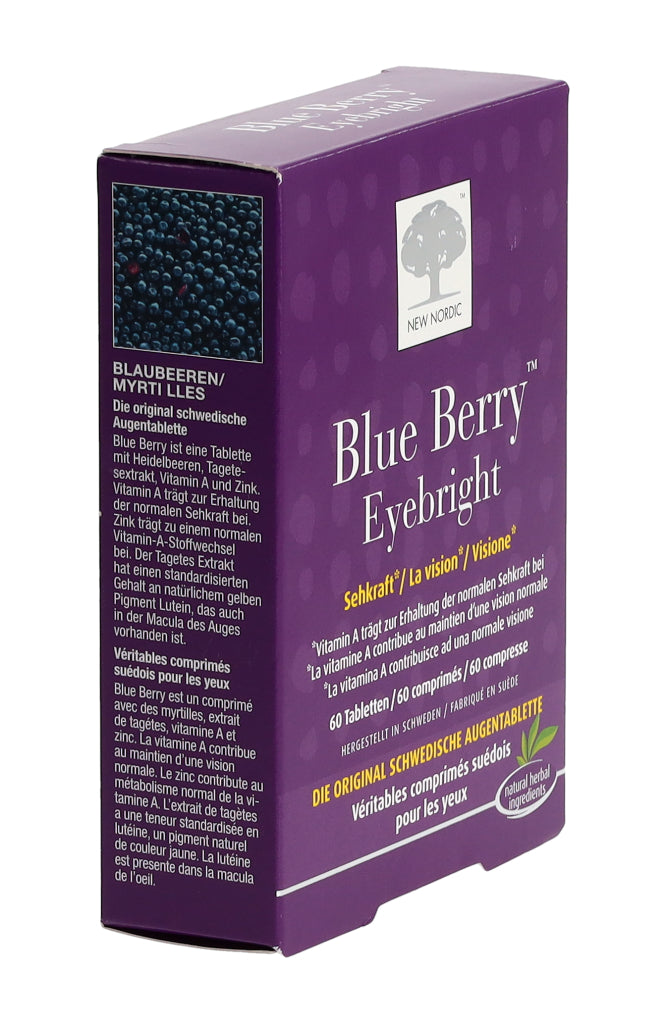 Die originale schwedische Sehkraft Tablette. Blue Berry ist eine Tablette mit Heidelbeeren, Tagetesextrakt, Vitamin A und Zink. Vitamin A trägt zur Erhaltung der normalen Sehkraft bei. Zink trägt zu einem normalen Vitamin-Stoffwechsel bei. Der Tagetes Extrakt hat einen standardisierten Gehalt an natürlichem gelben Pigment Lutein, das auch in der Macula des Auges vorhanden ist.