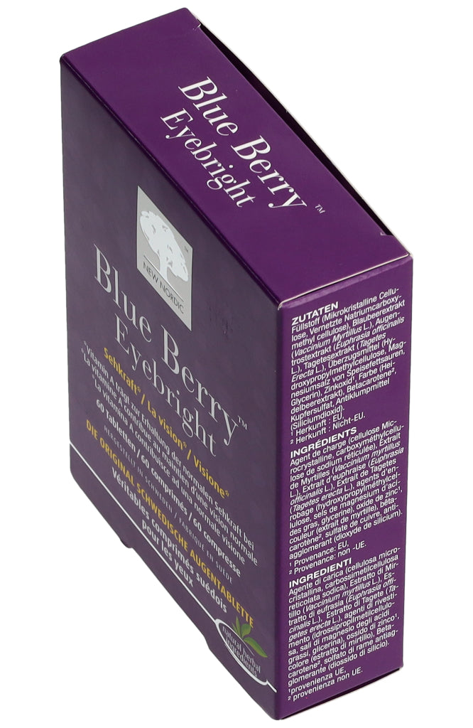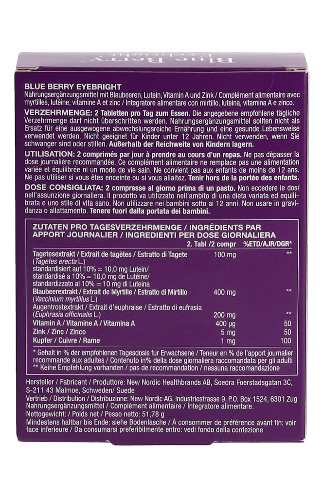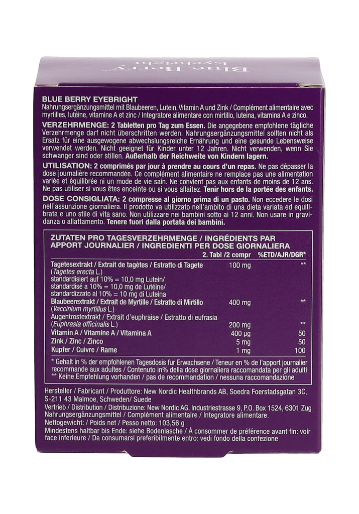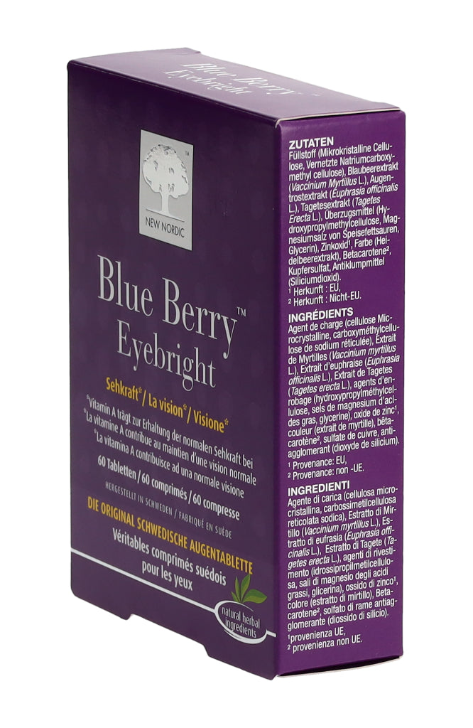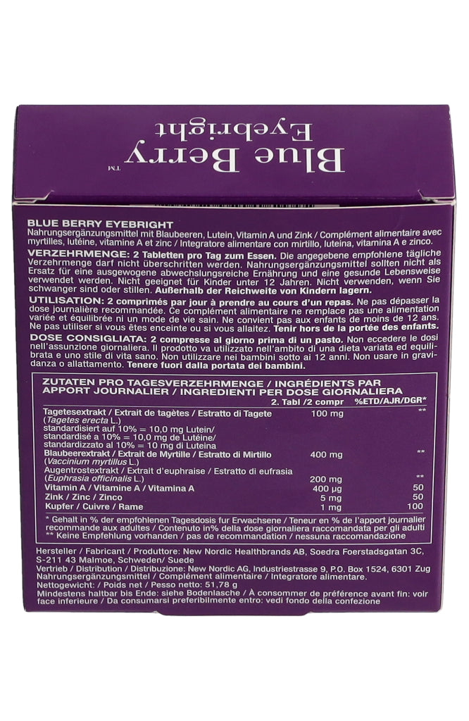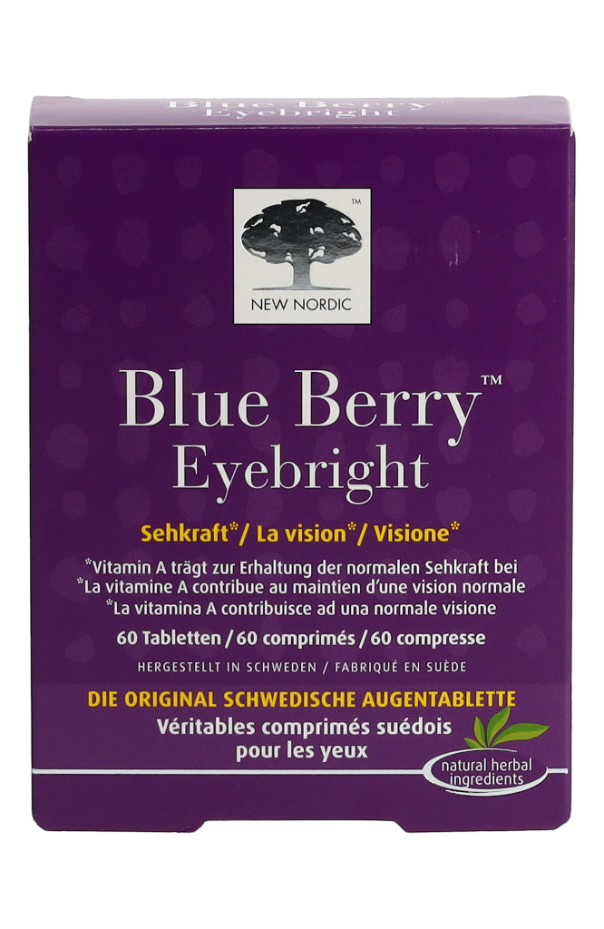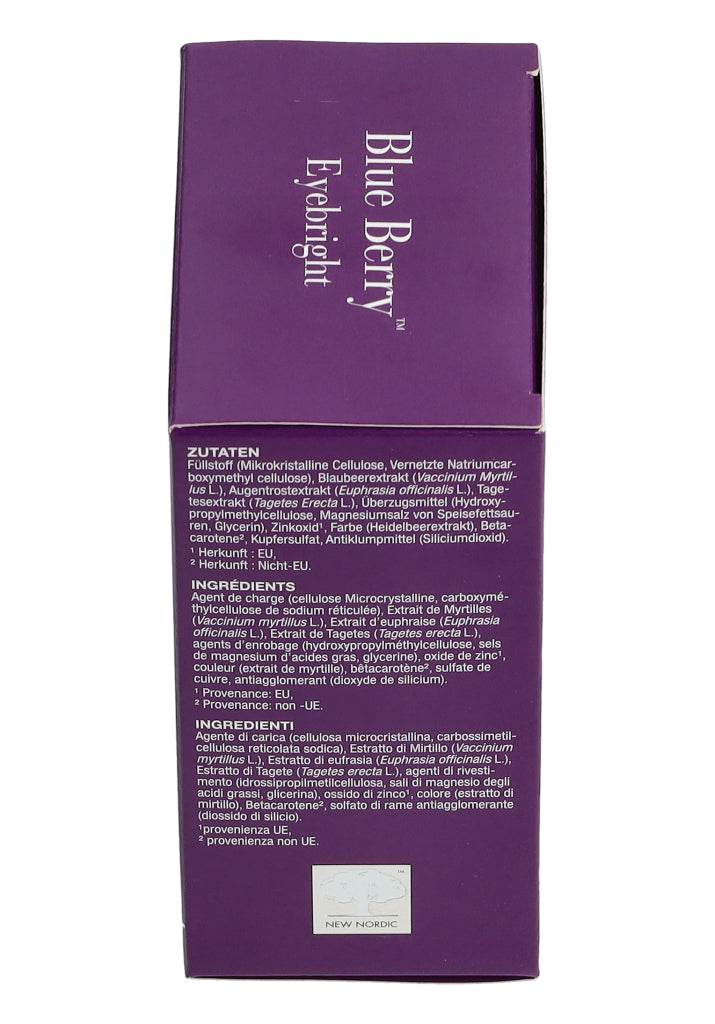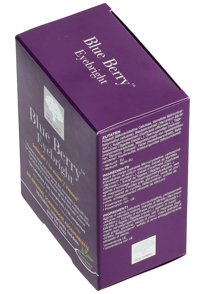 Die originale schwedische Sehkraft Tablette. Blue Berry ist eine Tablette mit Heidelbeeren, Tagetesextrakt, Vitamin A und Zink. Vitamin A trägt zur Erhaltung der normalen Sehkraft bei. Zink trägt zu einem normalen Vitamin-Stoffwechsel bei. Der Tagetes Extrakt hat einen standardisierten Gehalt an natürlichem gelben Pigment Lutein, das auch in der Macula des Auges vorhanden ist.