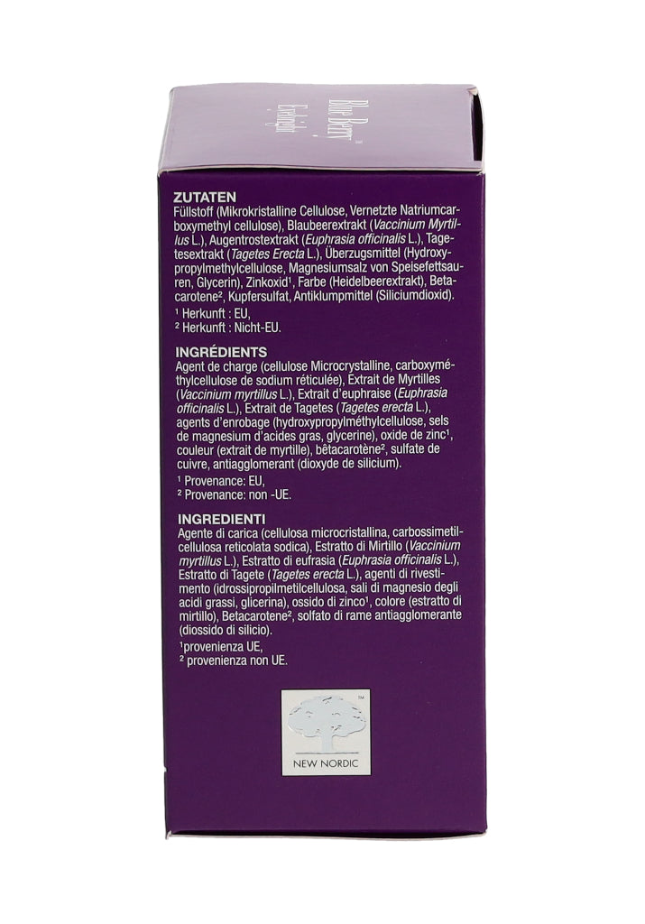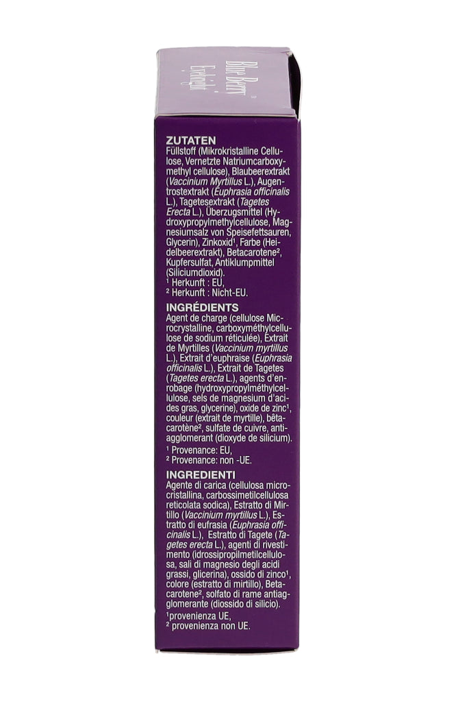 Füllstoff (Mikrokristalline Cellulose, Vernetzte Natriumcarboxymethyl cellulose), Blaubeerextrakt (Vaccinium Myrtillus L.), Augentrostextrakt (Euphrasia officinalis L.), Tagetesextrakt (Tagetes Erecta L.), Überzugsmittel (Hydroxypropylmethylcellulose, Magnesiumsalz von Speisefettsauren, Glycerin), Zinkoxid1, Farbe (Heidelbeerextrakt), Betacarotene2, Kupfersulfat, Antiklumpmittel (Siliciumdioxid). 1Herkunft: EU, 2Herkunft: Nicht-EU. Pro 2 Tabletten: Tagetesextrakt:100mg, standardisiert auf 10% = 10mg Lutein Blaubeerextrakt: 400mg Augentrostextrakt: 200mg.
