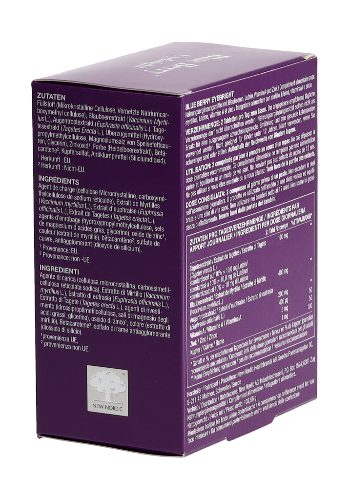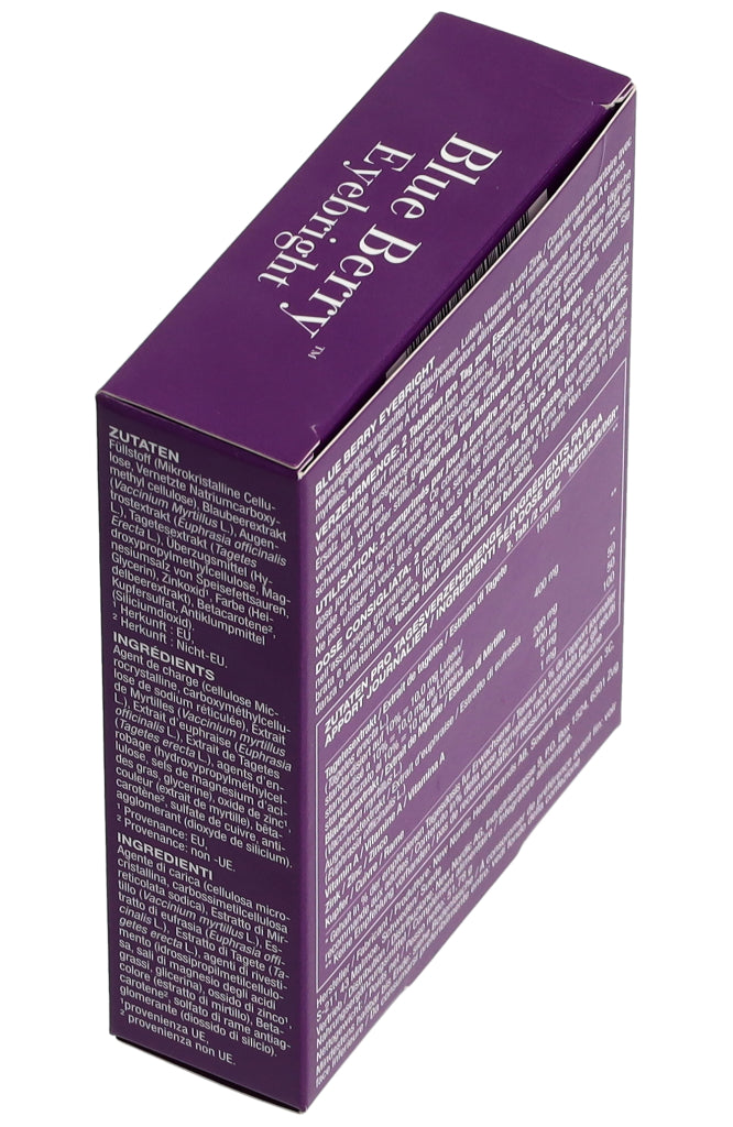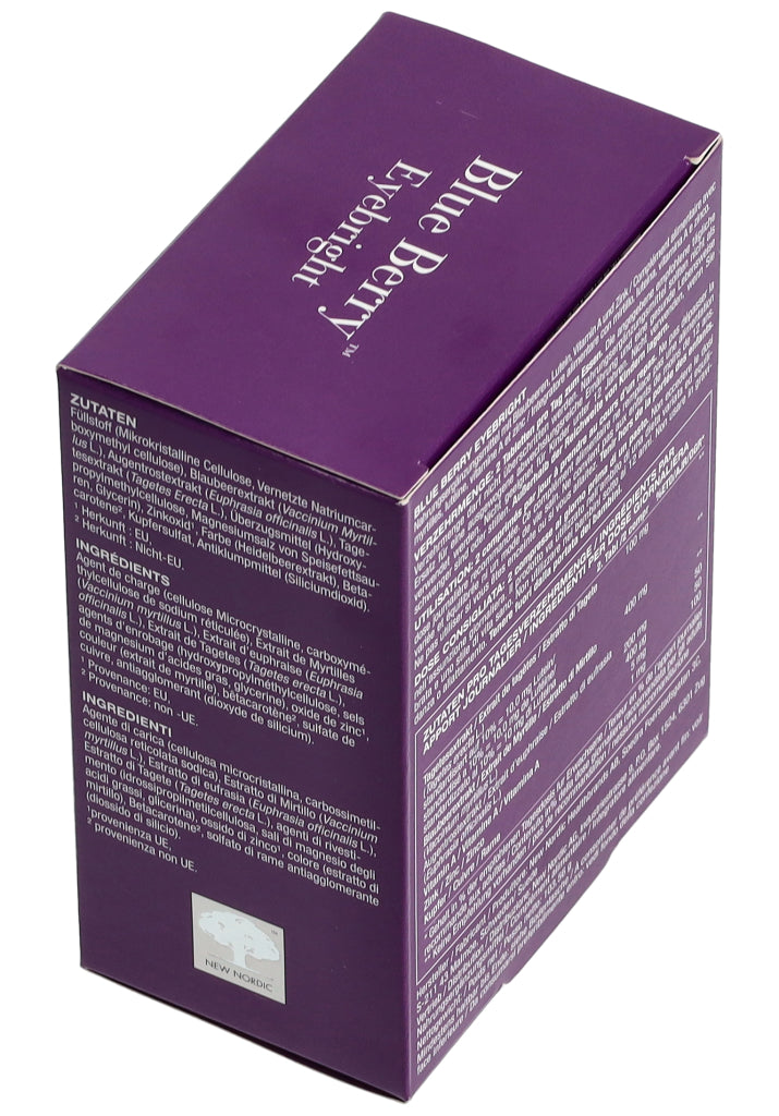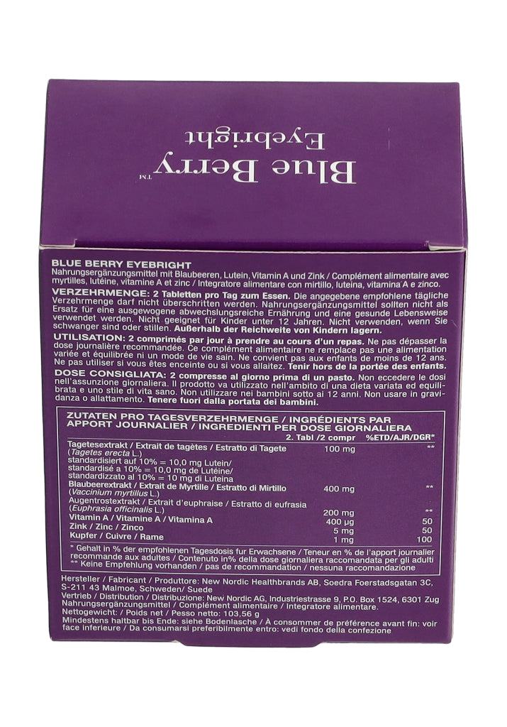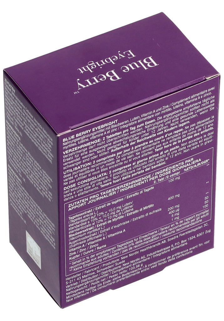 Blue Berry ist eine Tablette mit Heidelbeeren, Tagetesextrakt, Vitamin A und Zink. Vitamin A trägt zur Erhaltung der normalen Sehkraft bei. Zink trägt zu einem normalen Vitamin-A Stoffwechsel bei. Der Tagetes Extrakt hat einen standardisierten Gehalt an natürlichem gelben Pigment Lutein, das auch in der Macula des Auges vorhanden ist.