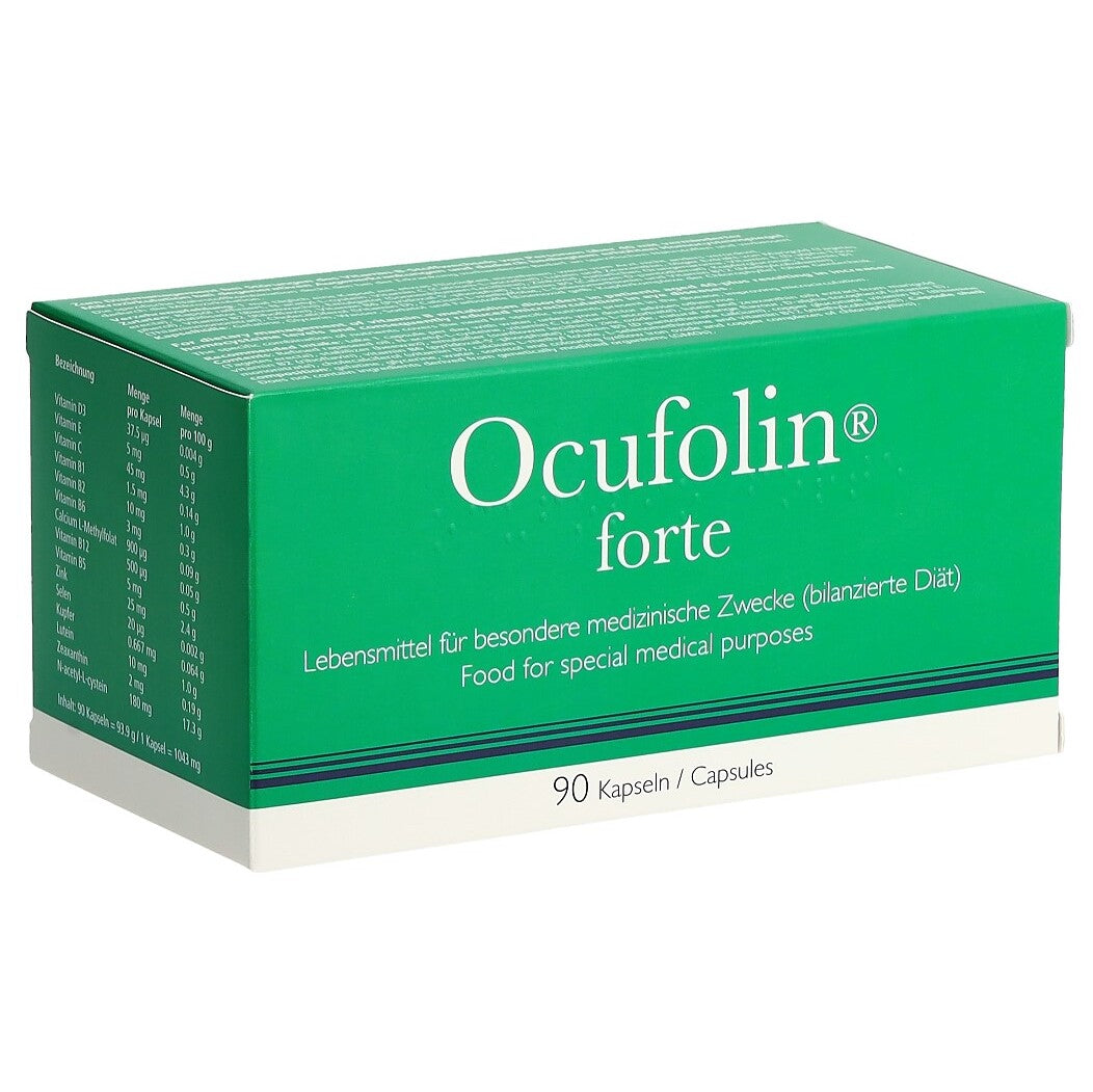 Ocufolin® forte ist kein Arzneimittel, sondern ein Lebensmittel für besondere medizinische Zwecke. Diese werden für Patienten entwickelt, die aufgrund einer Erkrankung verursachten Stoffwechselstörung Nährstoffe nicht in genügendem Masse über die normale Ernährung oder Nahrungsergänzungsmittel aufnehmen, verdauen, verstoffwechseln oder ausscheiden können. Deshalb sollten Sie vor dem Verzehr Ihren Arzt befragen. Dies ist besonders wichtig, wenn Sie Arzneimittel einnehmen.