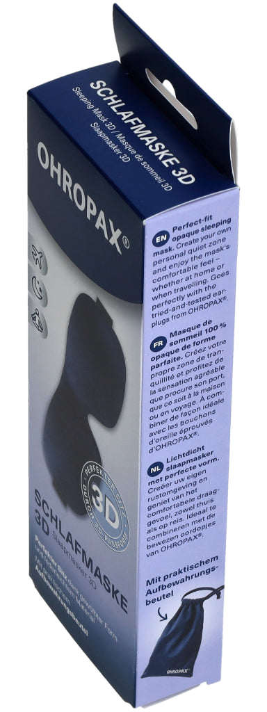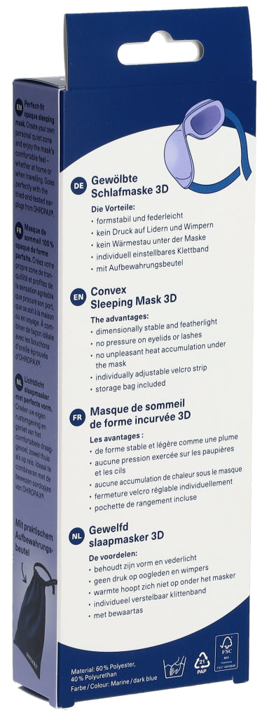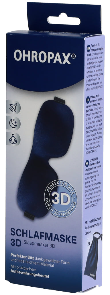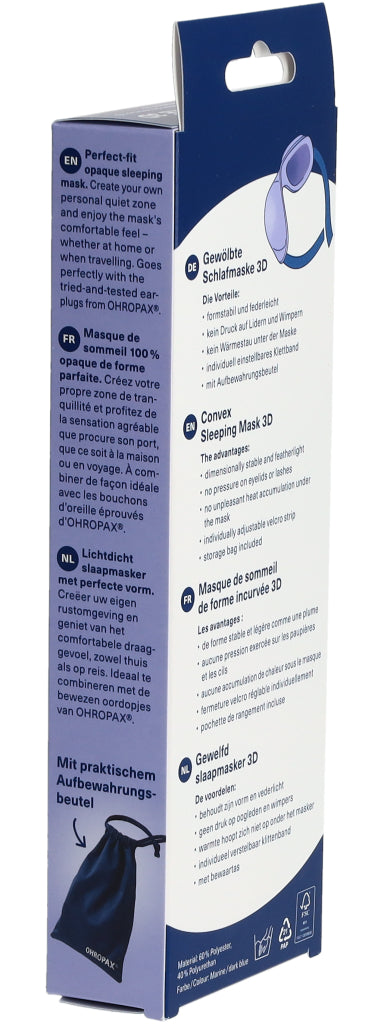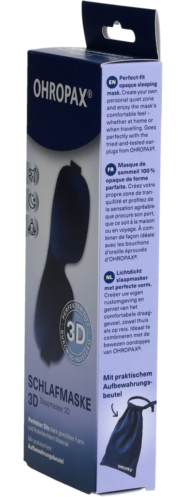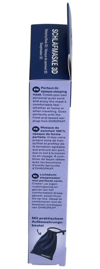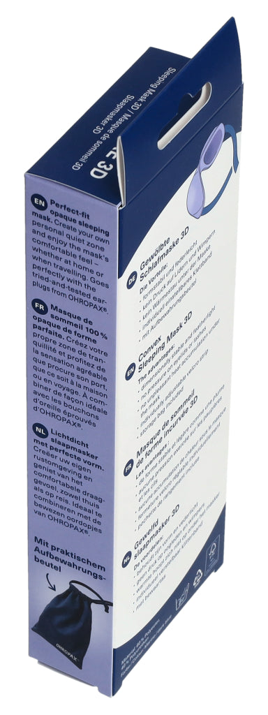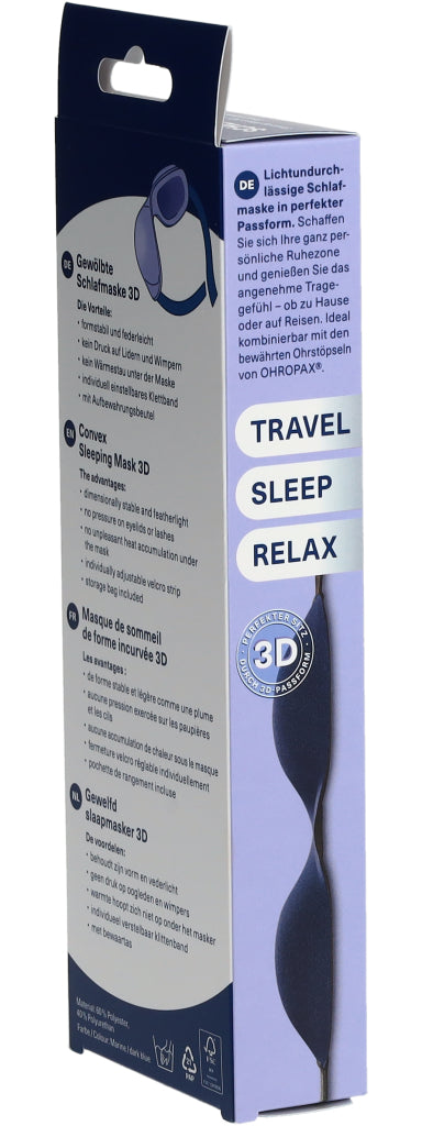 Die OHROPAX® Schlafmaske 3D dunkelt perfekt ab und ist besonders angenehm und leicht zu tragen. Das breite Klettband und der hautfreundliche Stoff garantieren höchsten Tragekomfort.