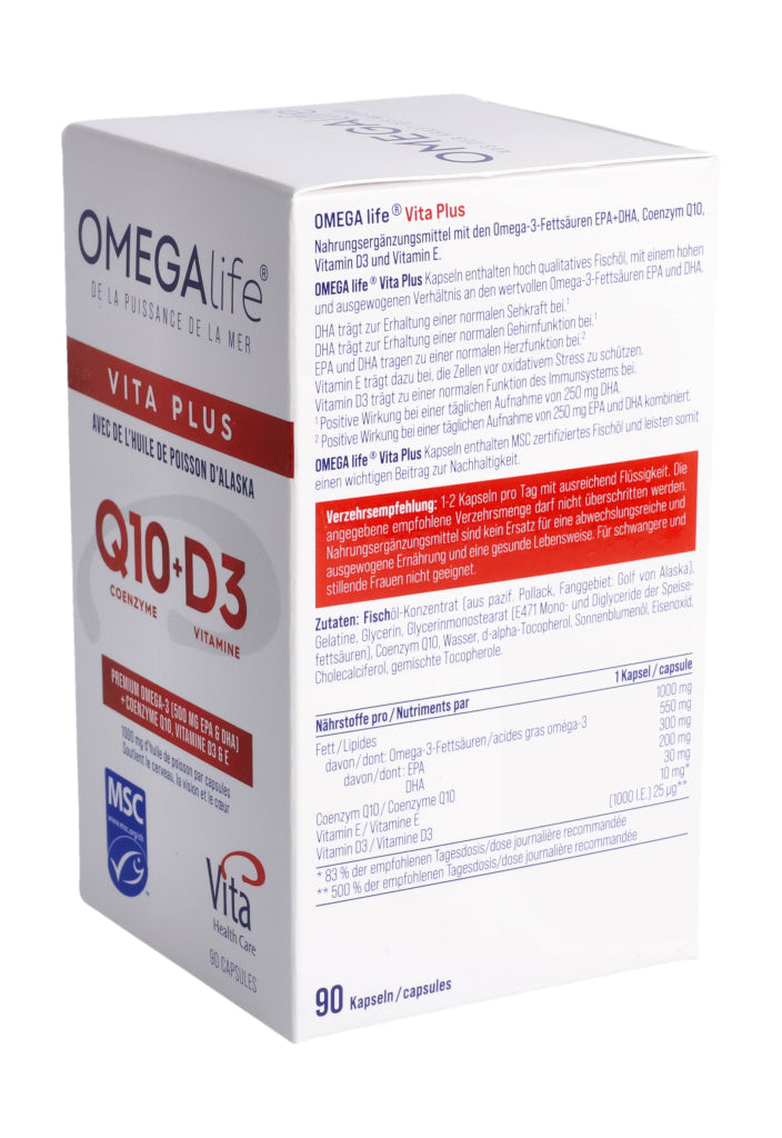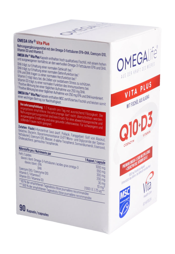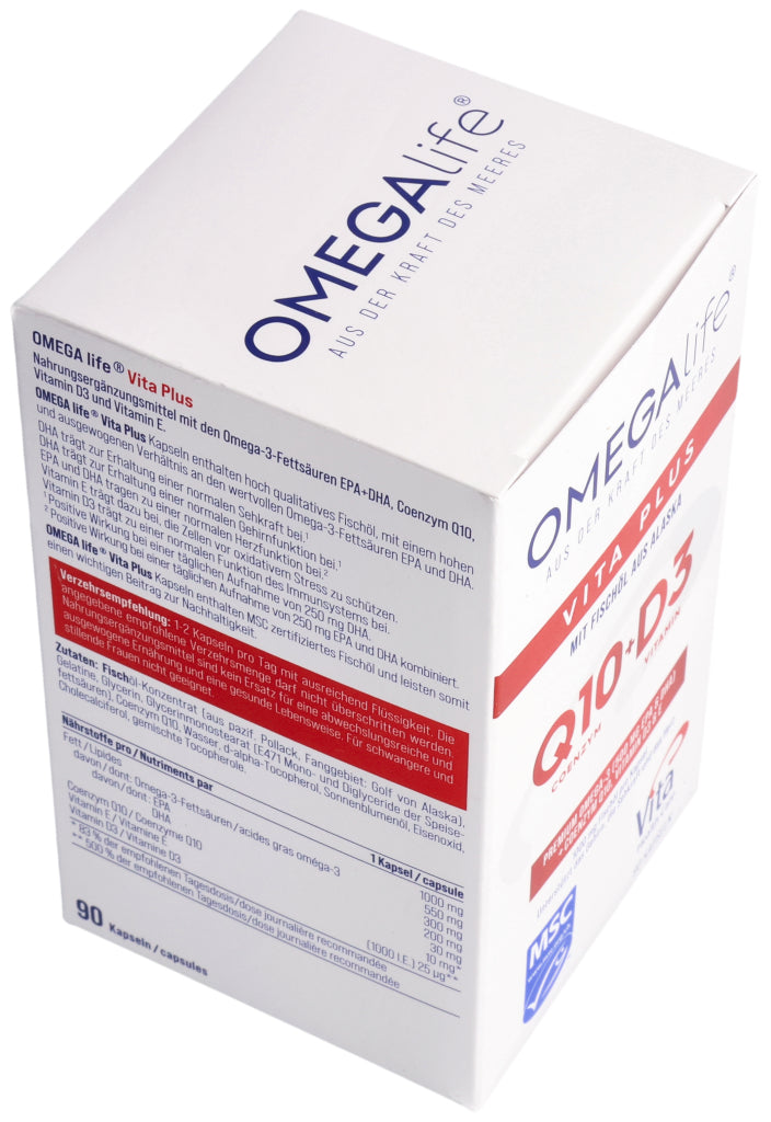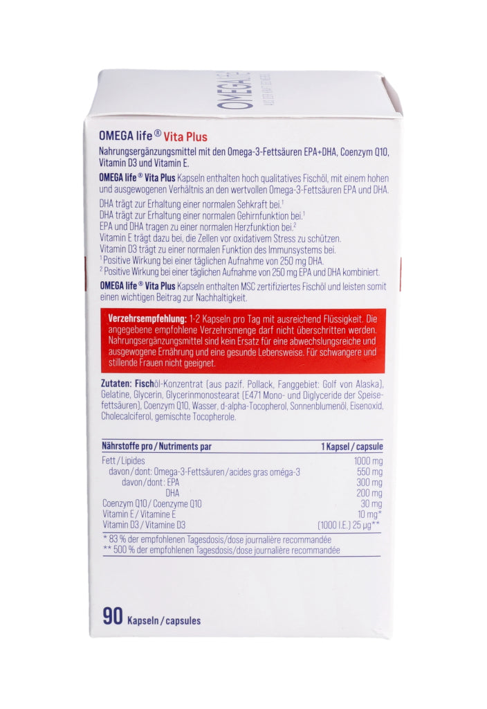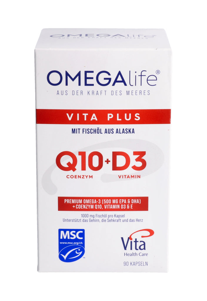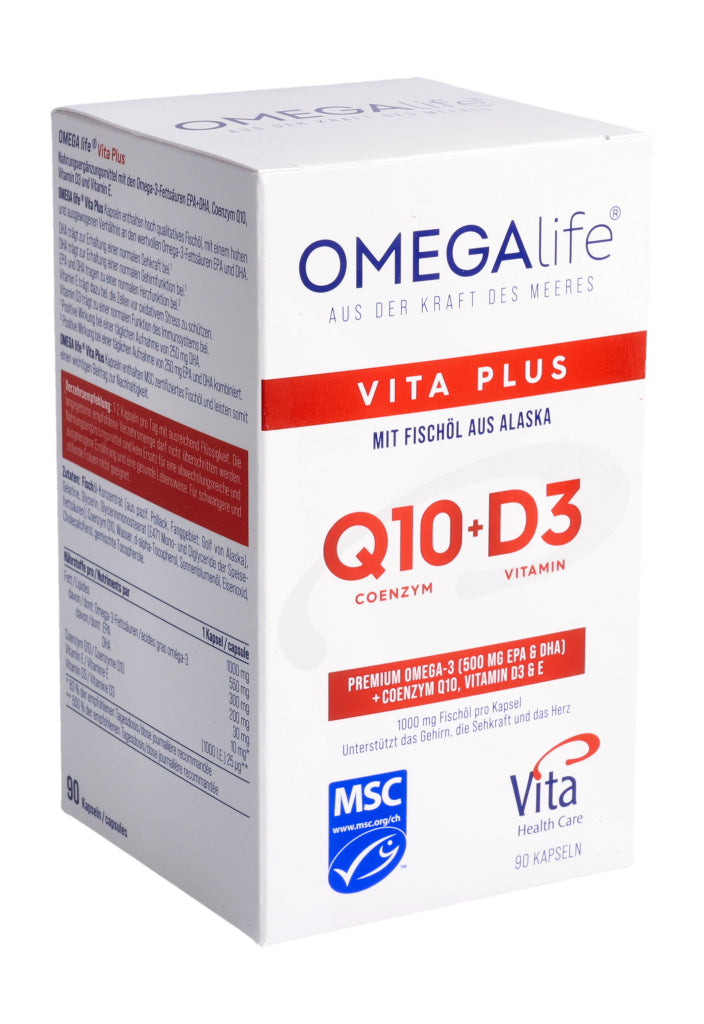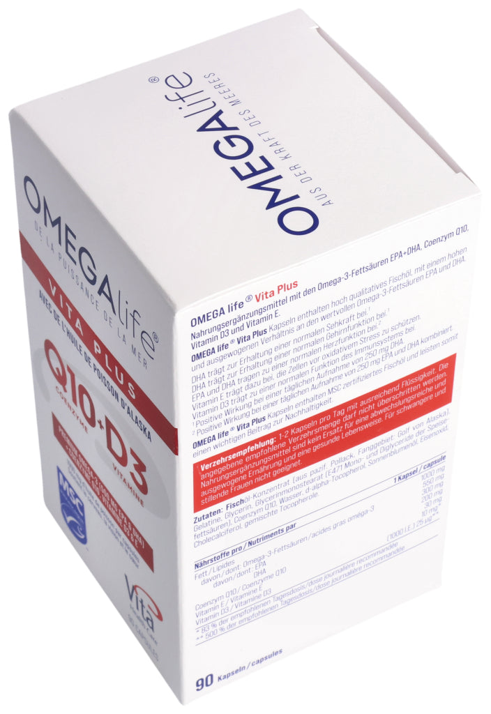 OMEGA life® Vita Plus: Die drei Musketiere in einer Kapsel: Omega-3 (EPA & DHA), Q10 und Vitamin D. EPA und DHA tragen zu einer normalen Herzfunktion bei. Der Einsatz gesättigter Fettsäuren durch einfach und/oder mehrfach ungesättigte Fettsäuren (wie EPA und DHA) in der Ernährung trägt zur Aufrechterhaltung eines normalen Blutdrucks bei. DHA trägt zur Aufrechterhaltung eines normalen Triglyceridspiegels im Blut bei. DHA trägt zur Erhaltung einer normalen Gehirnfunktion und Sehkraft bei. Das Coenzym Q10 (Q-10) ist eine körpereigene Substanz und wird teilweise über die Nahrung aufgenommen, aber auch im Körper selbst produziert. In jeder menschlichen Zelle wird die Energie aus der Nahrung in körpereigene Energie (ATP) umgewandelt. Die Organe mit dem höchsten Energiebedarf (wie Herz, Lunge, Leber) weisen deshalb auch die höchste Q-10 Konzentration auf. Vitamin D3 erfüllt im Stoffwechsel viele Funktionen und unterstützt das Immunsystem. Vitamin E trägt dazu bei, die Zellen vor oxidativem Stress zu schützen.. Aus der Kraft des Meeres: Das in OMEGA® life verwendete Fischöl stammt vom pazif. Pollack aus Alaska. Die Fanggebiete sind Golf von Alaska, Beringsee und Aleutian Islands. Das Fischöl in OMEGA life® ist MSC zertifiziert. Der Marine Stewardship Council (MSC) ist die weltweit führende gemeinnützige Organisation, die sich dafür einsetzt, dass die Verbraucher beim Kauf von Fischereierzeugnissen eine rückverfolgbare und nachhaltige Wahl treffen können.