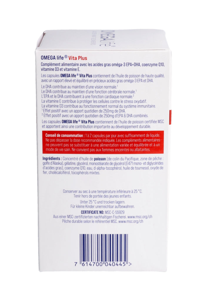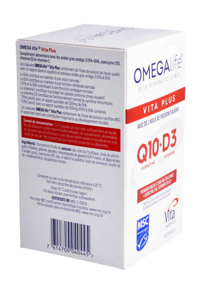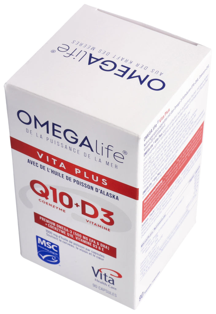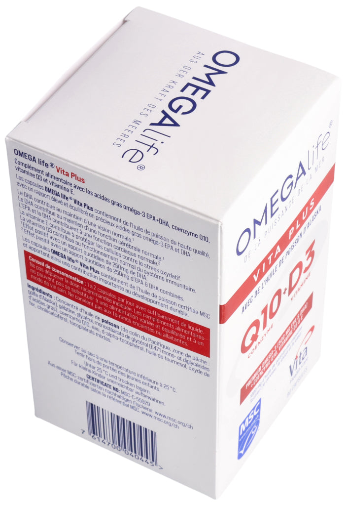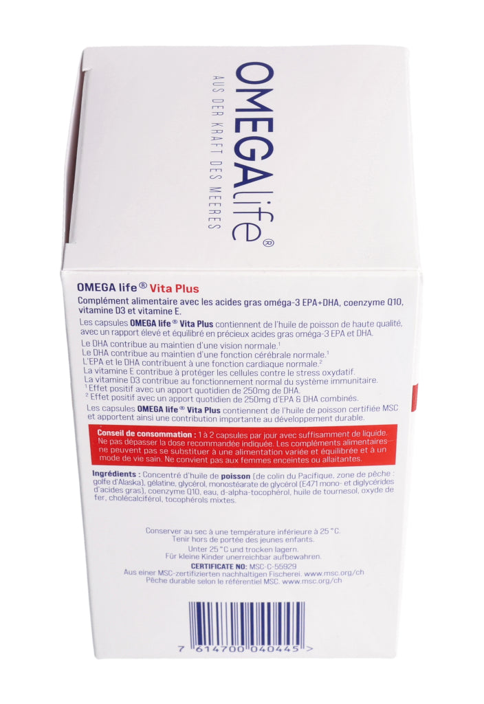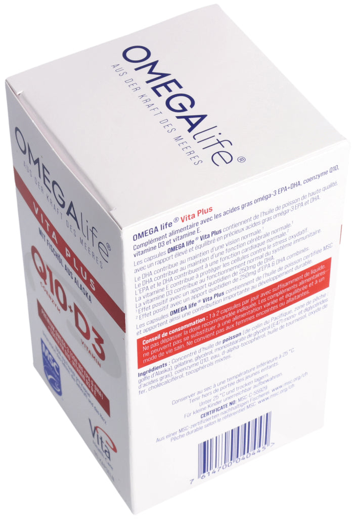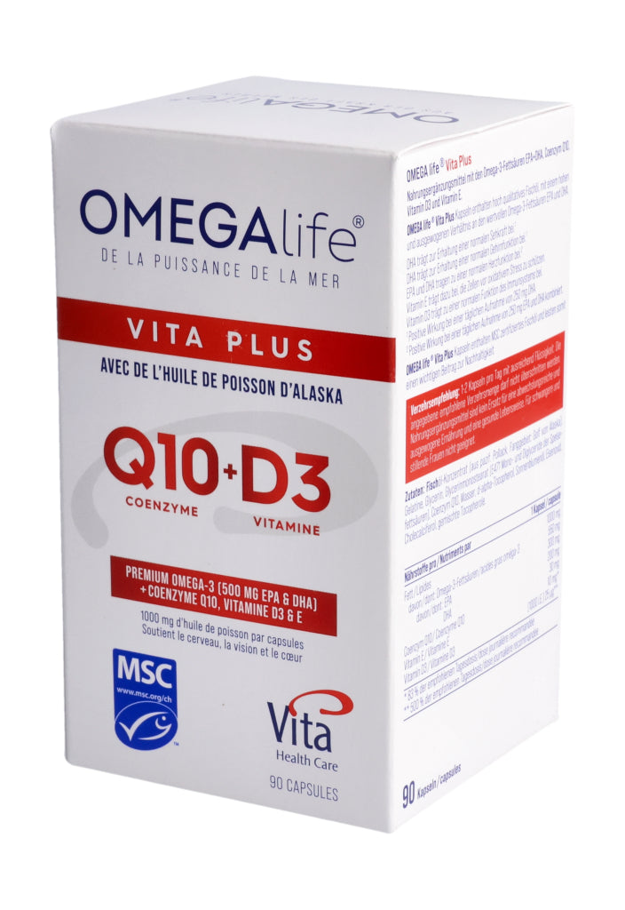 OMEGA life® Vita Plus: Die drei Musketiere in einer Kapsel: Omega-3 (EPA & DHA), Q10 und Vitamin D. EPA und DHA tragen zu einer normalen Herzfunktion bei. Der Einsatz gesättigter Fettsäuren durch einfach und/oder mehrfach ungesättigte Fettsäuren (wie EPA und DHA) in der Ernährung trägt zur Aufrechterhaltung eines normalen Blutdrucks bei. DHA trägt zur Aufrechterhaltung eines normalen Triglyceridspiegels im Blut bei. DHA trägt zur Erhaltung einer normalen Gehirnfunktion und Sehkraft bei. Das Coenzym Q10 (Q-10) ist eine körpereigene Substanz und wird teilweise über die Nahrung aufgenommen, aber auch im Körper selbst produziert. In jeder menschlichen Zelle wird die Energie aus der Nahrung in körpereigene Energie (ATP) umgewandelt. Die Organe mit dem höchsten Energiebedarf (wie Herz, Lunge, Leber) weisen deshalb auch die höchste Q-10 Konzentration auf. Vitamin D3 erfüllt im Stoffwechsel viele Funktionen und unterstützt das Immunsystem. Vitamin E trägt dazu bei, die Zellen vor oxidativem Stress zu schützen.. Aus der Kraft des Meeres: Das in OMEGA® life verwendete Fischöl stammt vom pazif. Pollack aus Alaska. Die Fanggebiete sind Golf von Alaska, Beringsee und Aleutian Islands. Das Fischöl in OMEGA life® ist MSC zertifiziert. Der Marine Stewardship Council (MSC) ist die weltweit führende gemeinnützige Organisation, die sich dafür einsetzt, dass die Verbraucher beim Kauf von Fischereierzeugnissen eine rückverfolgbare und nachhaltige Wahl treffen können.