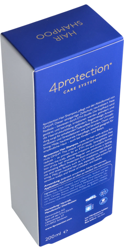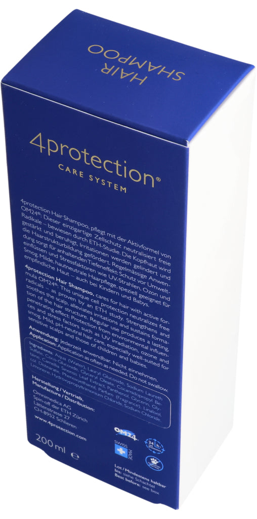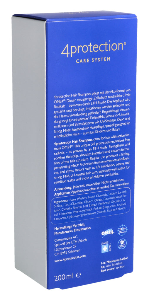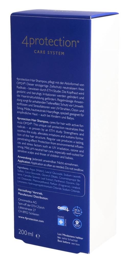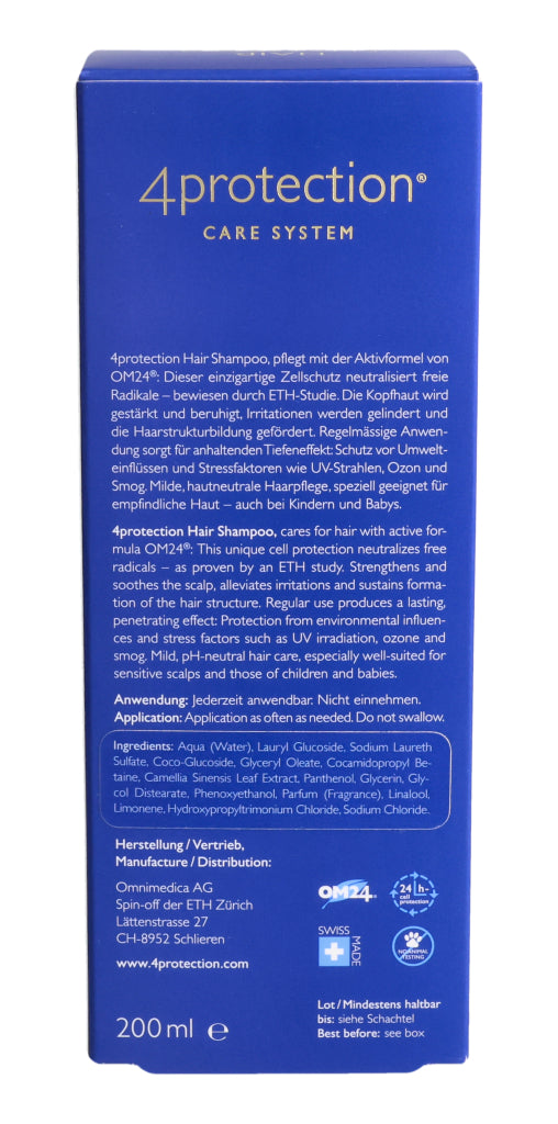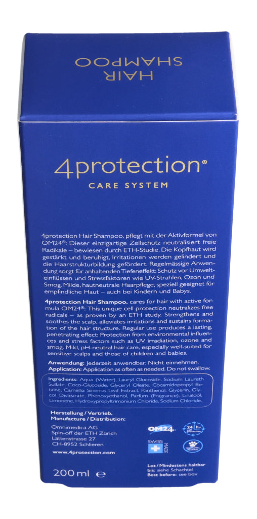 Omnimedica Hair Shampoo pflegt mit der Aktivformel von OM24®: Dieser einzigartige Zellschutz neutralisiert freie Radikale – bewiesen durch ETH-Studie. Die Kopfhaut wird gestärkt und beruhigt, Irritationen werden gelindert und die Haarstrukturbildung gefördert. Regelmässige Anwendung sorgt für anhaltenden Tiefeneffekt: Schutz vor Umwelteinflüssen und Stressfaktoren wie UV-Strahlen, Ozon und Smog. Milde, hautneutrale Haarpflege, speziell geeignet für emp¬findliche Haut – auch bei Kindern und Babys.