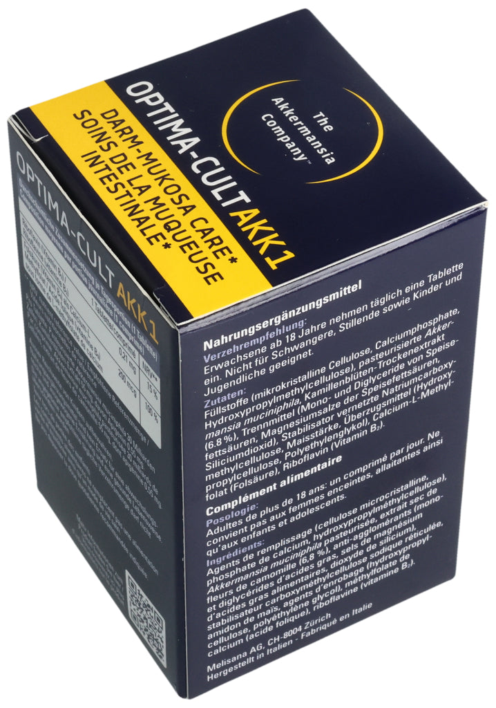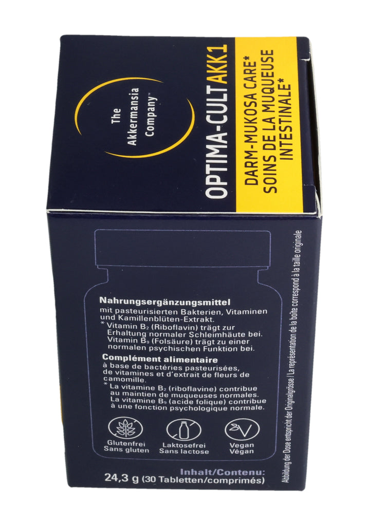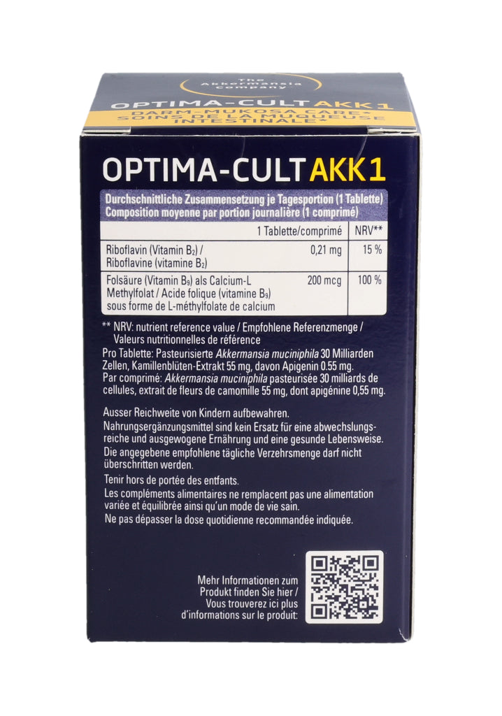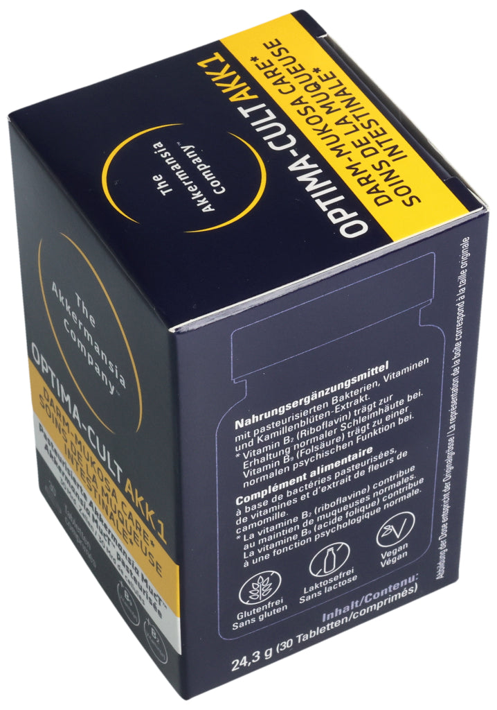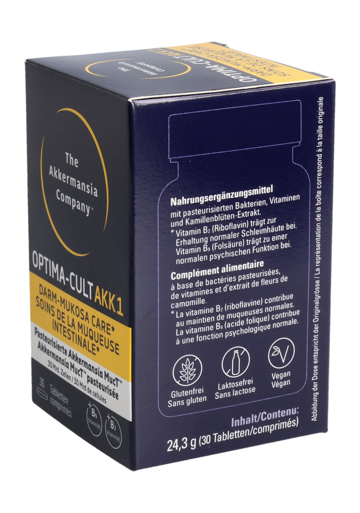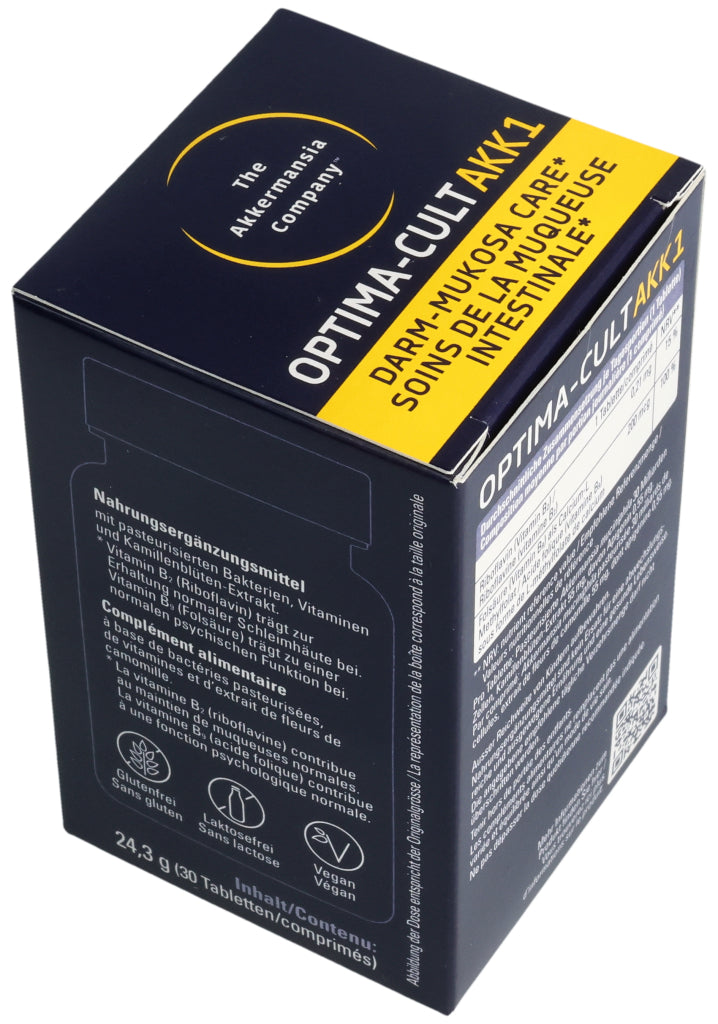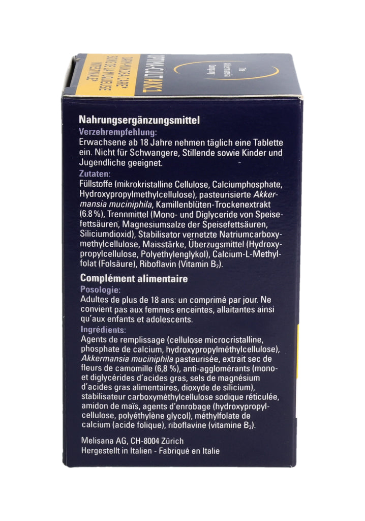 Füllstoffe (mikrokristalline Cellulose, Calciumphosphate, Hydroxypropylmethylcellulose), pasteurisierte Akkermansia muciniphila, Kamillenblüten-Trockenextrakt (6.8%), Trennmittel (Mono- und Diglyceride von Speisefettsäuren, Magnesiumsalze der Speisefettsäuren, Siliciumdioxid), Stabilisator vernetzte Natriumcarboxymethylcellulose, Maisstärke, Überzugsmittel (Hydroxypropylcellulose, Polyethylenglykol), Calcium-L-Methylfolat (Folsäure), Riboflavin (Vitamin B2). Pro Tablette: Pasteurisierte Akkermansia muciniphila: 30 Milliarden Zellen. Kamillenblüten - Extrakt: 55mg, davon Apigenin 0.55mg. .