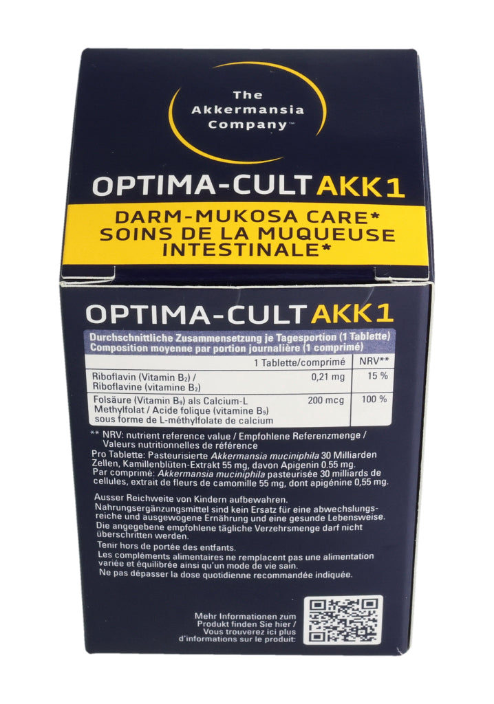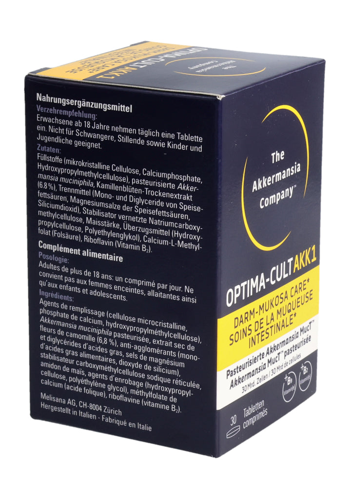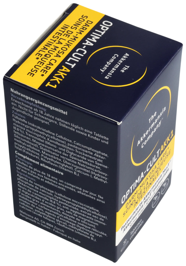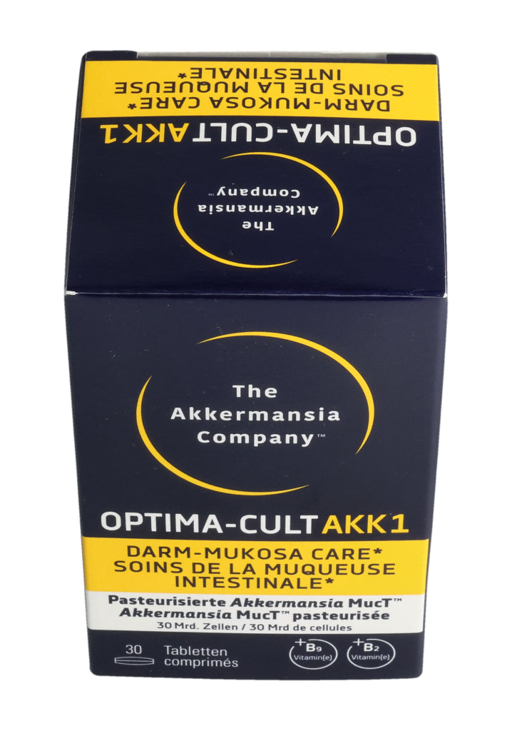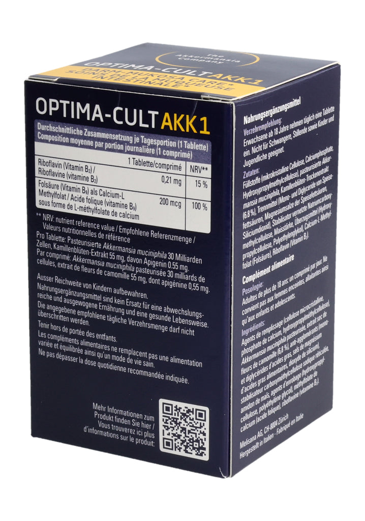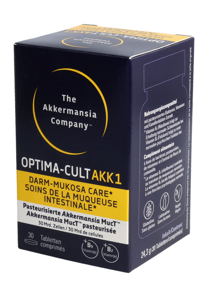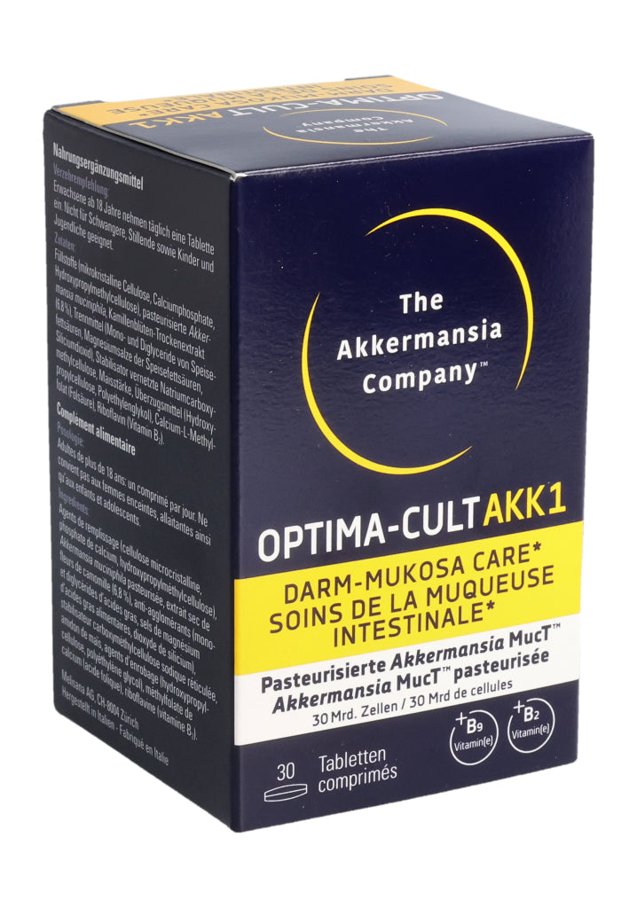 Füllstoffe (mikrokristalline Cellulose, Calciumphosphate, Hydroxypropylmethylcellulose), pasteurisierte Akkermansia muciniphila, Kamillenblüten-Trockenextrakt (6.8%), Trennmittel (Mono- und Diglyceride von Speisefettsäuren, Magnesiumsalze der Speisefettsäuren, Siliciumdioxid), Stabilisator vernetzte Natriumcarboxymethylcellulose, Maisstärke, Überzugsmittel (Hydroxypropylcellulose, Polyethylenglykol), Calcium-L-Methylfolat (Folsäure), Riboflavin (Vitamin B2). Pro Tablette: Pasteurisierte Akkermansia muciniphila: 30 Milliarden Zellen. Kamillenblüten - Extrakt: 55mg, davon Apigenin 0.55mg. .