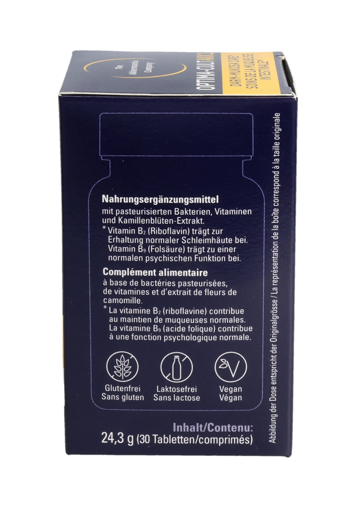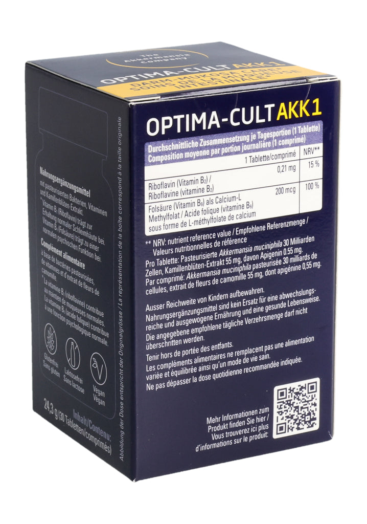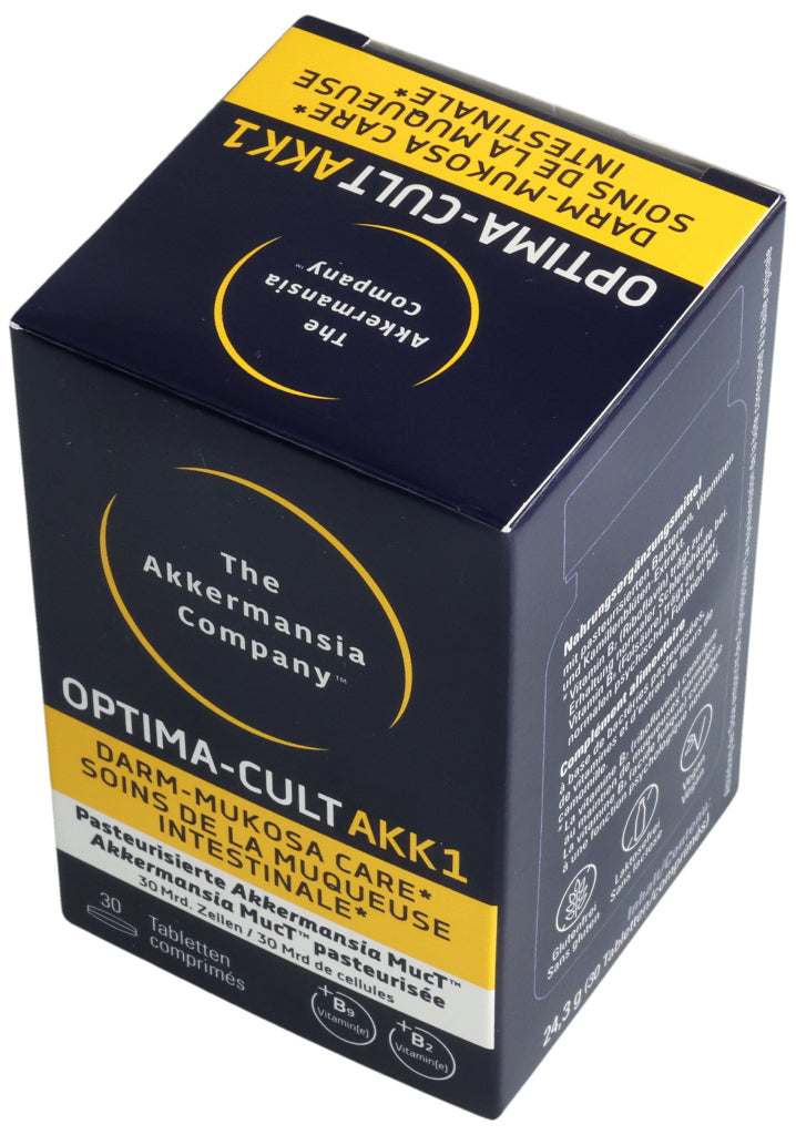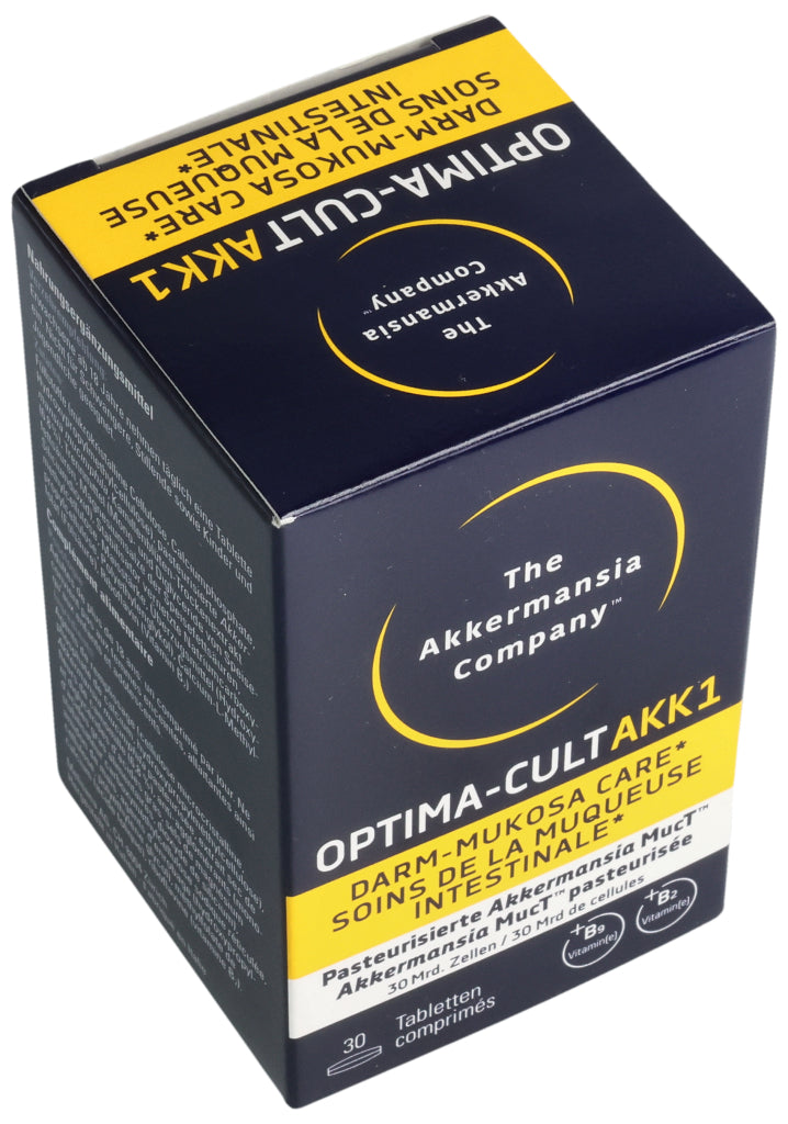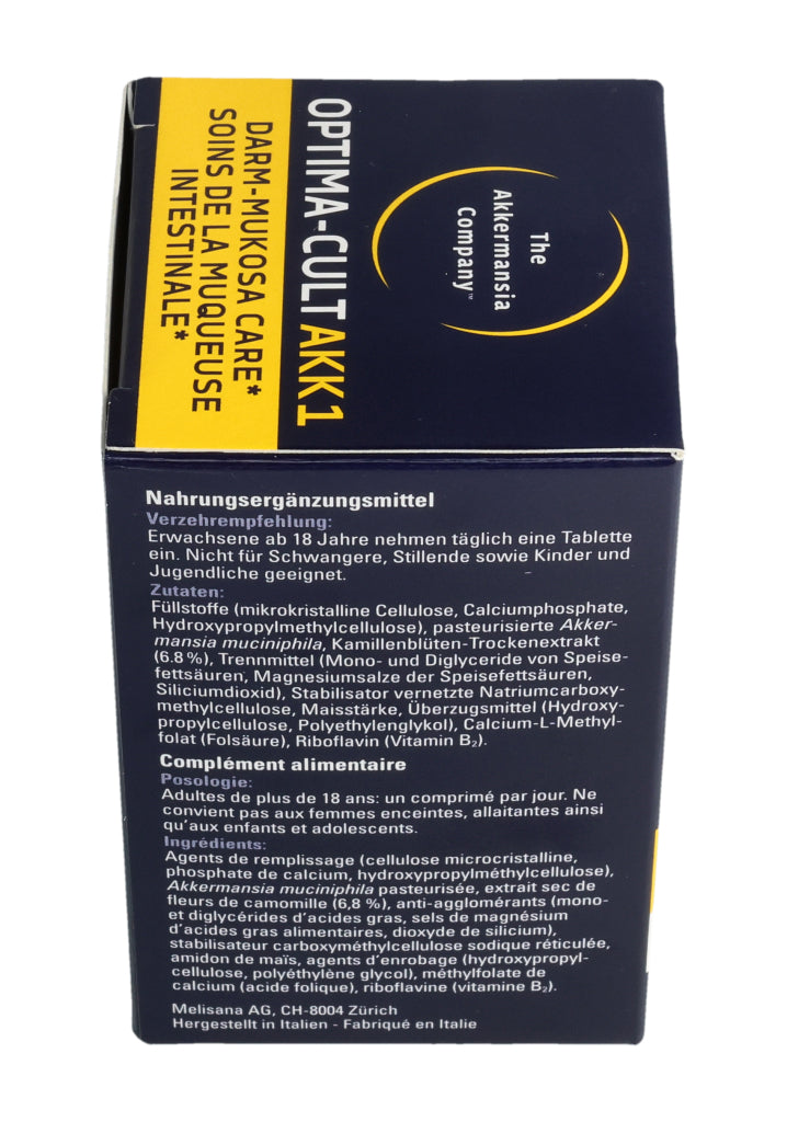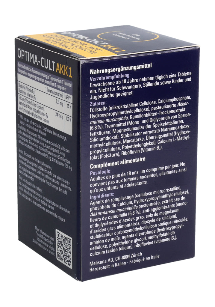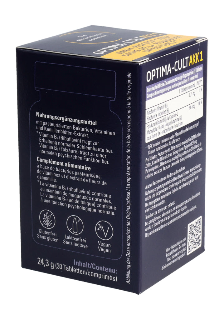 Füllstoffe (mikrokristalline Cellulose, Calciumphosphate, Hydroxypropylmethylcellulose), pasteurisierte Akkermansia muciniphila, Kamillenblüten-Trockenextrakt (6.8%), Trennmittel (Mono- und Diglyceride von Speisefettsäuren, Magnesiumsalze der Speisefettsäuren, Siliciumdioxid), Stabilisator vernetzte Natriumcarboxymethylcellulose, Maisstärke, Überzugsmittel (Hydroxypropylcellulose, Polyethylenglykol), Calcium-L-Methylfolat (Folsäure), Riboflavin (Vitamin B2). Pro Tablette: Pasteurisierte Akkermansia muciniphila: 30 Milliarden Zellen. Kamillenblüten - Extrakt: 55mg, davon Apigenin 0.55mg. .