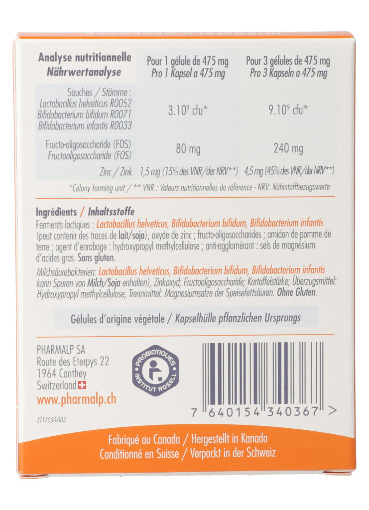 Milchsäurebakterien (Lactobacillus helveticus, Bifidobacterium bifidum, Bifidobacterium infantis); Zinkoxyd, Fructooligosaccharide; Kartoffelstärke; Überzugsmittel: Hydroxypropyl methylcellulose; Trennmittel: Magnesiumstearat.