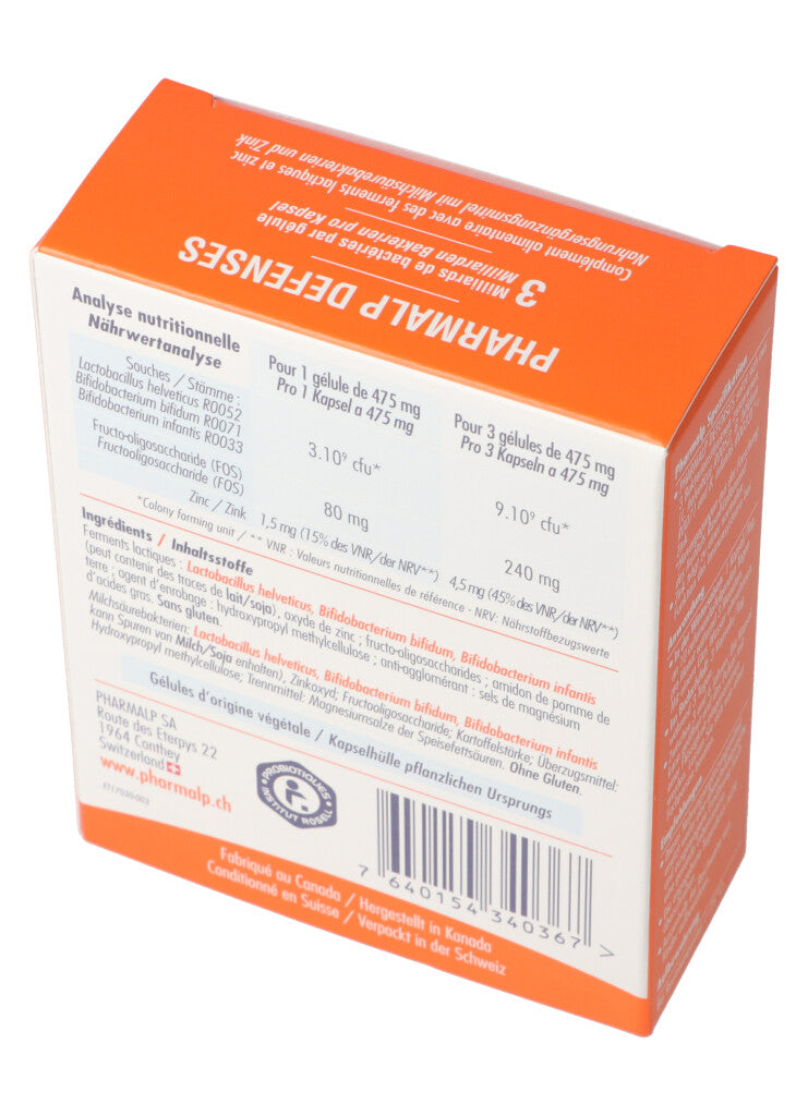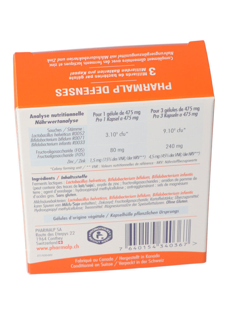 Nahrungsergänzungsmittel mit 3 Bakterienstämmen + Präbiotika (FOS) + Zink, um die Immunität Ihres Organismus zu unterstützen.