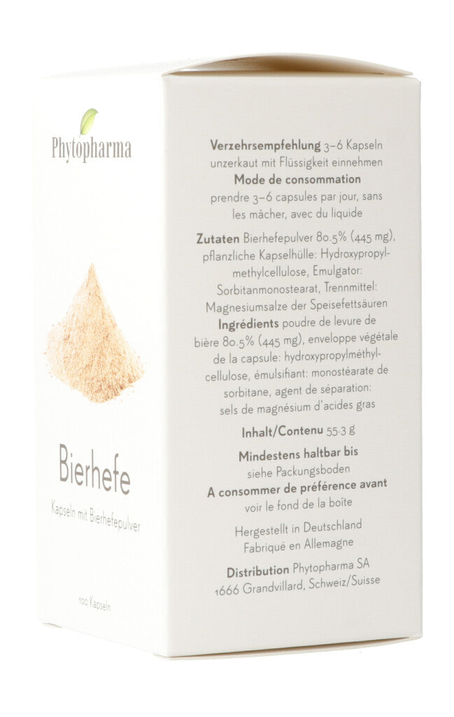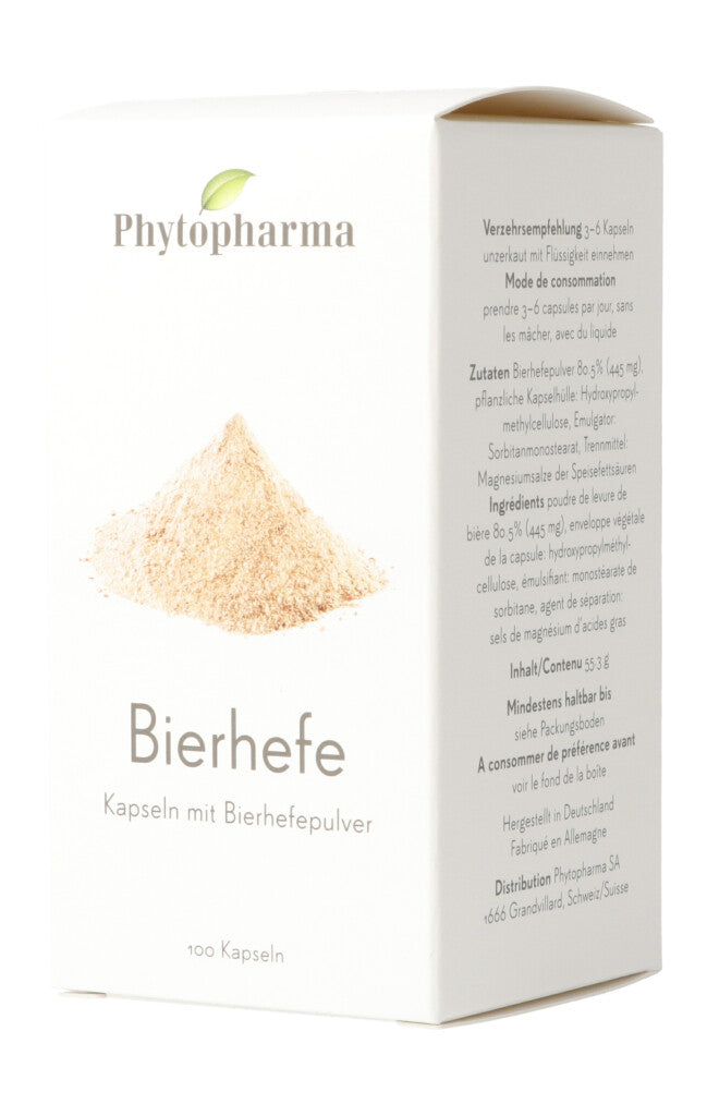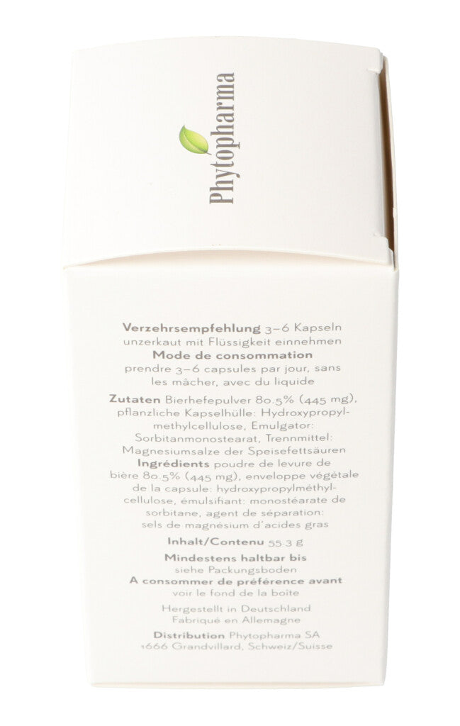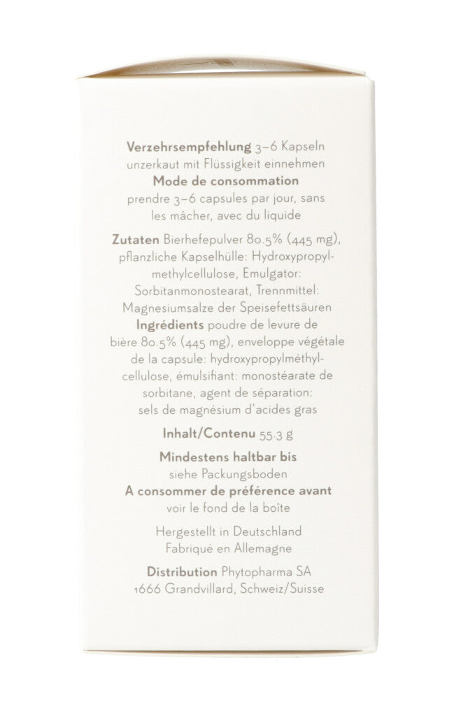 Pro Kapsel: Bierhefepulver 80.5% (445 mg). Pflanzliche Kapselhülle: Hydroxypropylmethylcellulose. Emulgator: Sorbitanmonostearat. Trennmittel: Magnesiumsalze der Speisefettsäuren..