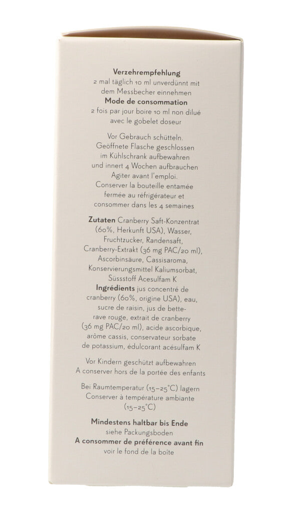 Cranberry Saft-Konzentrat (60%, Herkunft USA), Wasser, Fruchtzucker, Randensaft, Cranberry-Extrakt (36mg PAC/20ml), Ascorbinsäure, Cassisaroma, Konservierungsmittel Kaliumsorbat, Süssstoff Acesulfam K..