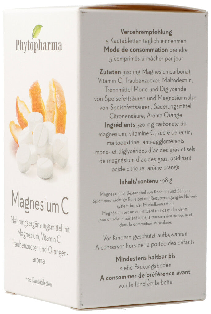 320 mg Magnesiumcarbonat, Vitamin C, Traubenzucker, Maltodextrin, Trennmittel Mono und Diglyceride von Speisefettsäuren und Magnesiumsalze von Speisefettsäuren, Säuerungsmittel Citronensäure, Aroma Orange..