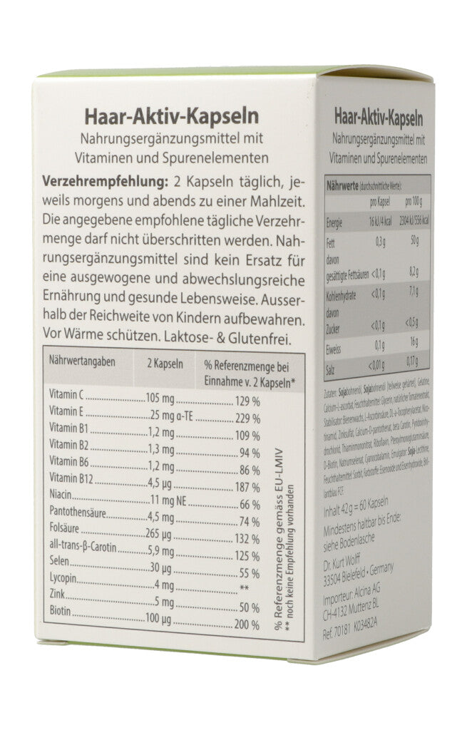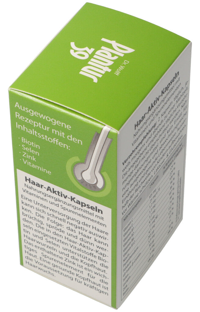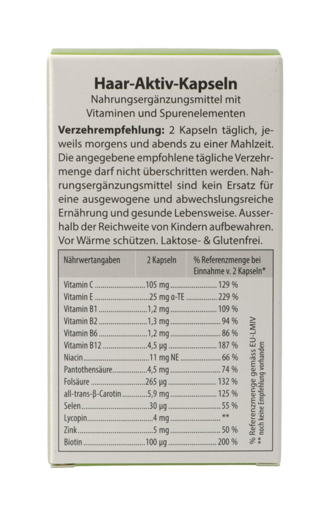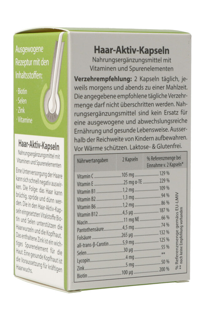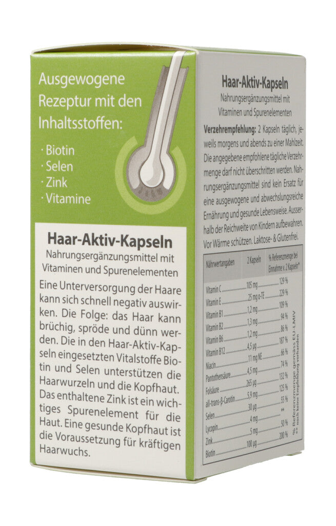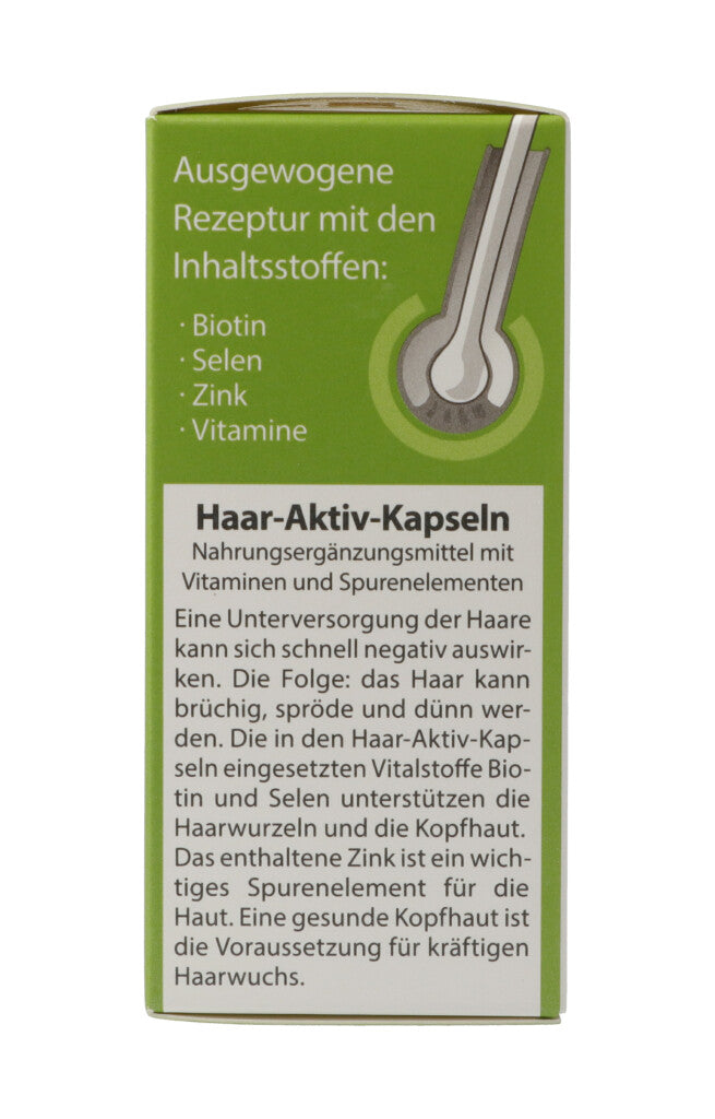 Haar-Aktiv-Kapseln. Nahrungsergänzungsmittel mit Vitaminen und Spurenelementen. Eine Unterversorgung der Haare kann sich schnell negativ auswirken. Die Folge: Das Haar kann brüchig, spröde und dünn werden. Die in den Haar-Aktiv-Kapseln eingesetzten Vitalstoffe Biotin und Selen unterstützen die Haarwurzeln und die Kopfhaut. Das enthaltene Zink ist ein wichtiges Spurenelement für die Haut. Eine gesunde Kopfhaut ist die Voraussetzung für kräftigen Haarwuchs.