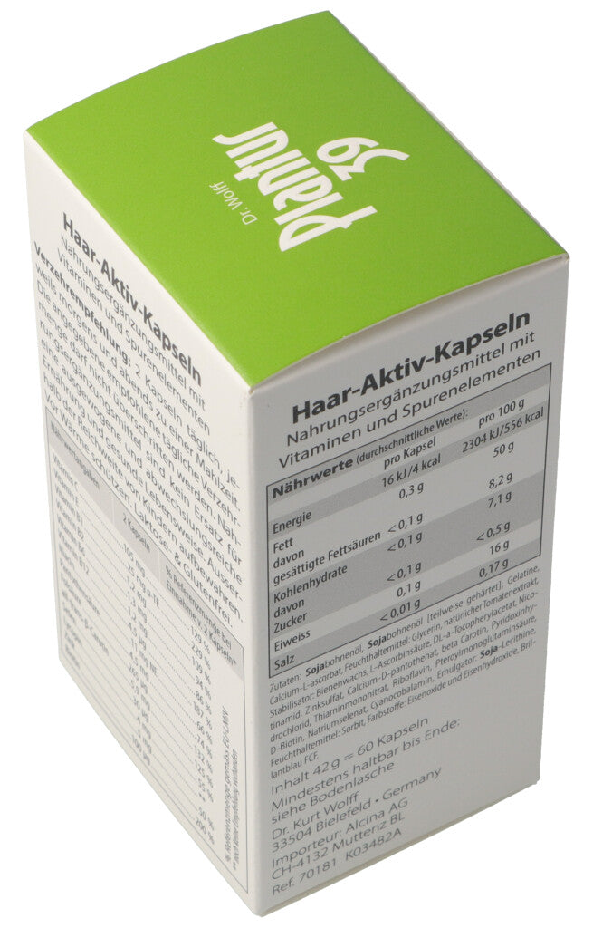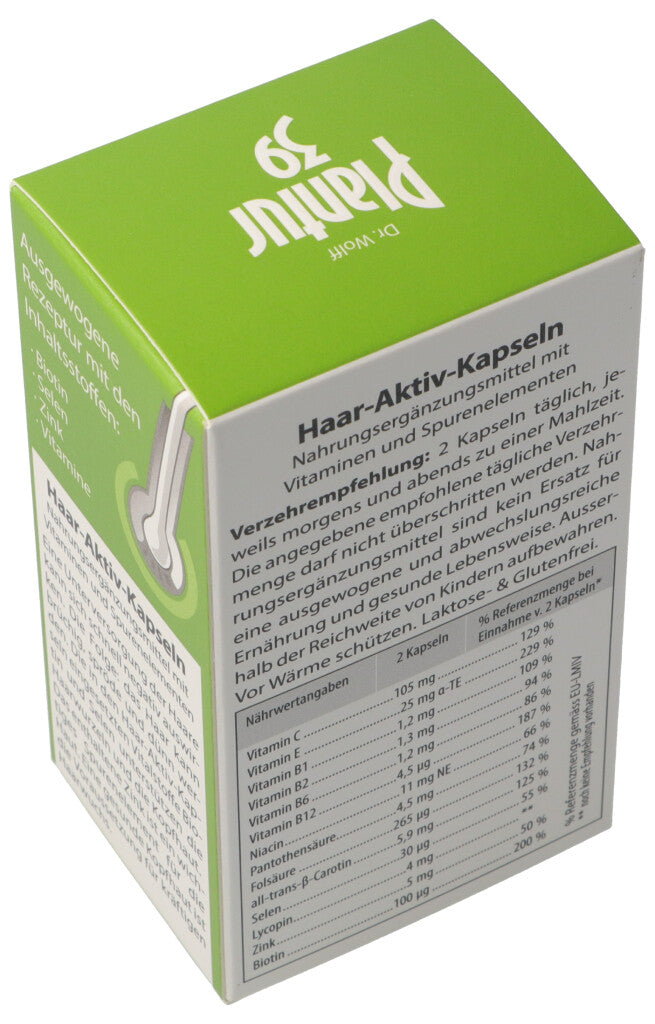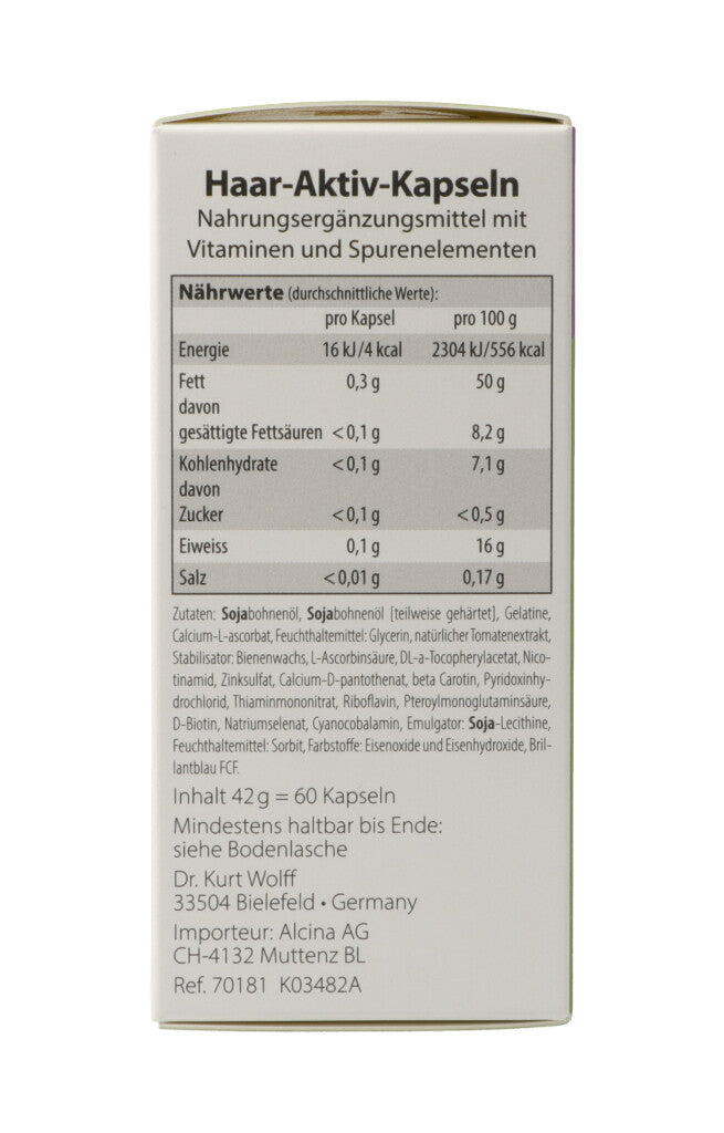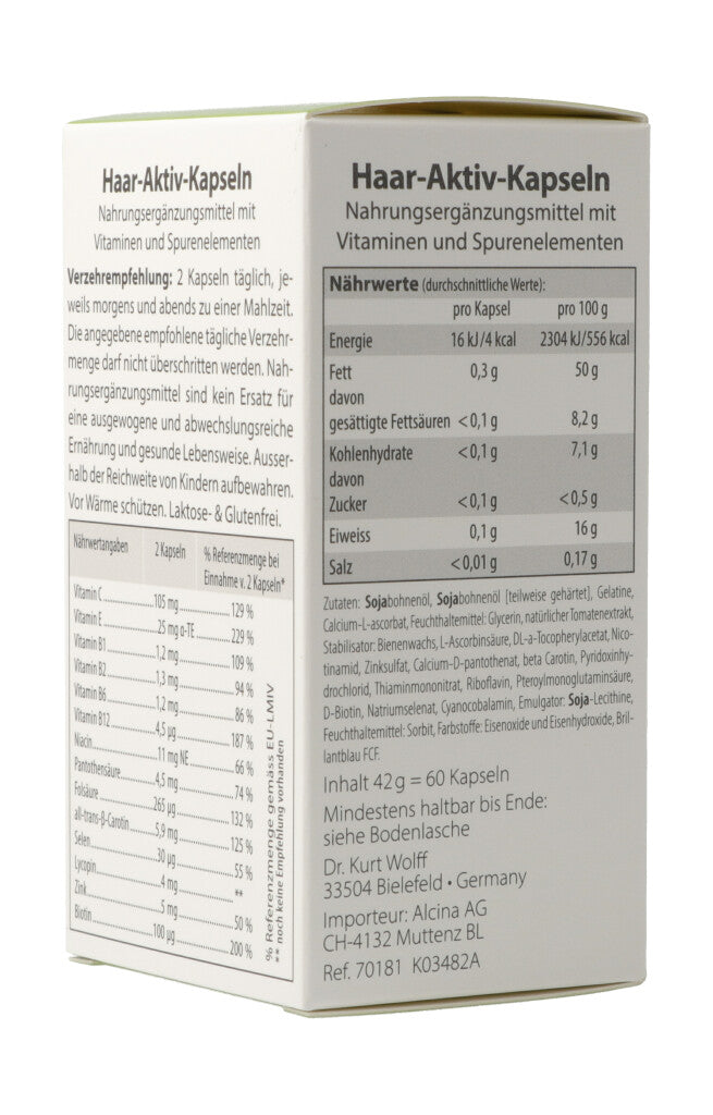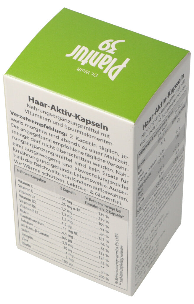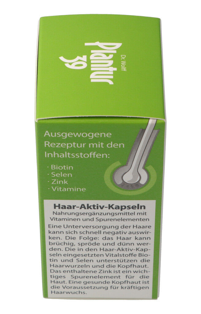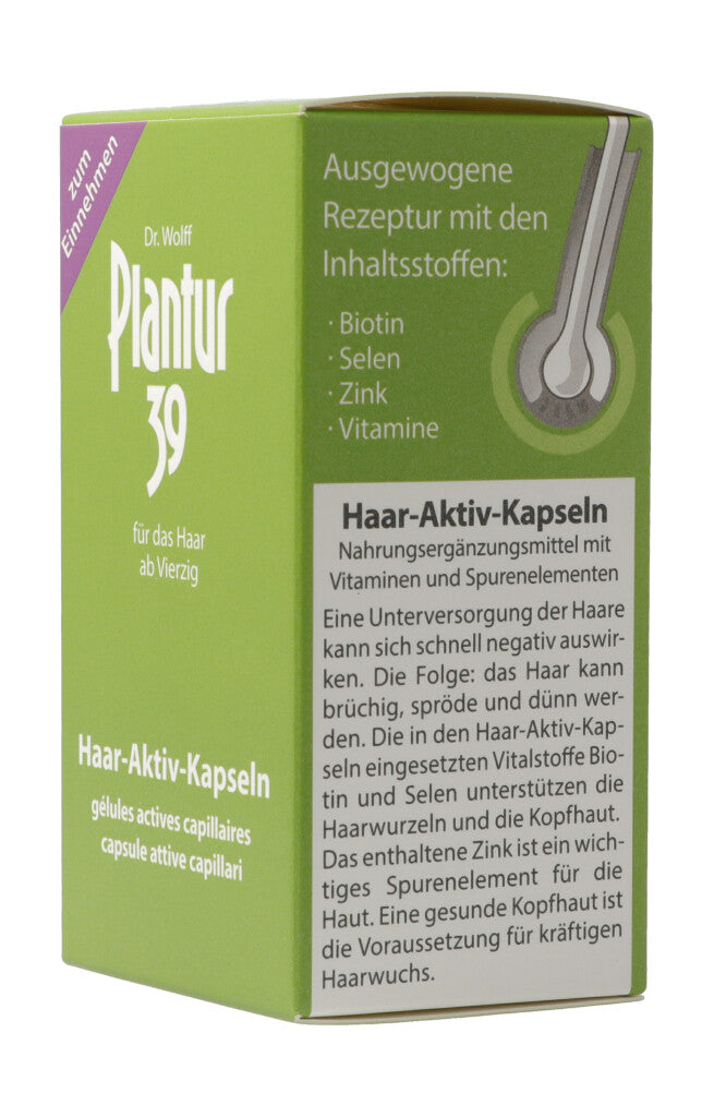 Haar-Aktiv-Kapseln. Nahrungsergänzungsmittel mit Vitaminen und Spurenelementen. Eine Unterversorgung der Haare kann sich schnell negativ auswirken. Die Folge: Das Haar kann brüchig, spröde und dünn werden. Die in den Haar-Aktiv-Kapseln eingesetzten Vitalstoffe Biotin und Selen unterstützen die Haarwurzeln und die Kopfhaut. Das enthaltene Zink ist ein wichtiges Spurenelement für die Haut. Eine gesunde Kopfhaut ist die Voraussetzung für kräftigen Haarwuchs.