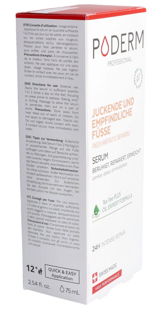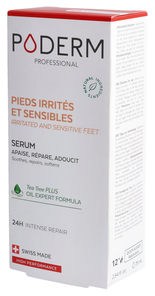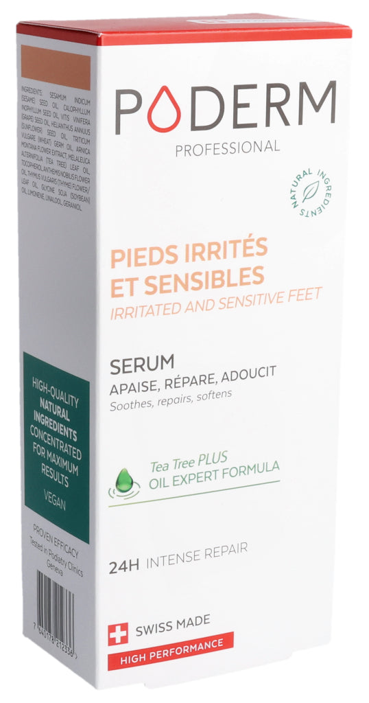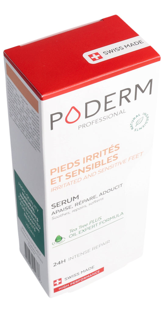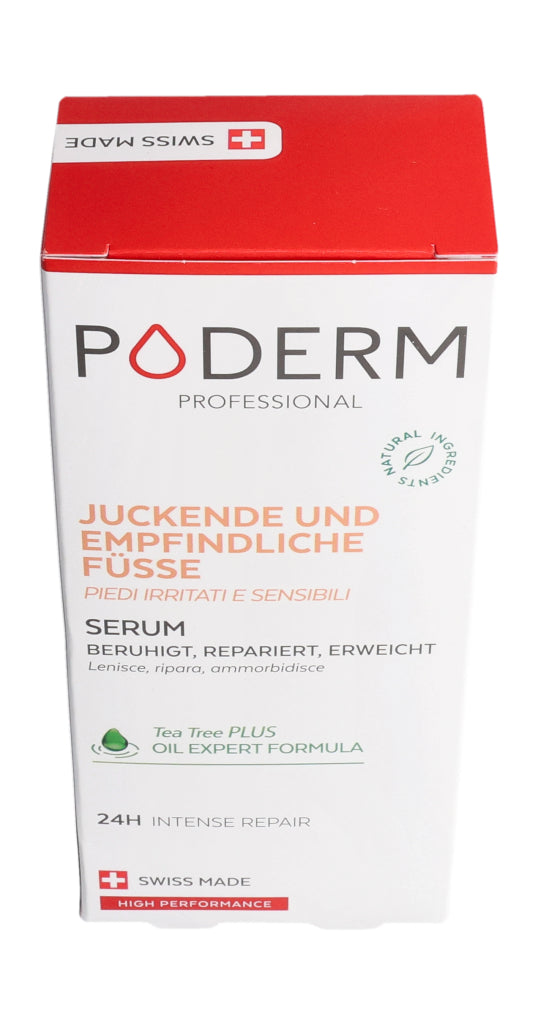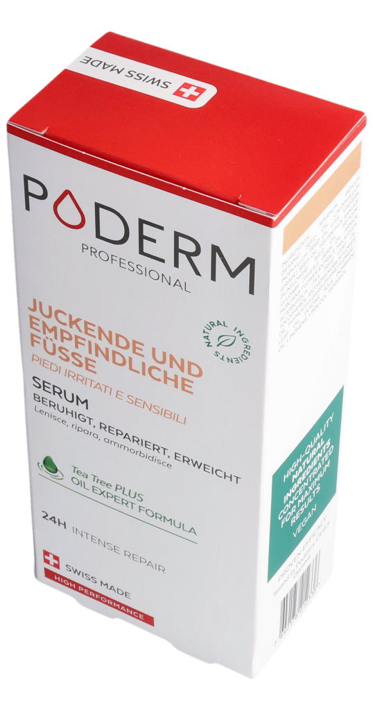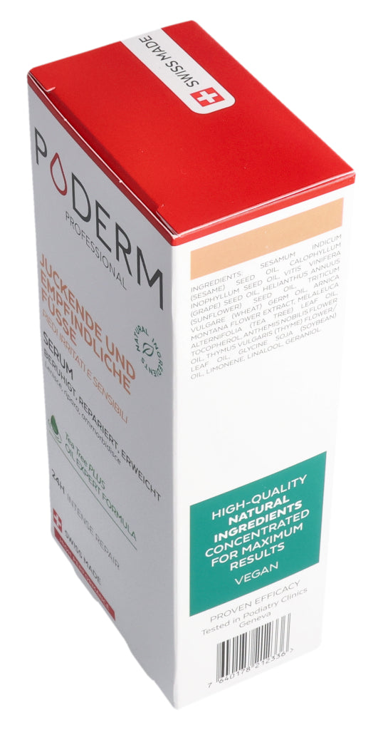 Das PODERM® Irritierte und empfindliche Füße Serum wurde speziell für Menschen mit empfindlicher, trockener und zu Neurodermitis neigender Haut entwickelt, die gereizte, erhitzte oder trockene Stellen aufweisen kann.