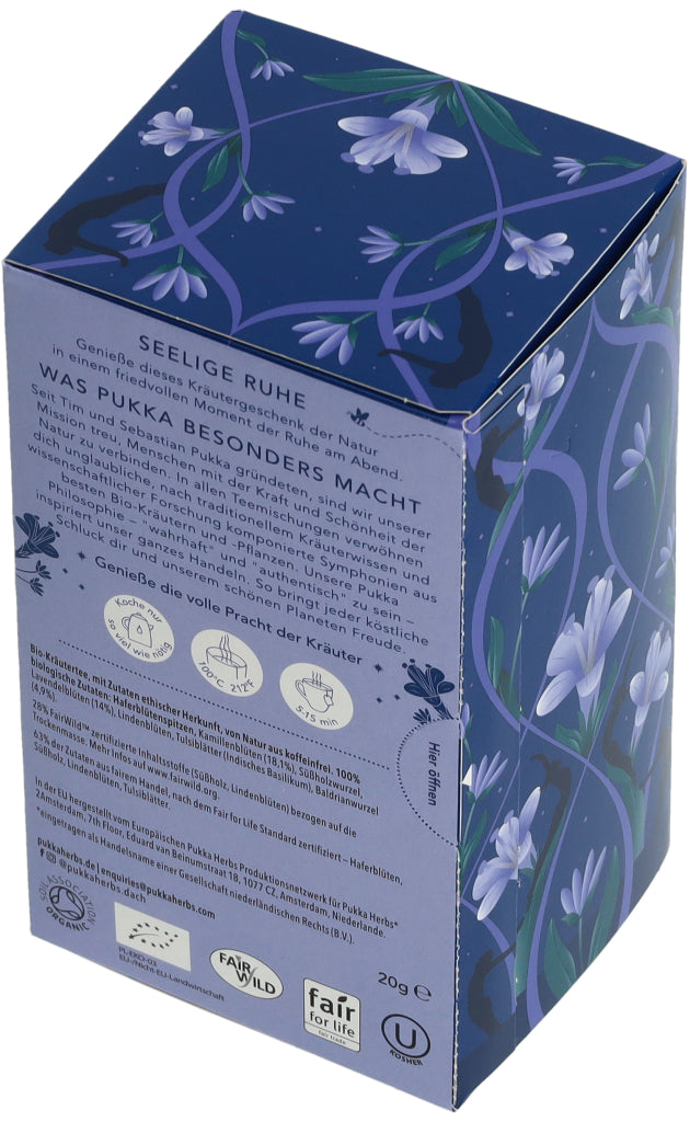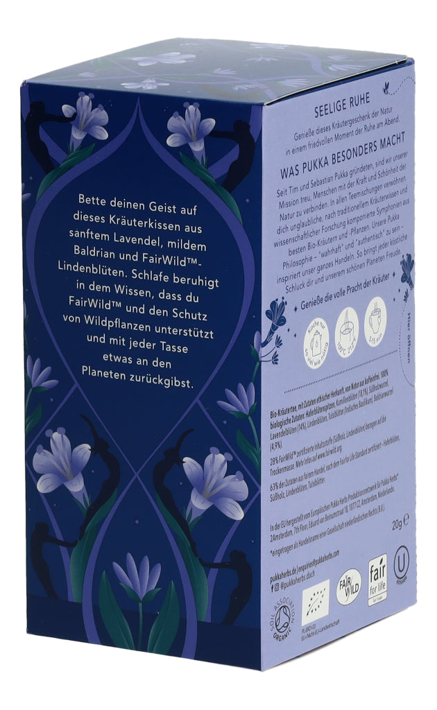 Träume süss. Die Nacht wird lang, wenn du nicht zur Ruhe kommst. Wie schön, dass die Natur uns linde Kräuter für dieses koffeinfreie Gute-Nacht-Tässchen schenkt. Ein Kräutertraum aus sanften Haferblütenspitzen, mildem Lavendel und seidigsüsser Lindenblüte. Lass Frieden einkehren und deine süssen Träume beginnen.