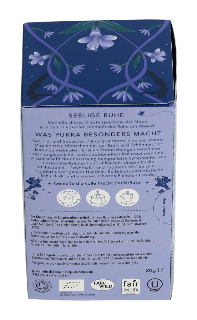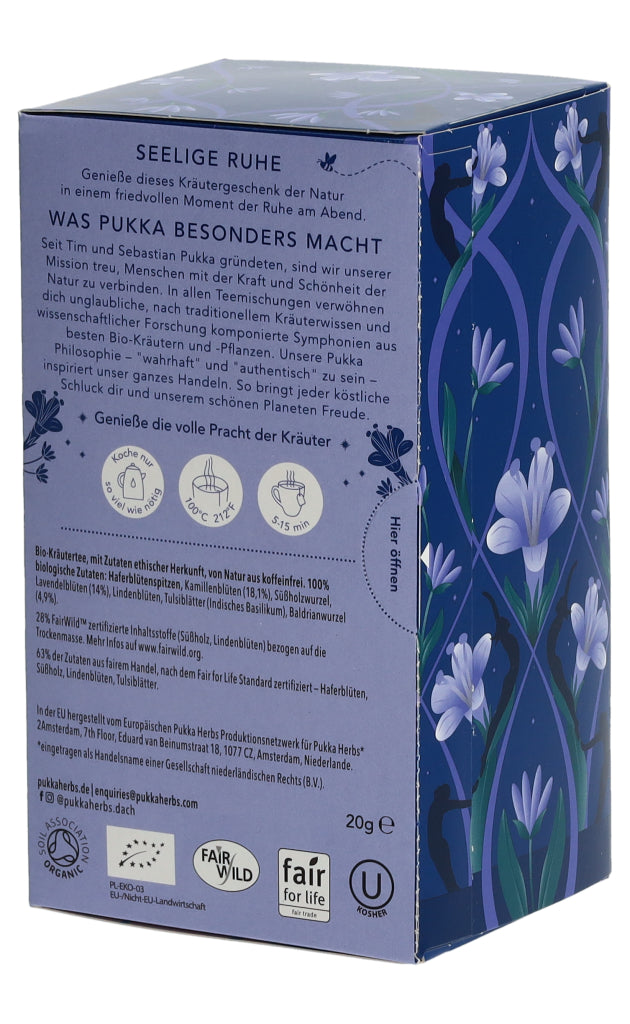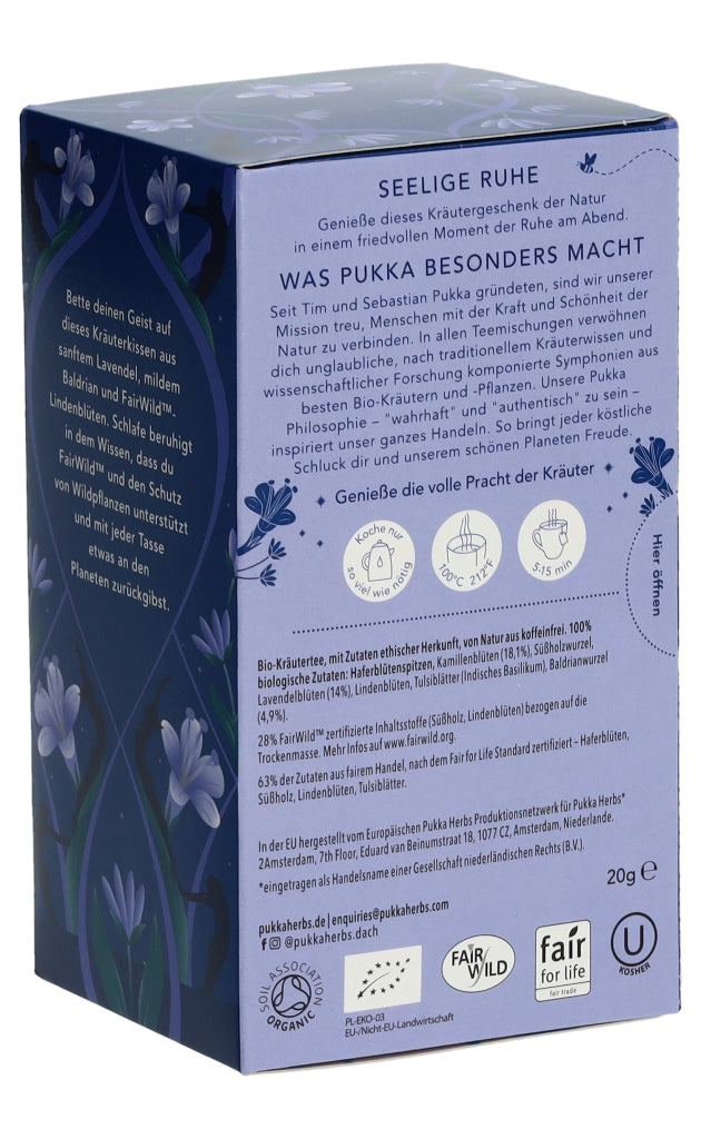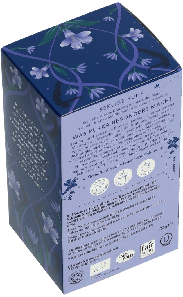 Zubereitung: Immer mit kochendem Wasser aufgiessen und 5 bis 15 Minuten ziehen lassen. Koche nur so viel Wasser, wie du brauchst. Damit hilfst du, jede Tasse Pukka Tee so nachhaltig wie möglich zu machen.