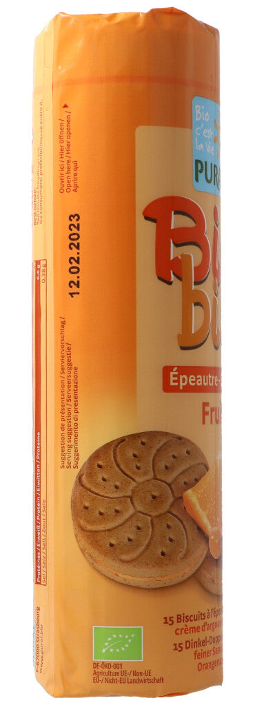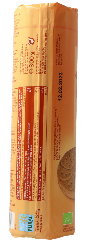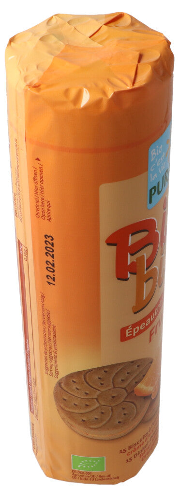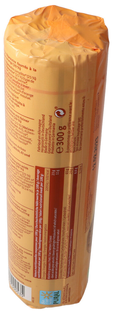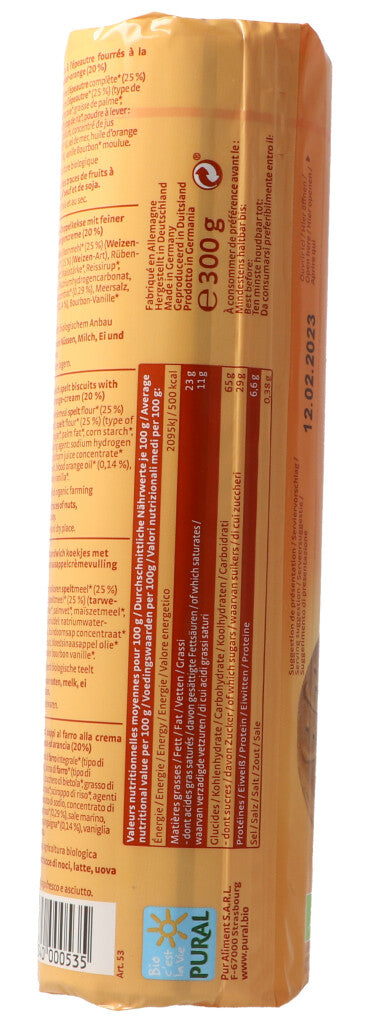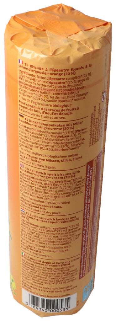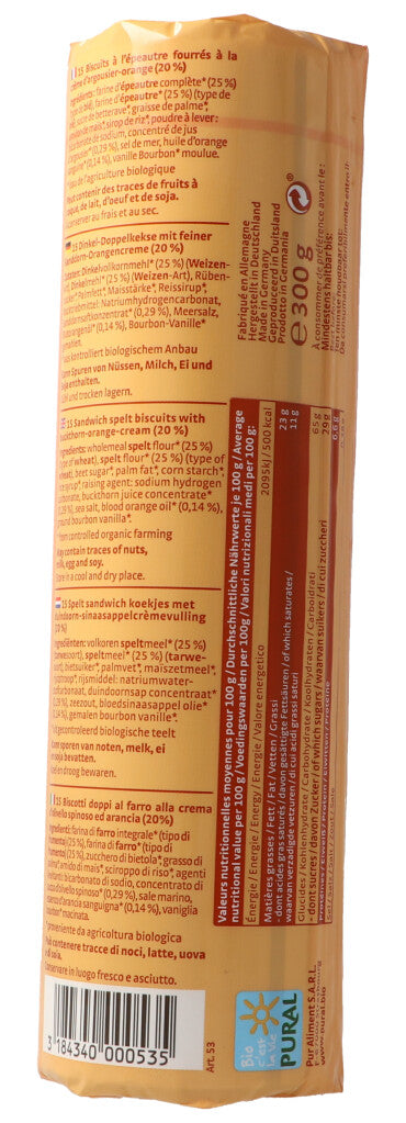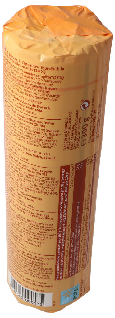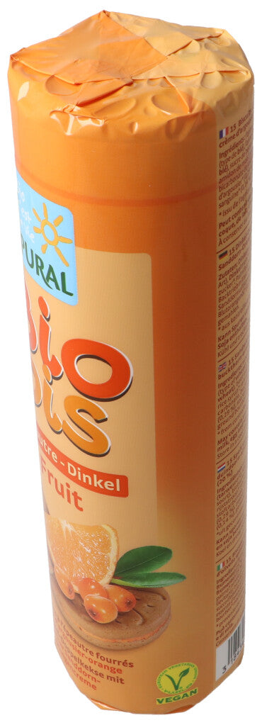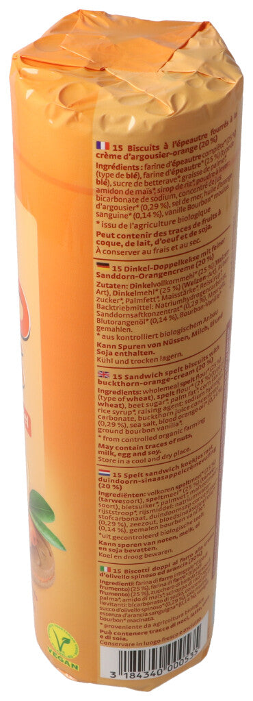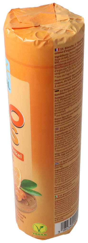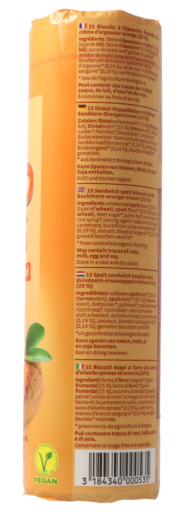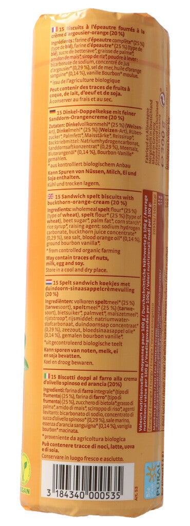 Dinkelvollkornmehl* (25%) (Weizenart), Dinkelmehl* (25 %) (Weizenart), Rübenzucker*, Palmfett*, Maisstärke*, Reissirup*, Backtriebmittel: Natriumhydrogencarbonat, Sanddornsaftkonzentrat* (0,29%), Meersalz , Blutorangenöl* (0,14%), Bourbon-Vanille gemahlen*. *aus kontrolliert biologischem Anbau..