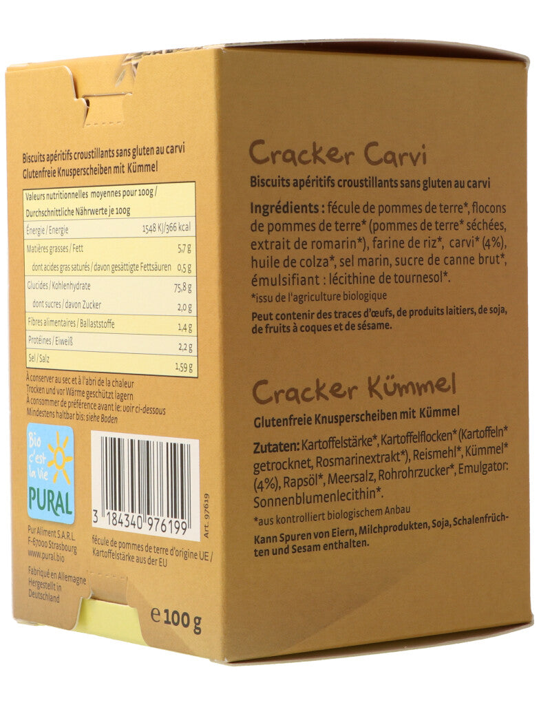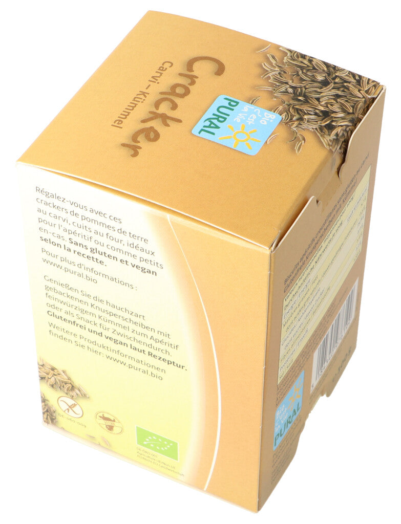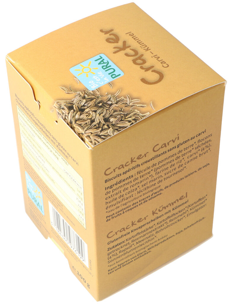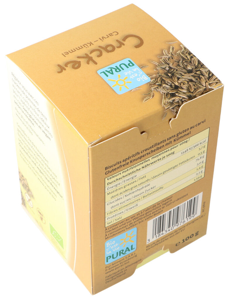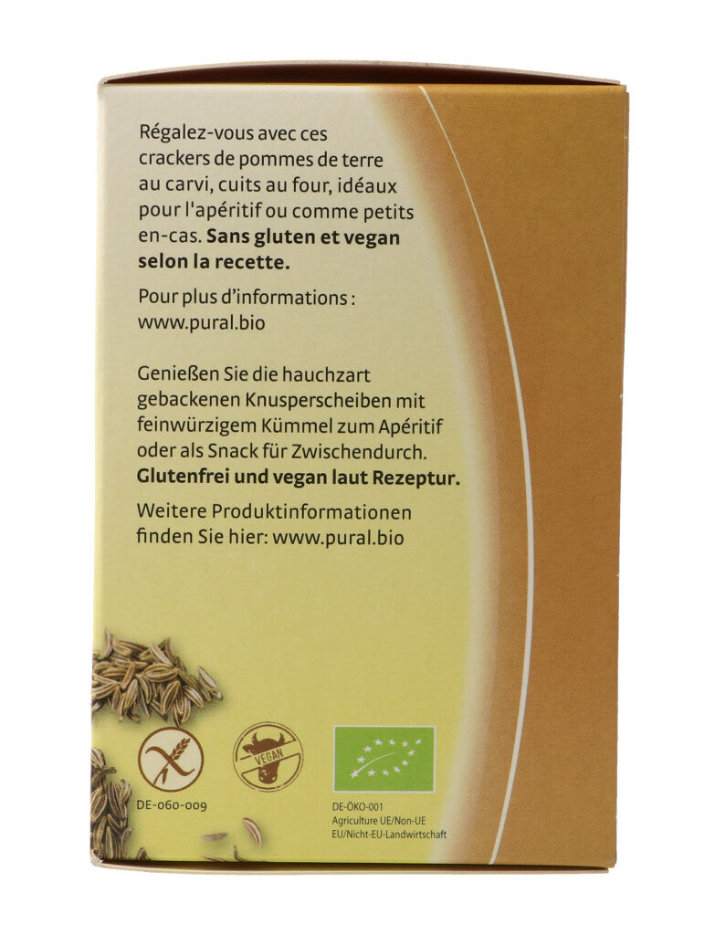 Kartoffelstärke*, Kartoffelflocken* (Kartoffeln getrocknet*, Rosmarinextrakt*), Reismehl*, Kümmel* (4%), Rapsöl*, Meersalz, Rohrohrzucker*, Emulgator: Sonnenblumenlecithin*. *aus kontrolliert biologischem Anbau.
