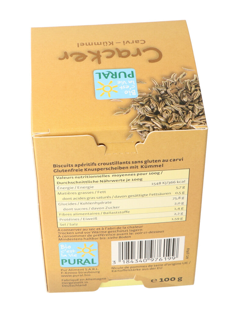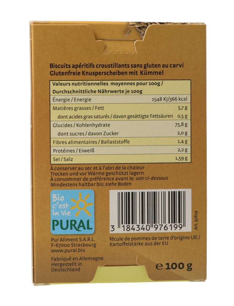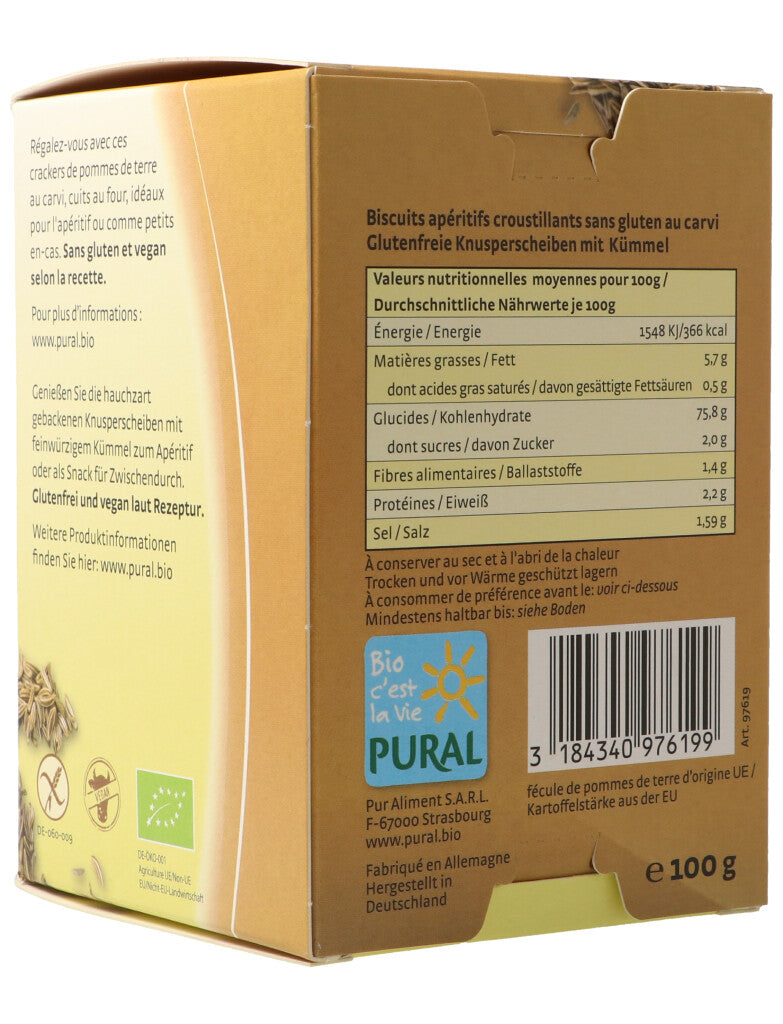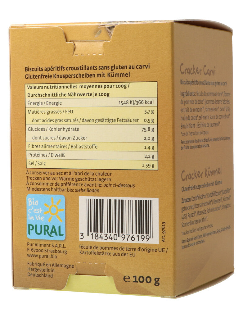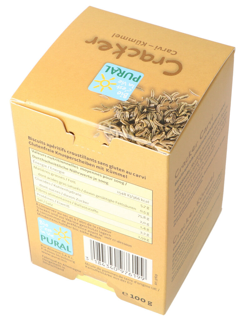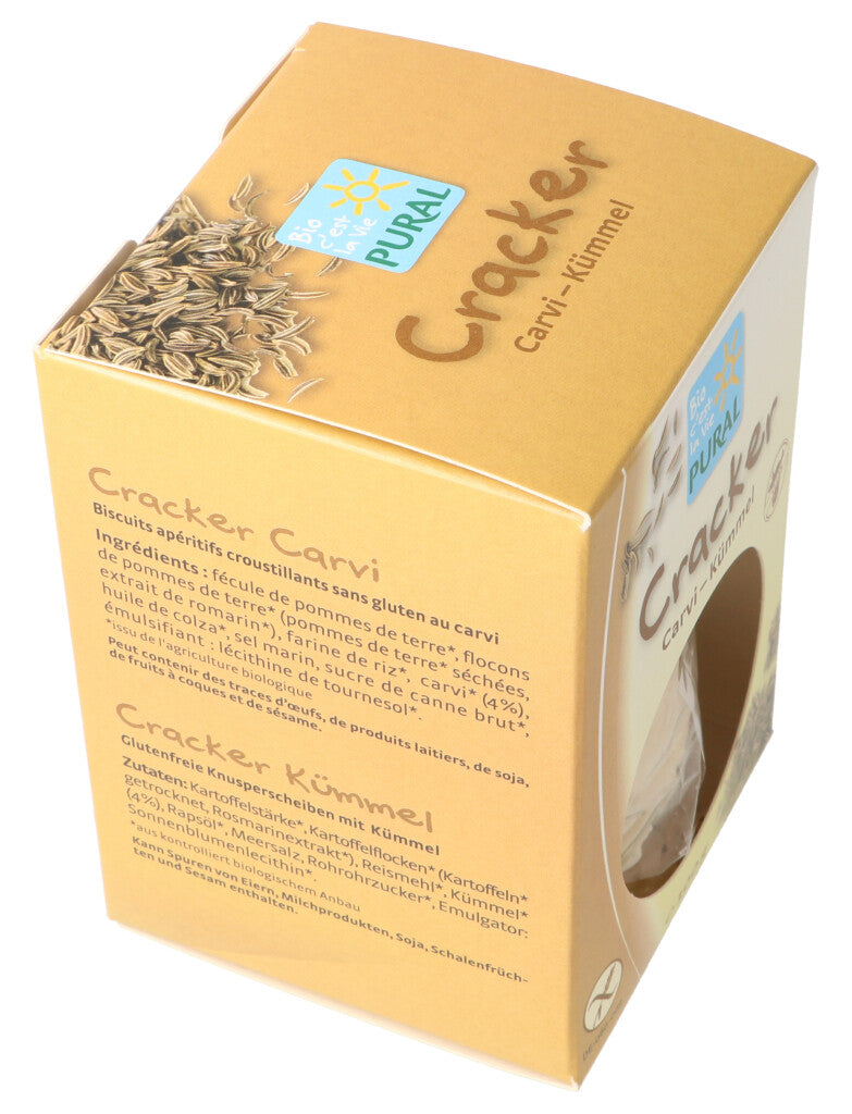 Kartoffelstärke*, Kartoffelflocken* (Kartoffeln getrocknet*, Rosmarinextrakt*), Reismehl*, Kümmel* (4%), Rapsöl*, Meersalz, Rohrohrzucker*, Emulgator: Sonnenblumenlecithin*. *aus kontrolliert biologischem Anbau.