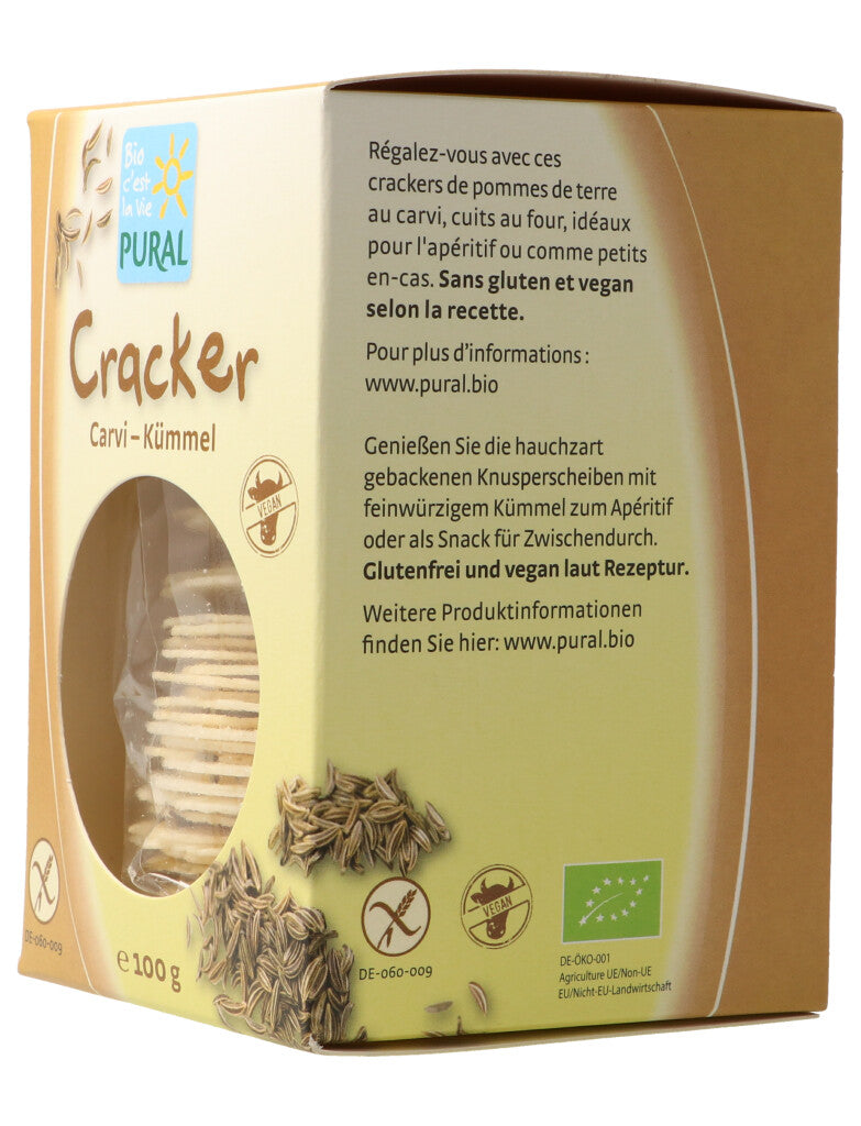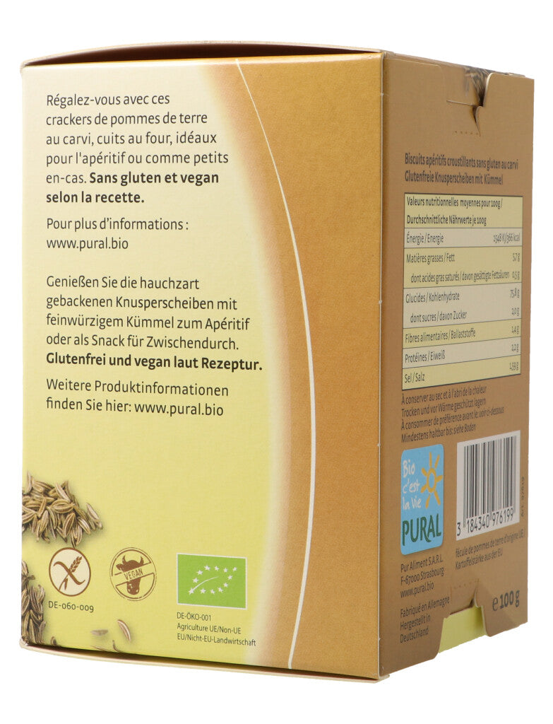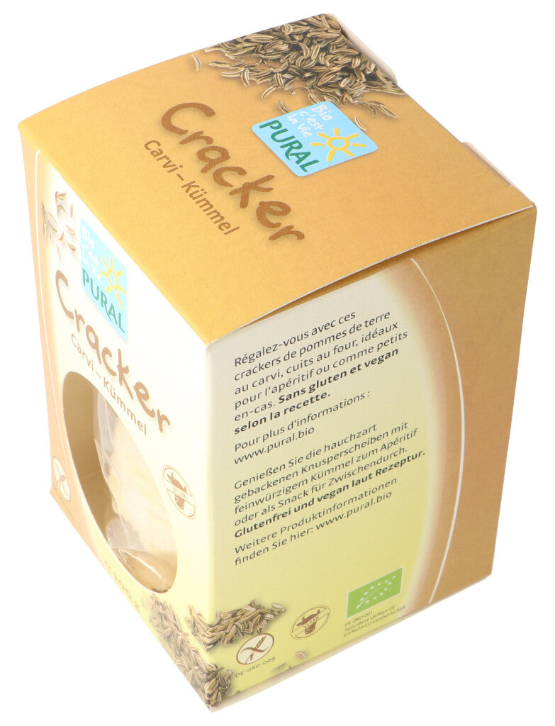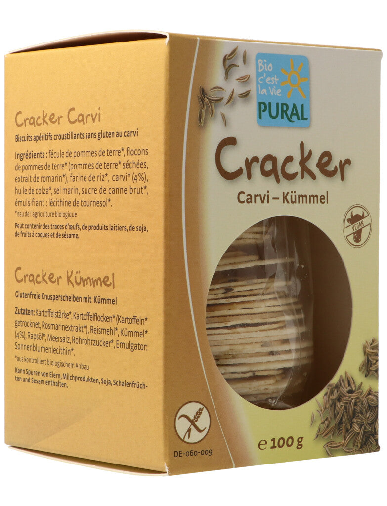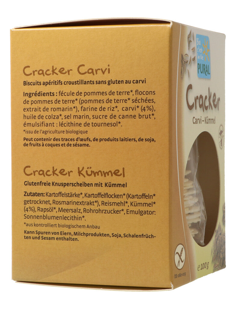 Kartoffelstärke*, Kartoffelflocken* (Kartoffeln getrocknet*, Rosmarinextrakt*), Reismehl*, Kümmel* (4%), Rapsöl*, Meersalz, Rohrohrzucker*, Emulgator: Sonnenblumenlecithin*. *aus kontrolliert biologischem Anbau.