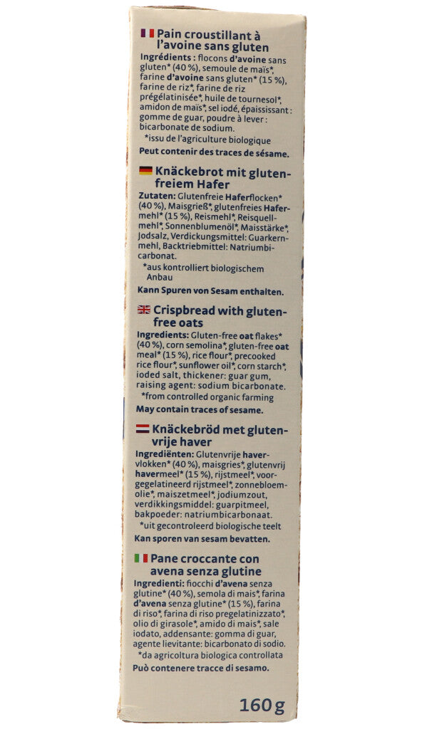 Glutenfreie Haferflocken* (40%), Maisgriess*, glutenfreies Hafermehl* (15%), Reismehl*, Reisquellmehl*, Sonnenblumenöl*, Maisstärke*, Jodsalz, Verdickungsmittel: Guarkernmehl, Backtriebmittel: Natriumbicarbonat. *aus kotrolliert biologischem Anbau.