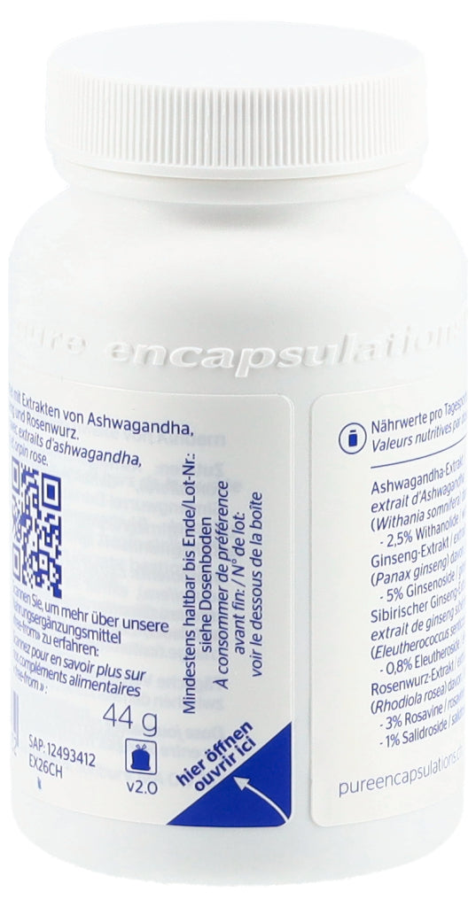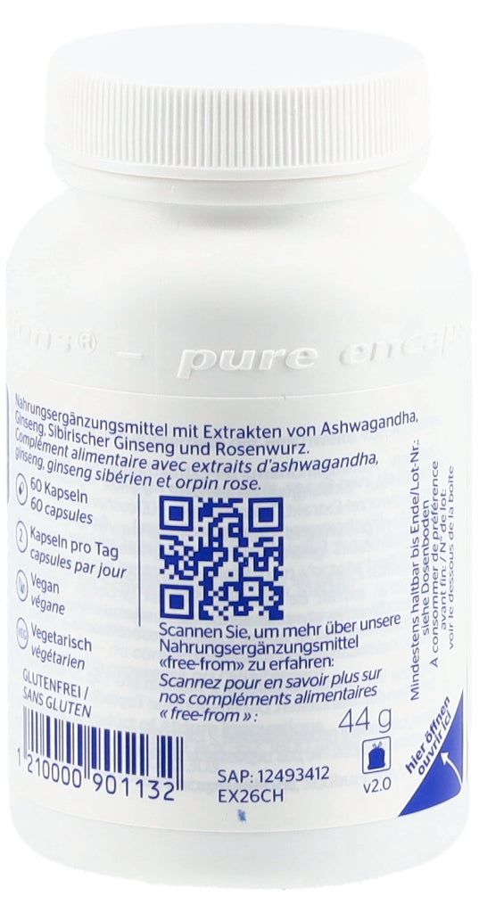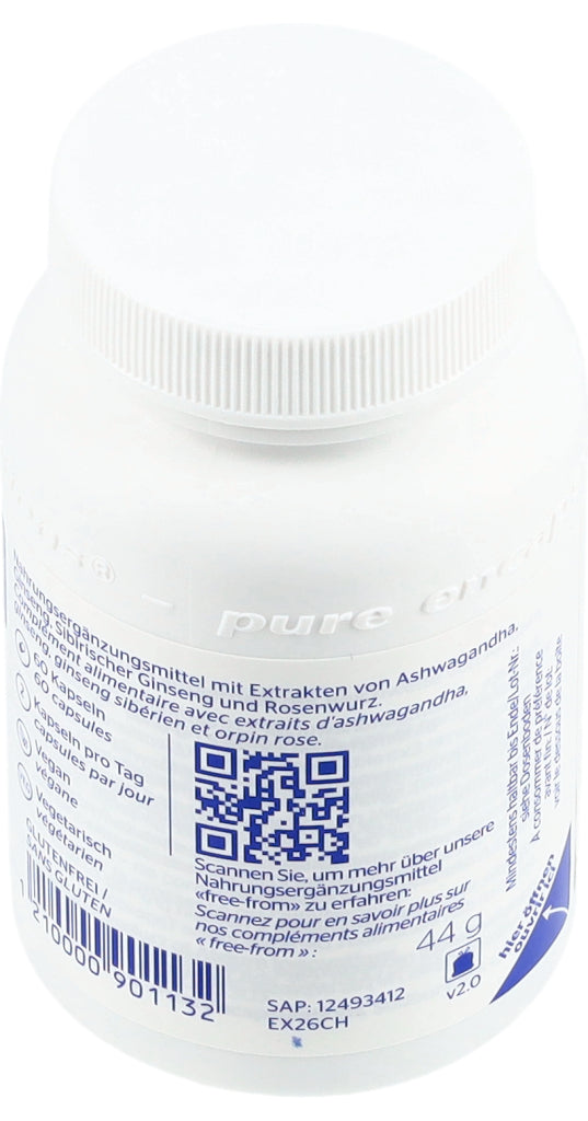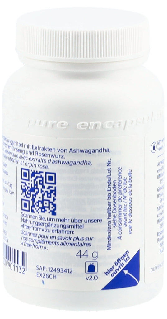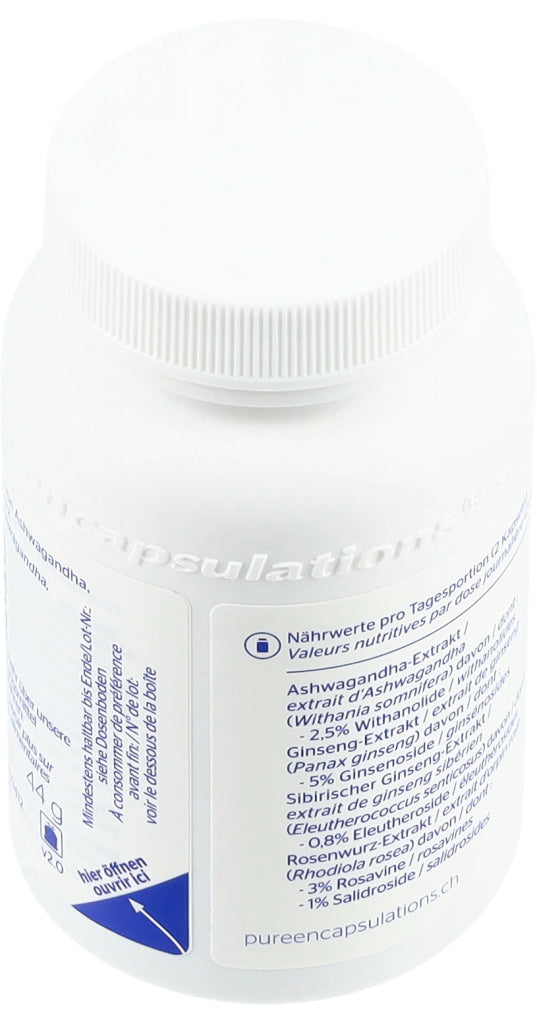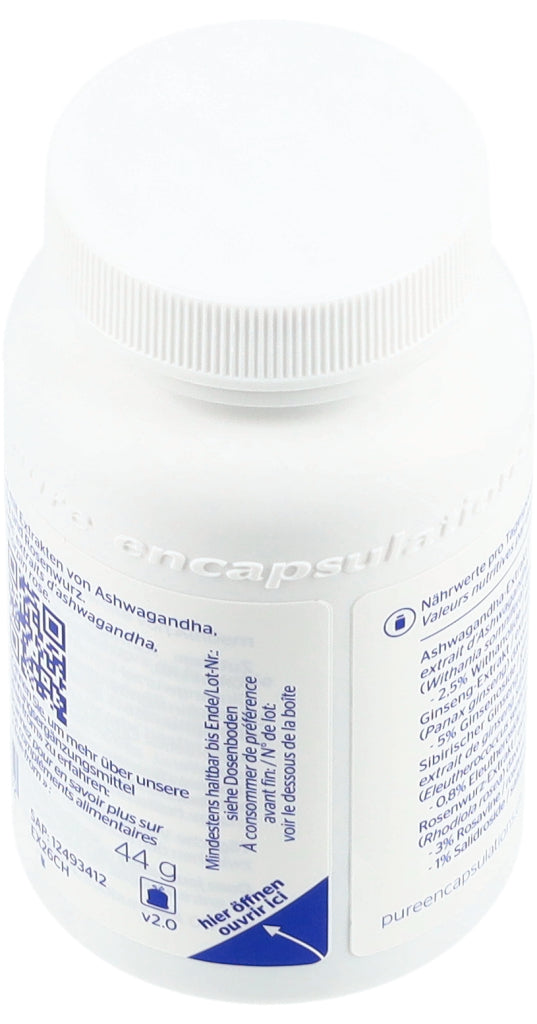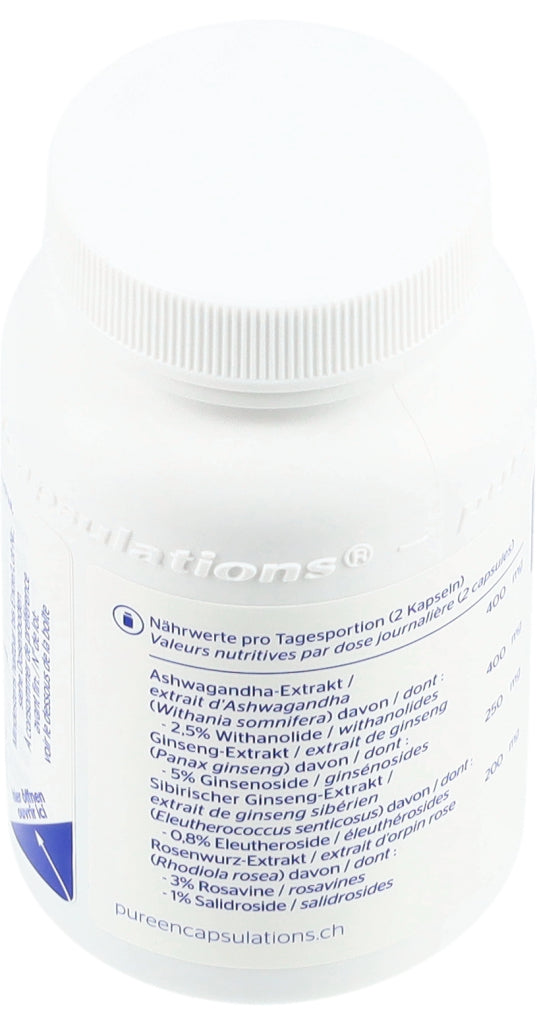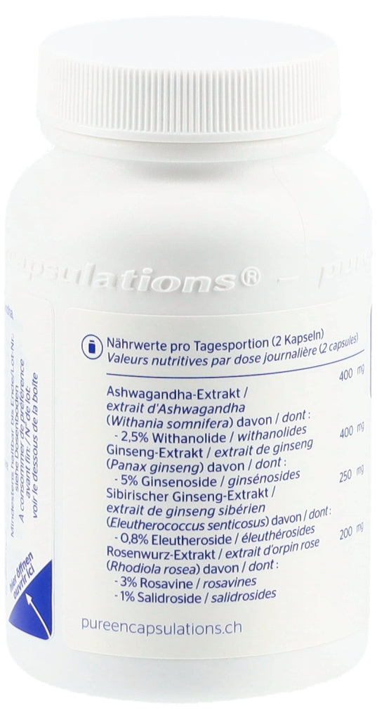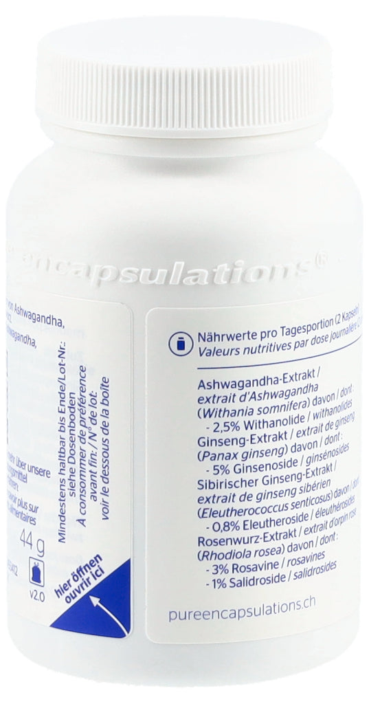 Ashwagandhawurzel-Extrakt/Indischer Ginseng (Withania somnifera), Ginsengwurzel-Extrakt (Panax ginseng), Sibirischer Ginsengwurzel-Extrakt/ Taigawurzel (Eleutherococcus senticosus), Kapsel (Hydroxypropyl-methylcellulose), Rosenwurz-Wurzelextrakt (Rhodiola rosea), Füllstoff (mikrokristalline Cellulose).
