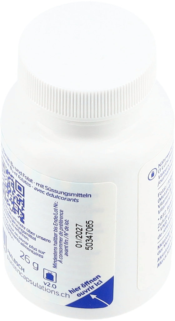 • B12 Folat unterstützt als Lutschtablette die optimale Versorgung mit Vitamin B12 und Folat. Dabei wird für die Aufnahme der aktive Transportmechanismus und auch die passive Diffusion über die Mundschleimhaut und den Dünndarm genutzt.