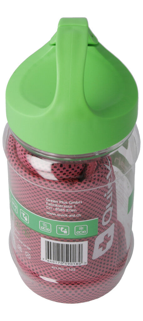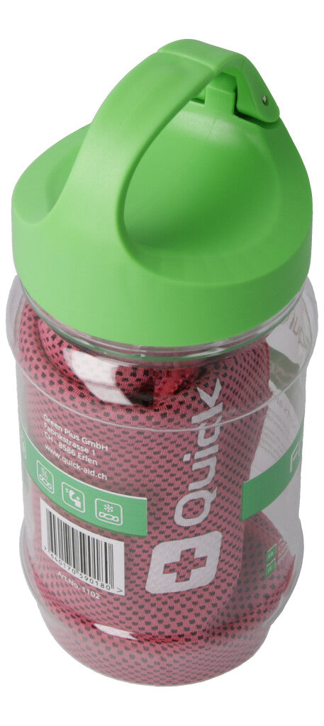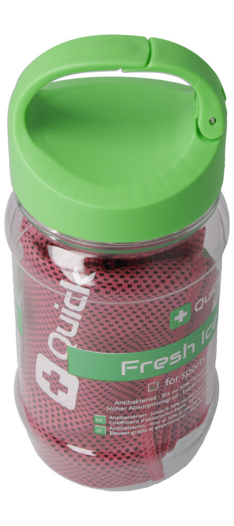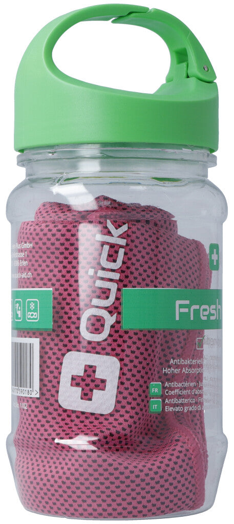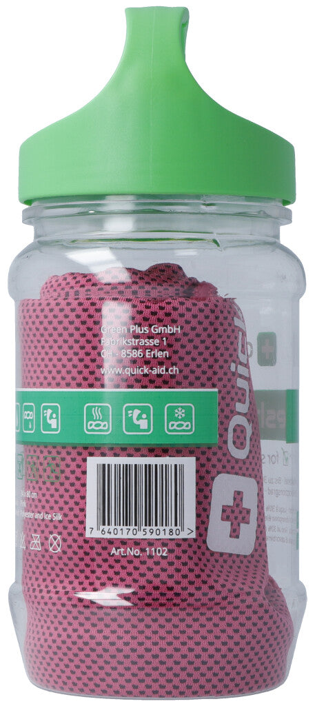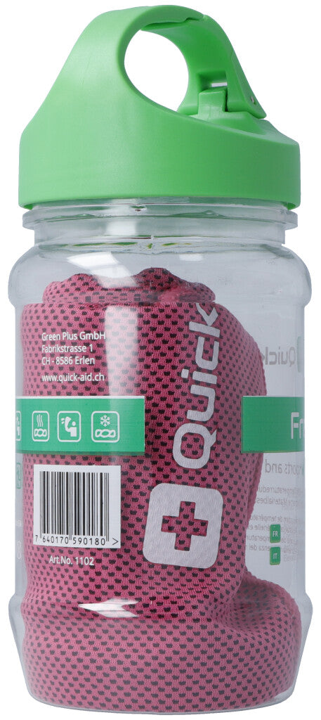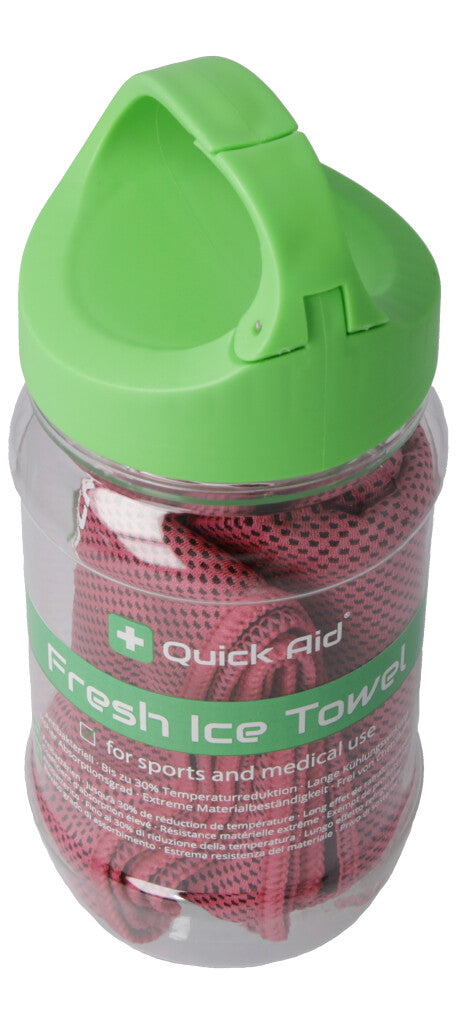 Quick Aid Fresh Ice Towel ist ein Mikrofasertuch in der Grösse 34x80cm, welches für sportliche Aktivitäten und für medizinische Zwecke verwendet werden kann. Ist das Tuch trocken, ist es saugfähig und schützt den Träger vor Sonneneinstrahlung. Wird das Tuch mit Wasser genässt und ausgedrückt, kann es eine Temperaturreduktion von bis zu 30% erreichen. Nun eignet es sich optimal zum Kühlen diversen Körperstellen, wie beispielsweise Nacken, Stirn oder Glieder. Das Tuch kann beliebig oft eingesetzt werden und funktioniert komplett chemiefrei.