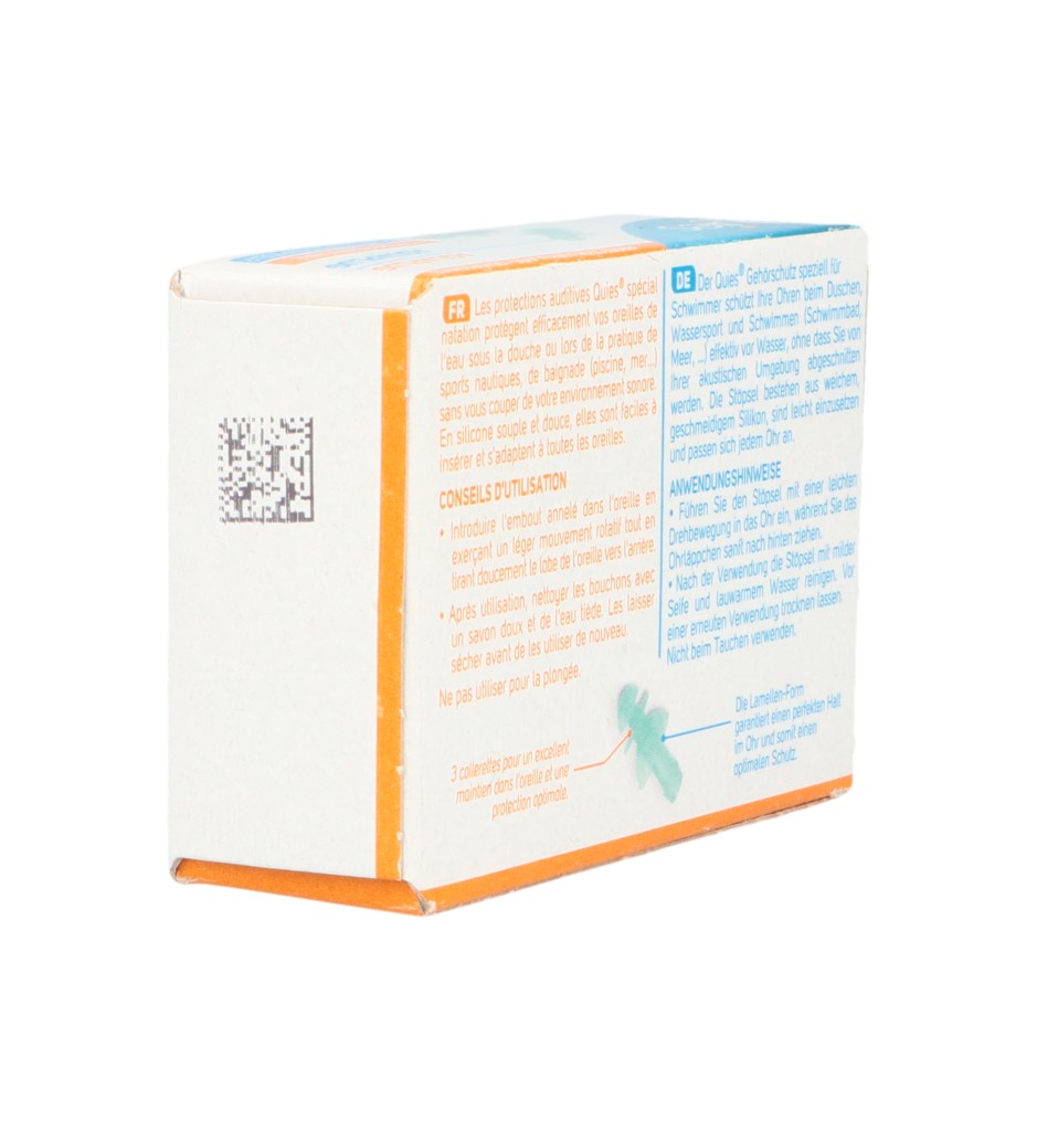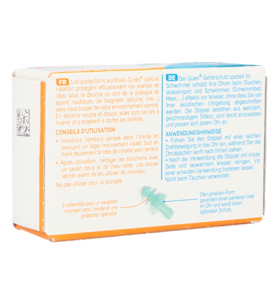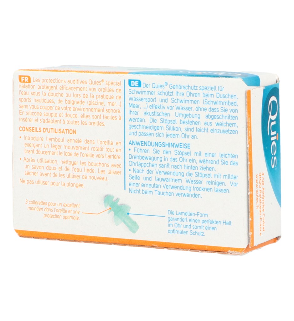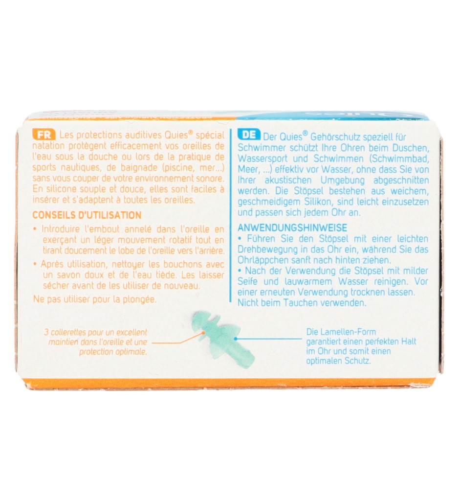 Der Quies Gehörschutz speziell für Schwimmer schützt Ihre Ohren beim Duschen, Wassersport und Schwimmen (Schwimmbad, Meer, …) effektiv vor Wasser, ohne dass Sie von Ihrer akustischen Umgebung abgeschnitten werden. Die Stöpsel bestehen aus weichem, geschmeidigem Silikon, sind leicht einzusetzen und passen sich jedem Ohr an. Anwendungshinweise: Führen Sie den Stöpsel mit einer eichten Drehbewegung in das Ohr ein, während Sie das Ohrläppchen sanft nach hinten ziehen. Nach der Verwendung die Stöpsel mit milder Seife und lauwarmem Wasser reinigen. Vor einer erneuten Verwendung trocknen lassen. Nicht beim Tauchen verwenden. Die Lamellen-Form garantiert einen perfekten Halt in Ohr und somit einen optimalen Schutz.