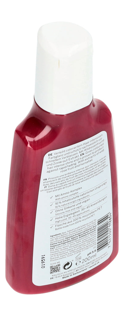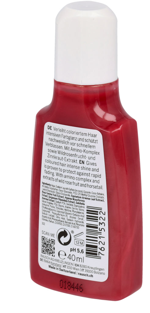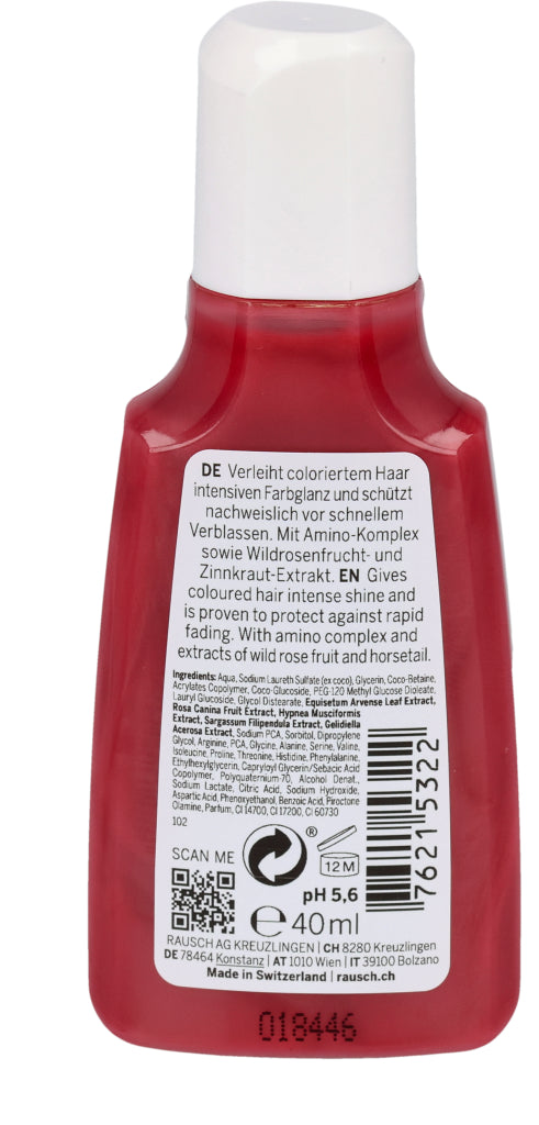 Das Farbschutz-Shampoo mit Wildrose ist sehr ergiebig. Eine Flasche reicht je nach Haarlänge für 30 – 45 Anwendungen. Die Formulierung besteht zu 91 % aus Inhaltsstoffen natürlichen Ursprungs, ist vegan und silikonfrei. Die Extrakte werden im hauseigenen Extraktionsverfahren in Kreuzlingen in der Schweiz hergestellt. Hier wird auch das Shampoo entwickelt und produziert.
