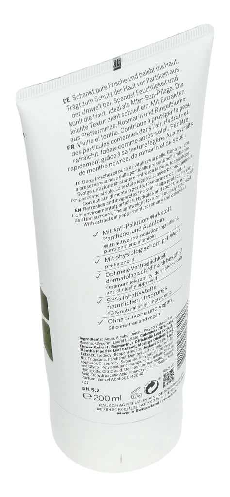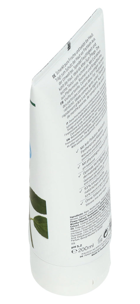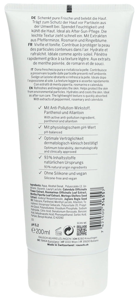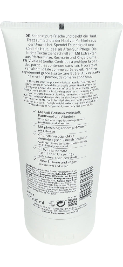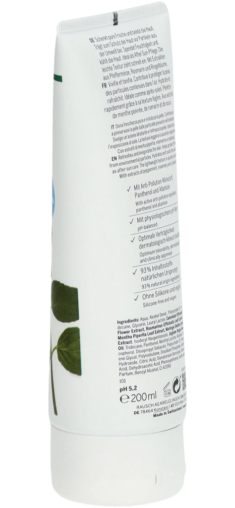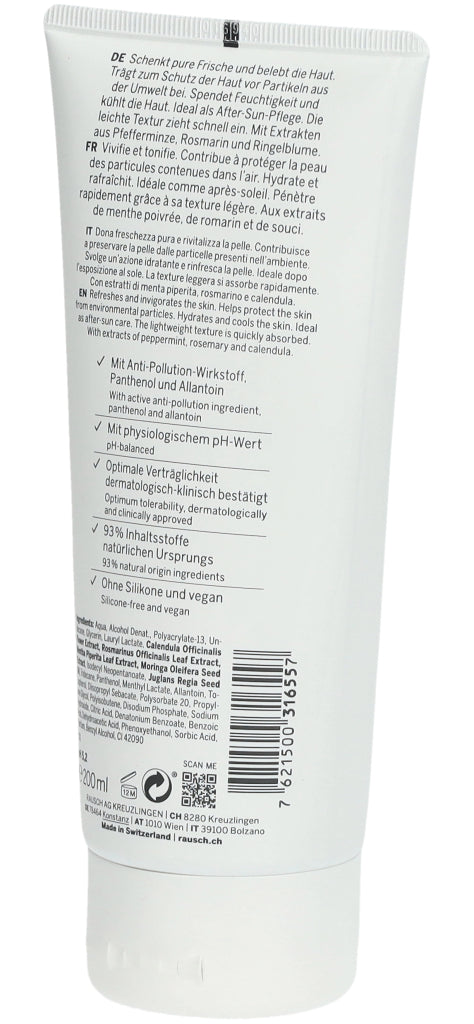 Schenkt pure Frische und belebt die Haut. Trägt zum Schutz der Haut vor Partikeln aus der Umwelt bei. Spendet Feuchtigkeit und kühlt die Haut. Ideal als After-Sun-Pflege- Die leichte Textur zieht schnell ein. Mit Extrakten aus Pfefferminze, Rosmarin und Ringelblume.