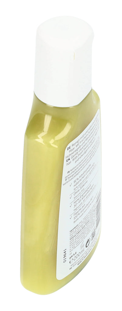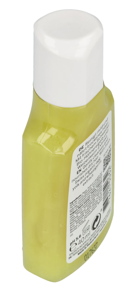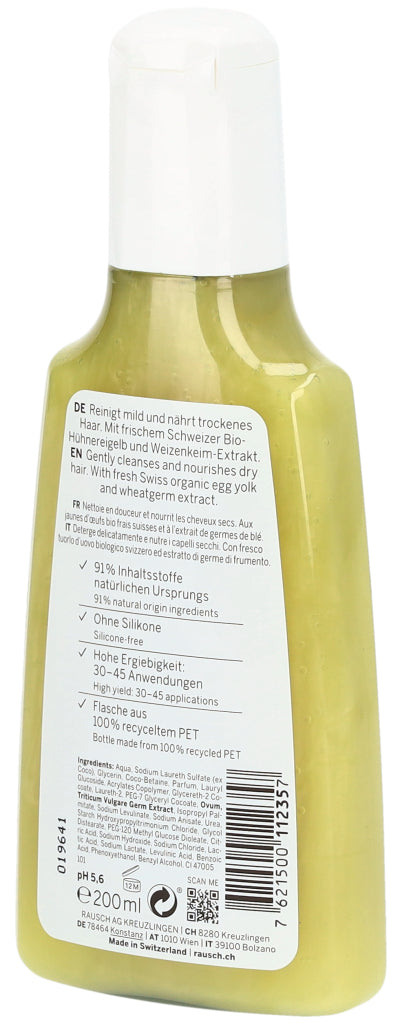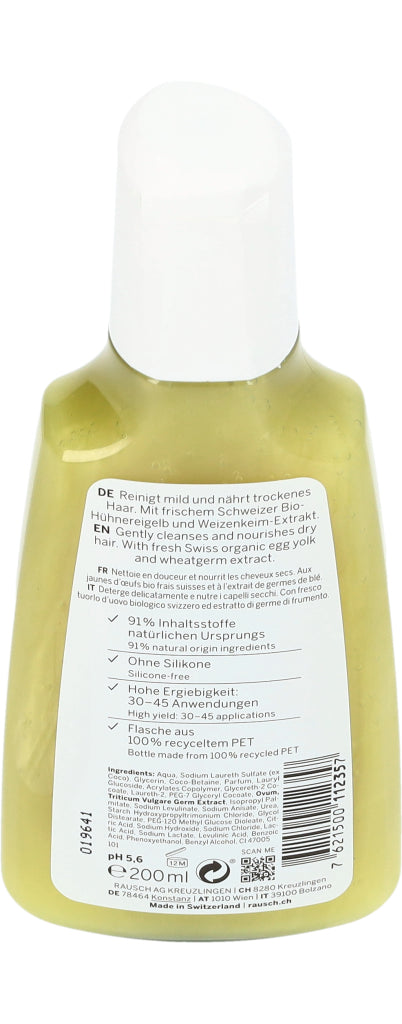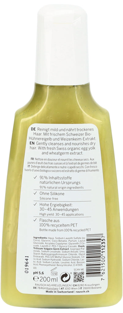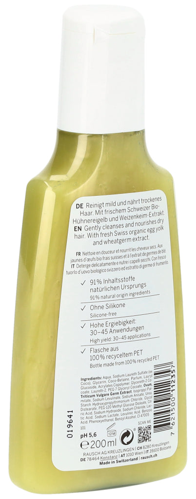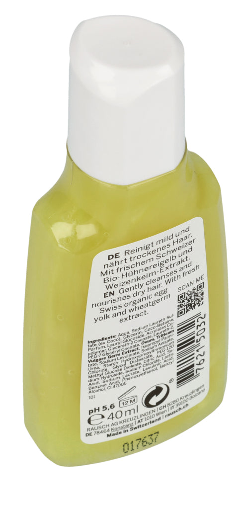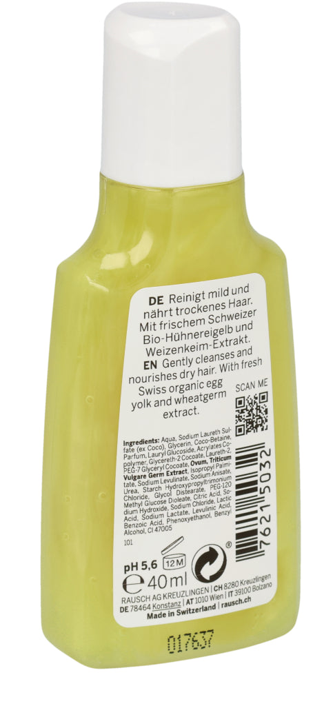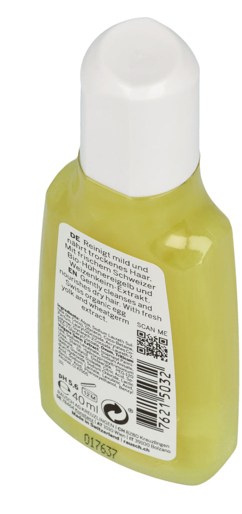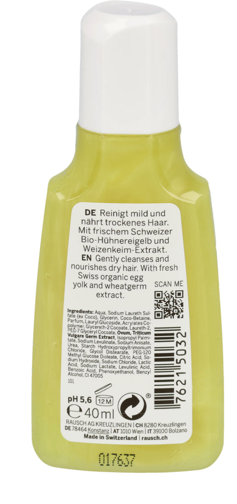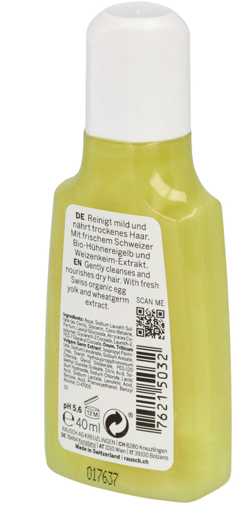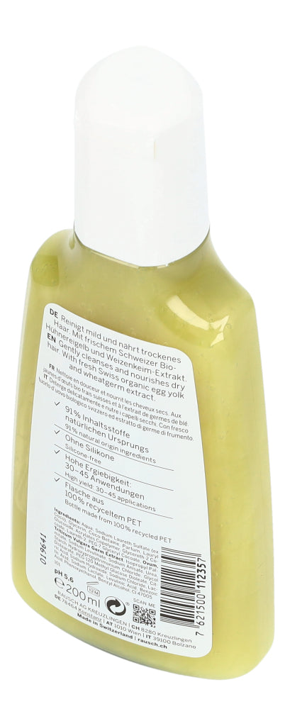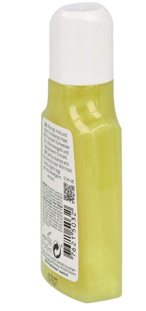 Reinigt mild und nährt trockenes Haar. Mit frischem Schweizer Bio-Hühnereigelb und Weizenkeim-Extrakt.