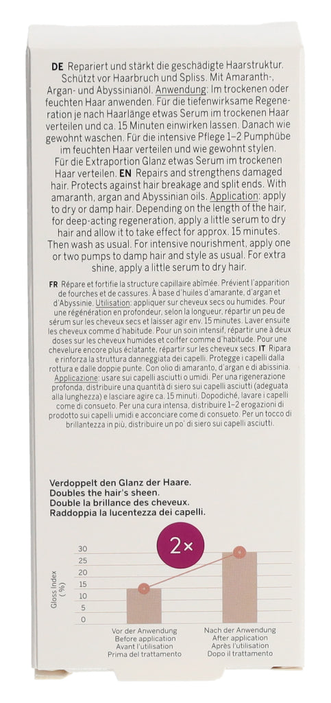 Das Repair-Serum mit Amaranth regeneriert und nährt geschädigtes Haar, repariert die Haarstruktur von Grund auf und schützt vor Haarbruch und Spliss. Schon 1 – 2 Pumphübe als Tiefenpflege in feuchtem Haar lassen Deine reparierte Haarpracht in neuem Licht erstrahlen. Ein weiteres Plus: Dank des hochwertigen Pump-Applikators ist es extrem ergiebig. Ein Tropfen des Serums verleiht dem Haar einen natürlichen, gesunden Glanz, ohne es zu beschweren und ist ideal als erste Hilfe bei Frizz.