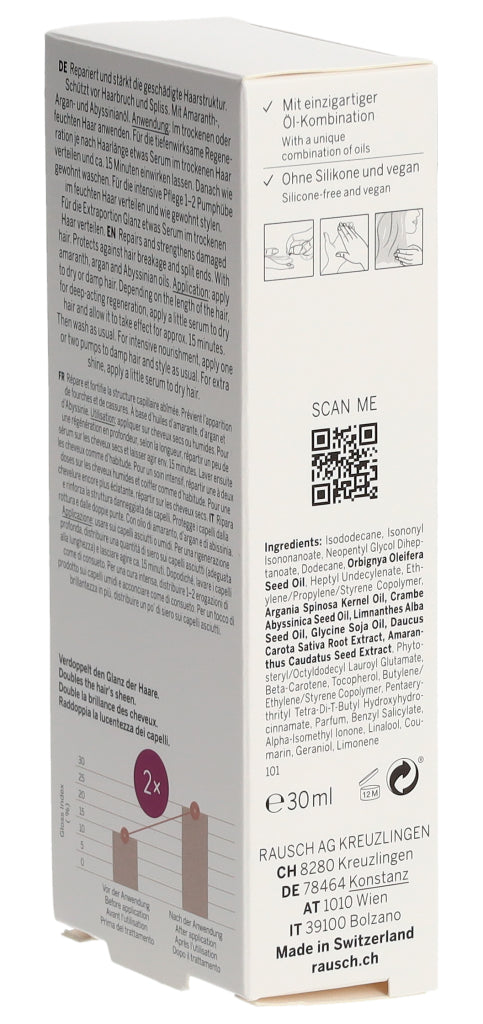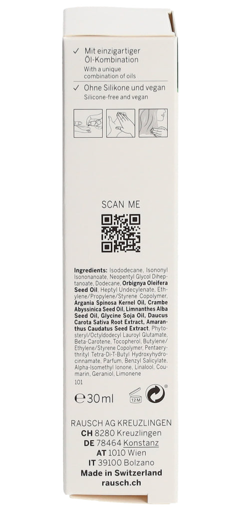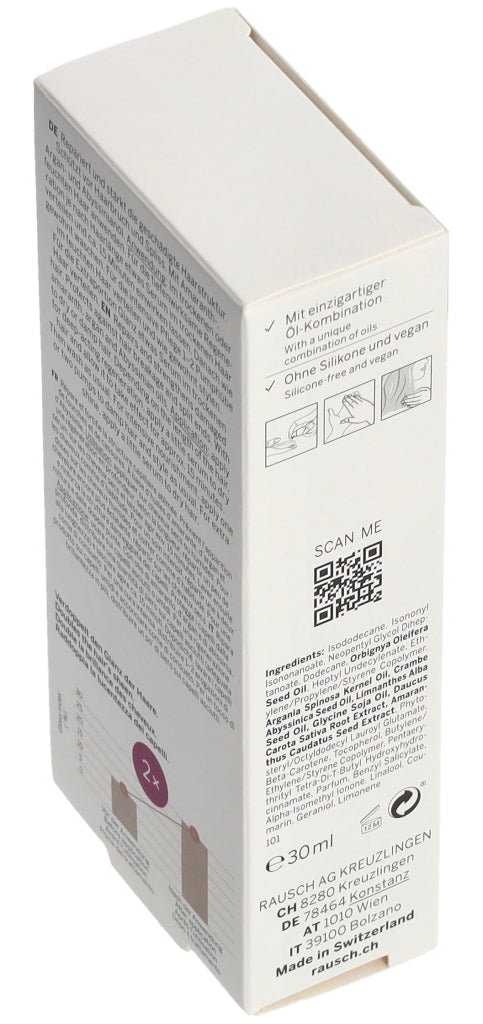 Die RAUSCH Expertinnen in Kreuzlingen am Bodensee haben das silikonfreie und vegane Serum mit einem einzigartigen Ölkomplex aus Amaranth-, Argan, Abyssinian- sowie Wiesenschaumkraut- und Babassuöl angereichert. Die reichhaltige Leave-in Pflege verströmt den ganzen Tag einen dezenten Duft nach Aprikose und floralen Noten.