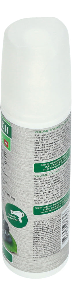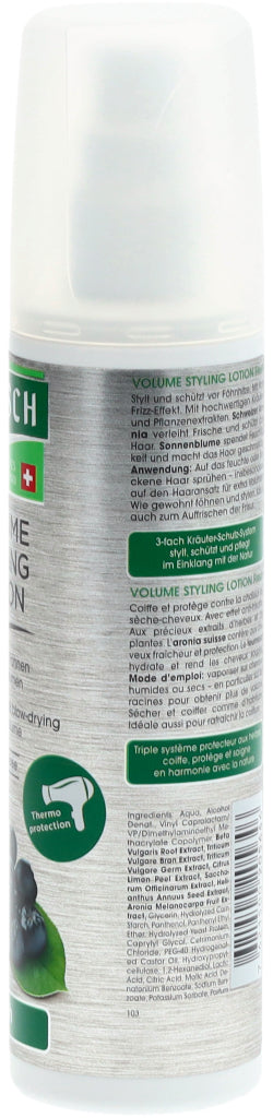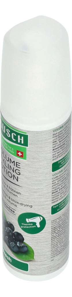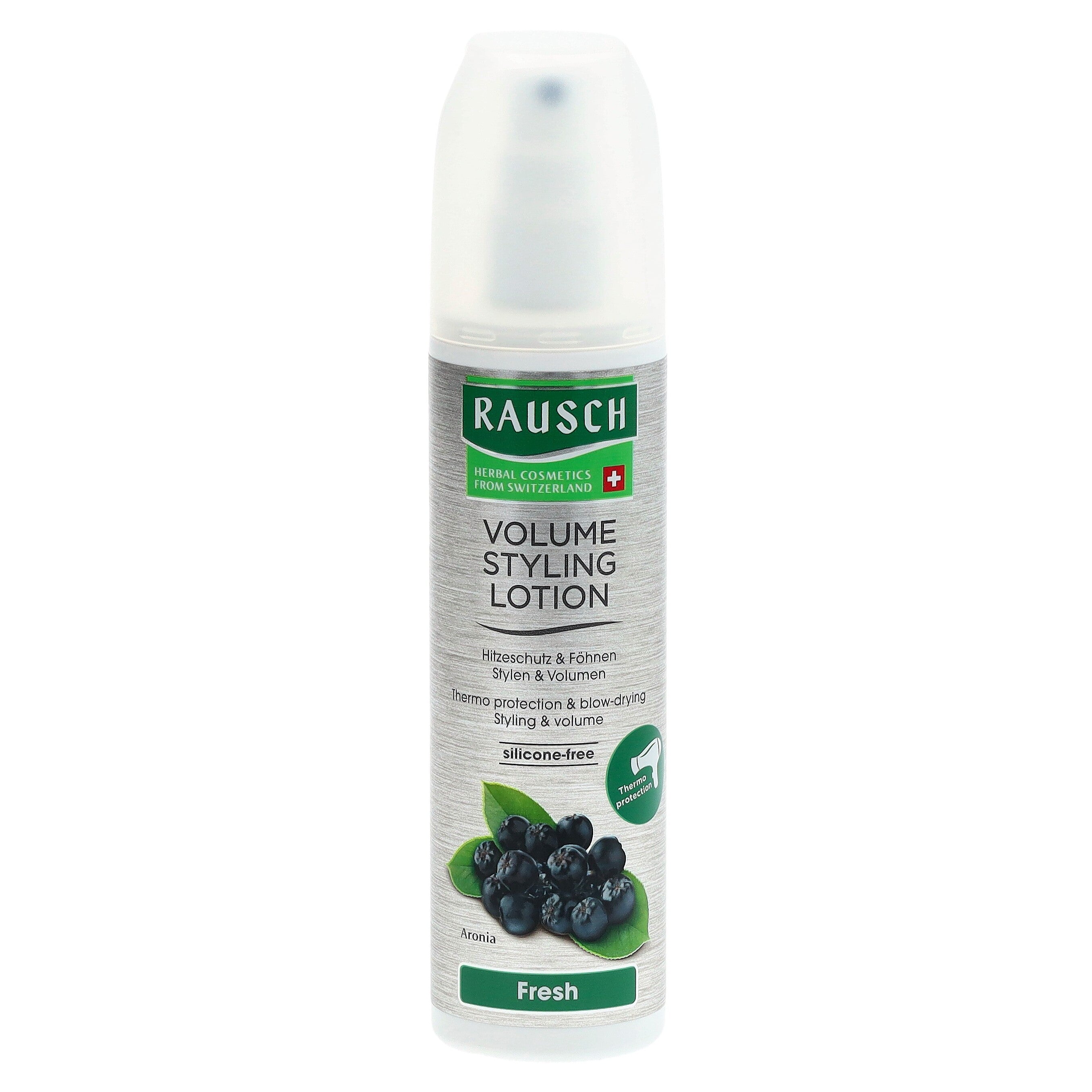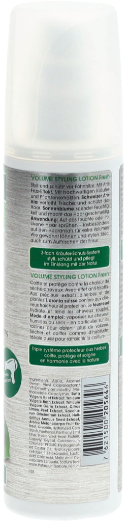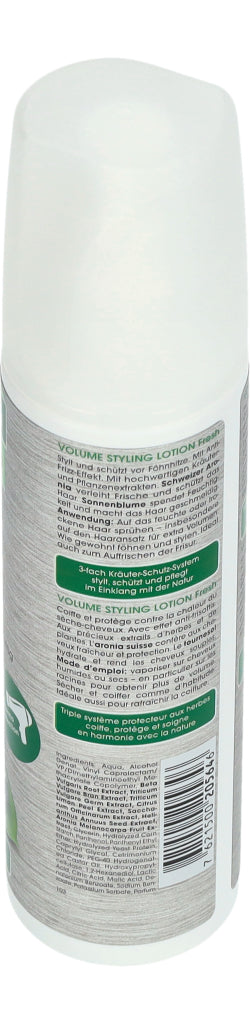 Rausch Volume Styling Lotion Fresh verleiht feinem Haar natürlichen Halt und verbessert das Volumen. Pflanzliche Extrakte aus Schweizer Aronia, Sonnenblume und Weizen bieten einen Schutz gegen Föhnhitze und erfrischen das Haar dank angenehmem Duft langanhaltend. Die Lotion wird auf den Haaransatz des trockenen oder feuchten Haares gesprüht. Danach wie gewohnt frisieren.