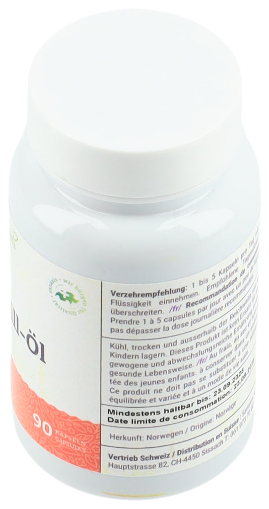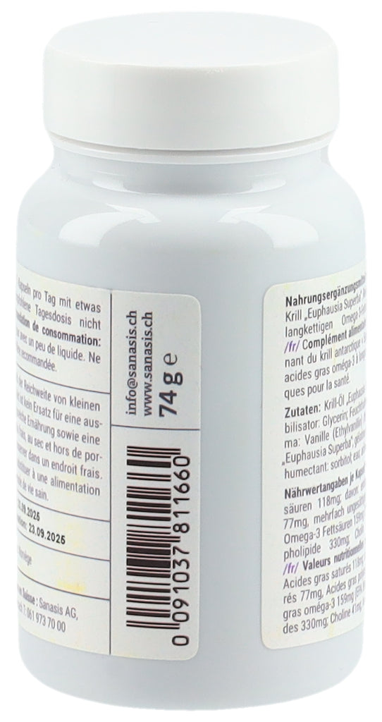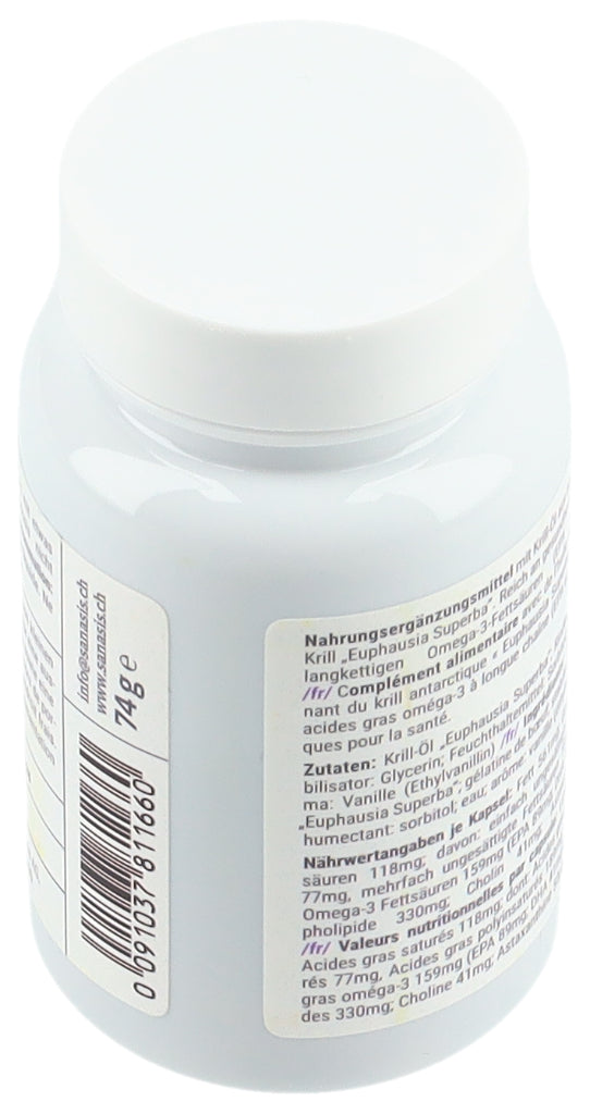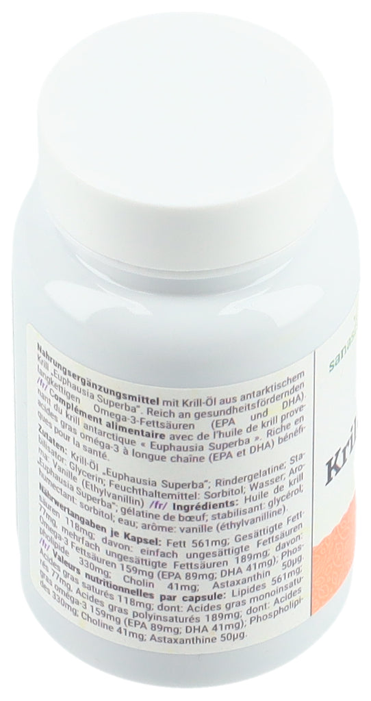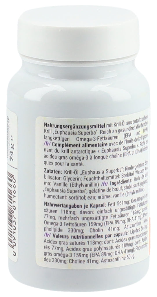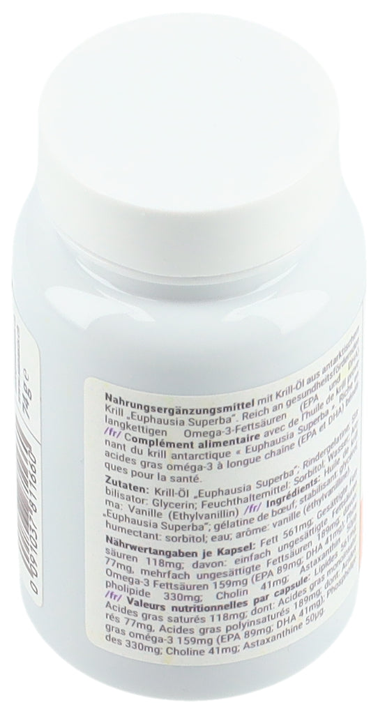 Mit Krill-Öl aus antarktischem Krill "Euphausia Superba". Reich an gesundheitsfördernden langkettigen Omega-3-Fettsäuren (EPA und DHA).
