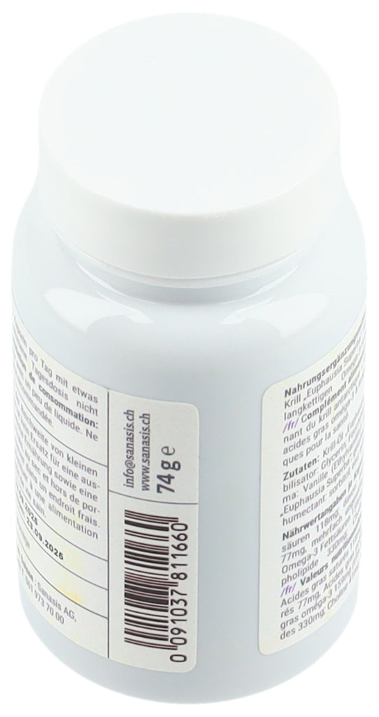 Krill-Öl „Euphausia Superba"; Rindergelatine; Stabilisator: Glycerin; Feuchthaltemittel: Sorbitol; Wasser; Aroma: Vanille (Ethylvanillin). Nährwerte pro Kapsel: Phospholipide: 330mg Astaxanthin: 50mcg.